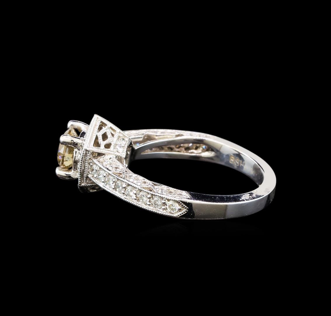 One electronically tested 18KT white gold ladies cast diamond engagement ring with a bright polish finish. Identified with markings of "18K". Condition is new. Containing: One prong set round brilliant cut diamond, measuring 5.50 - 5.50 x 3.30mm (depth est.) approximate weight of 0.61ct. Clarity: I-2, Cut is Good. Seventy-Six prong set round brilliant cut diamonds, measuring 1.70 - 1.20 x 0.87mm (depth est.) approximate total weight of 76 Stones = 0.84ct. Clarity: SI-2 to I-1. Color: H - I, Cut is Good. All diamonds are graded in the mounting, unless otherwise stated. Total Weight of Diamonds 1.45ct. Total Weight of Engagement Ring 5.80 grams. GGL Appraised.