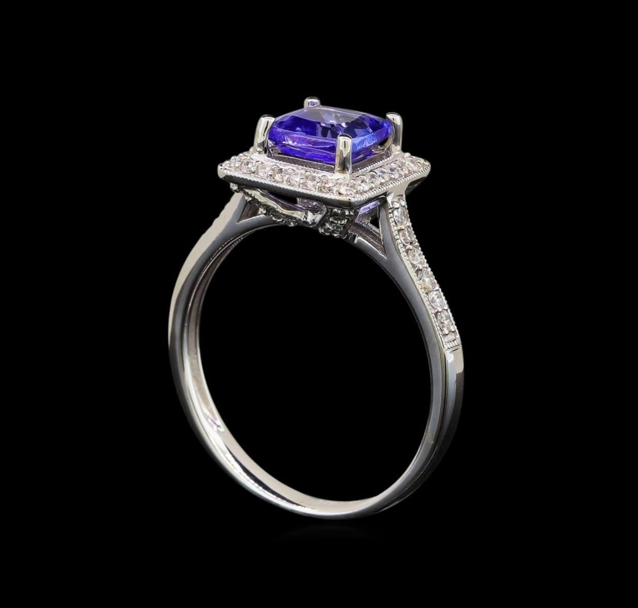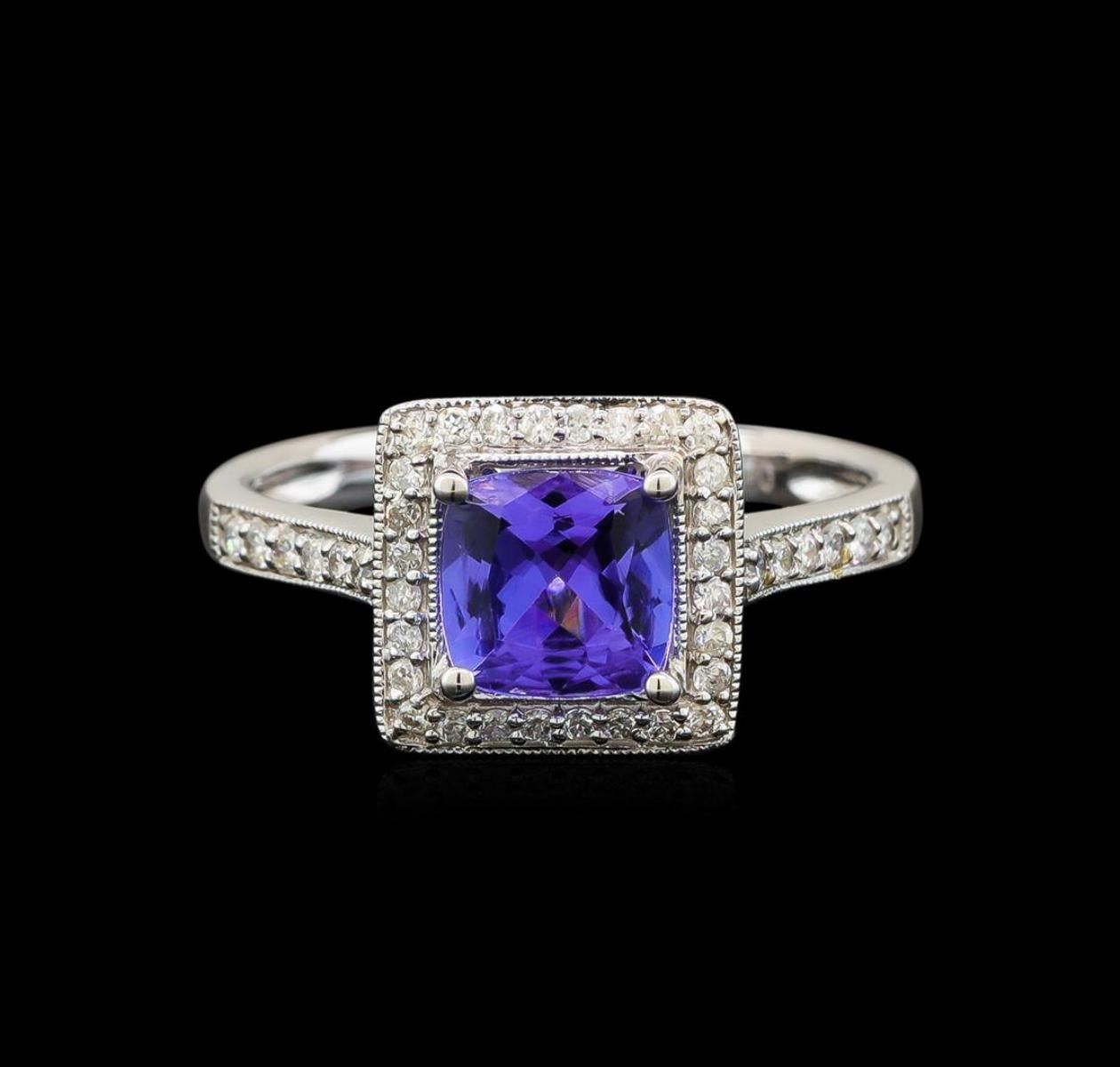 One electronically tested 18KT white gold ladies cast tanzanite and diamond ring with a flat shank with rounded edges with a bright polish finish. Trademark is Orianne. Identified with markings of "18K". Condition is new. Containing: One prong set square cushion modified brilliant cut natural tanzanite, measuring 6.25 x 6.22 x 4.96mm, approximate weight of 1.52ct., clarity is eye clean, type I, medium light, slightly grayish, violet color, (GIA V 4/2), cut is good. Fifty-Two prong set round brilliant cut diamonds, measuring 1.30 - 1.30 x 0.78mm (depth est.) approximate total weight of 52 Stones = 0.42ct. Clarity: SI-1 to I-1. Color: I - J. All diamonds and colored gemstones are graded in the mounting, unless otherwise stated. Colored gemstones are presumed to have been subjected to commonly used enhancement processes. Total Weight of Colored Stones 1.52ct. Total Weight of Diamonds 0.42ct. Total Weight of Ring 3.40 grams. GGL Appraised.