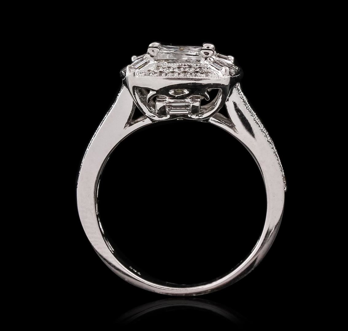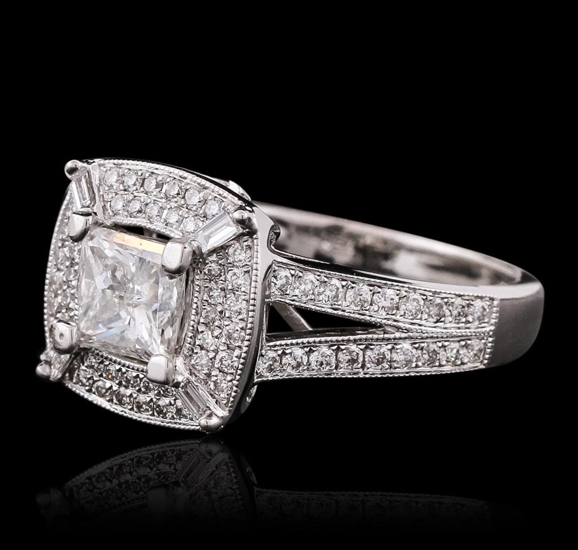 One electronically tested 18KT white gold ladies combination cast & assembled diamond engagement ring with a bright polish finish. Identified with markings of "18K". Condition is new. Containing: One prong set princess cut diamond, measuring 5.30 x 5.20 x 3.90mm (depth est.) approximate weight of 0.88ct. Clarity: I-2. Color: I, Cut is Good. Eighty-Five prong set round brilliant cut diamonds, measuring 1.30 - 1.30 x 0.78mm (depth est.) approximate total weight of 85 Stones = 0.68ct. Clarity: SI-1 to SI-2. Color: H - I, Cut is Good. All diamonds are graded in the mounting, unless otherwise stated. Total Weight of Diamonds 1.56ct. Total Weight of Engagement Ring 6.40 grams. GGL Appraised.