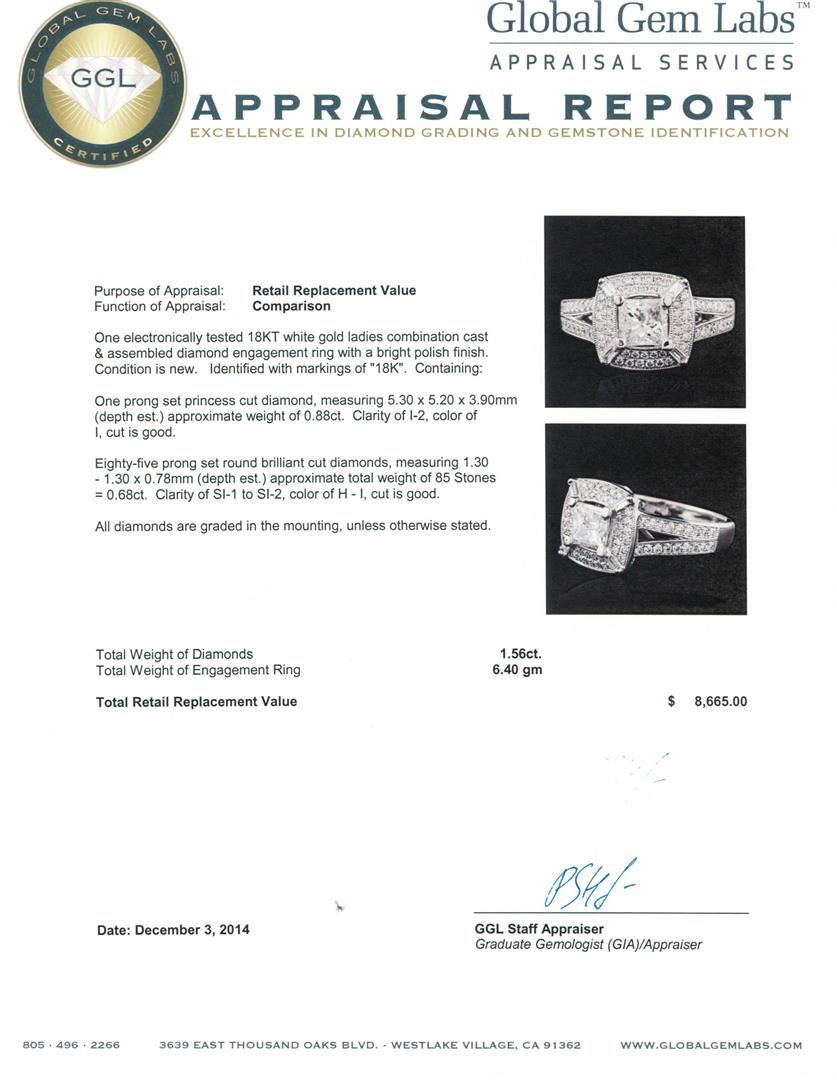 One electronically tested 18KT white gold ladies combination cast & assembled diamond engagement ring with a bright polish finish. Identified with markings of "18K". Condition is new. Containing: One prong set princess cut diamond, measuring 5.30 x 5.20 x 3.90mm (depth est.) approximate weight of 0.88ct. Clarity: I-2. Color: I, Cut is Good. Eighty-Five prong set round brilliant cut diamonds, measuring 1.30 - 1.30 x 0.78mm (depth est.) approximate total weight of 85 Stones = 0.68ct. Clarity: SI-1 to SI-2. Color: H - I, Cut is Good. All diamonds are graded in the mounting, unless otherwise stated. Total Weight of Diamonds 1.56ct. Total Weight of Engagement Ring 6.40 grams. GGL Appraised.
