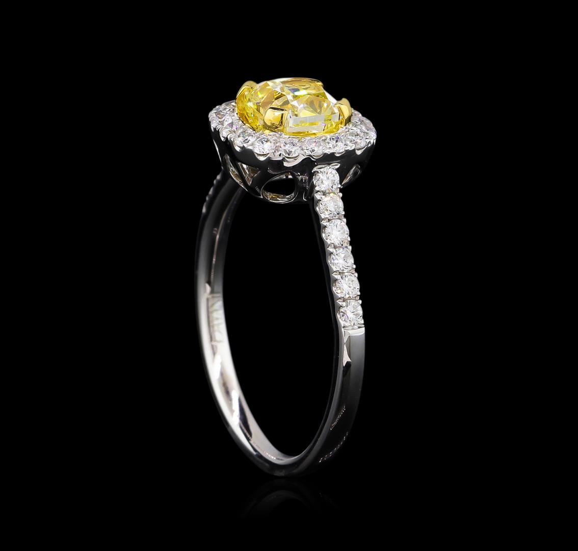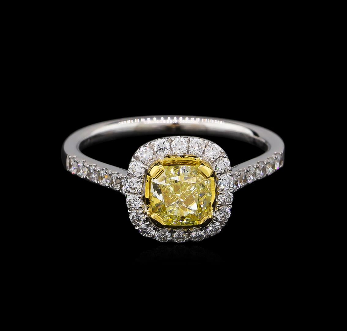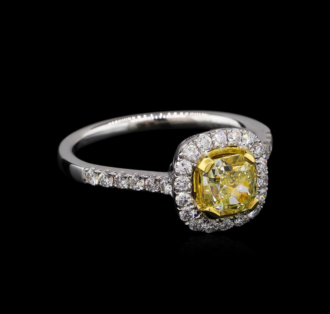 One electronically tested 18KT white gold ladies cast diamond ring with a bright polish finish. Condition is new, good workmanship. The featured diamond is mounted in a yellow gold accented basket, set within a diamond bezel supported by diamond set shoulders and completed by a two millimeter wide band. Trademark is DAYANII. Identified with markings of "18K 750". Containing: One prong set cushion cut diamond, measuring 5.35 x 5.40 x 3.35mm (depth est.), 8.00% GRCF approximate weight of 1.05ct with a strong blue fluorescence. Graded in the setting. Clarity VS-2 Color Light Yellow Depth 62.0% Table 57.4% Thirty prong set round brilliant cut diamonds, measuring 1.60 - 1.50 x 0.93mm (depth est.) approximate total weight of 30 Stones = 0.51ct. Graded in the setting. Clarity SI-1 to I-1 Color F -H Total Weight of Diamonds 1.56ct. Total Weight of Ring 3.50 grams. AIG appraised at $11,110.00. AIG Appraised at $11,110.00.