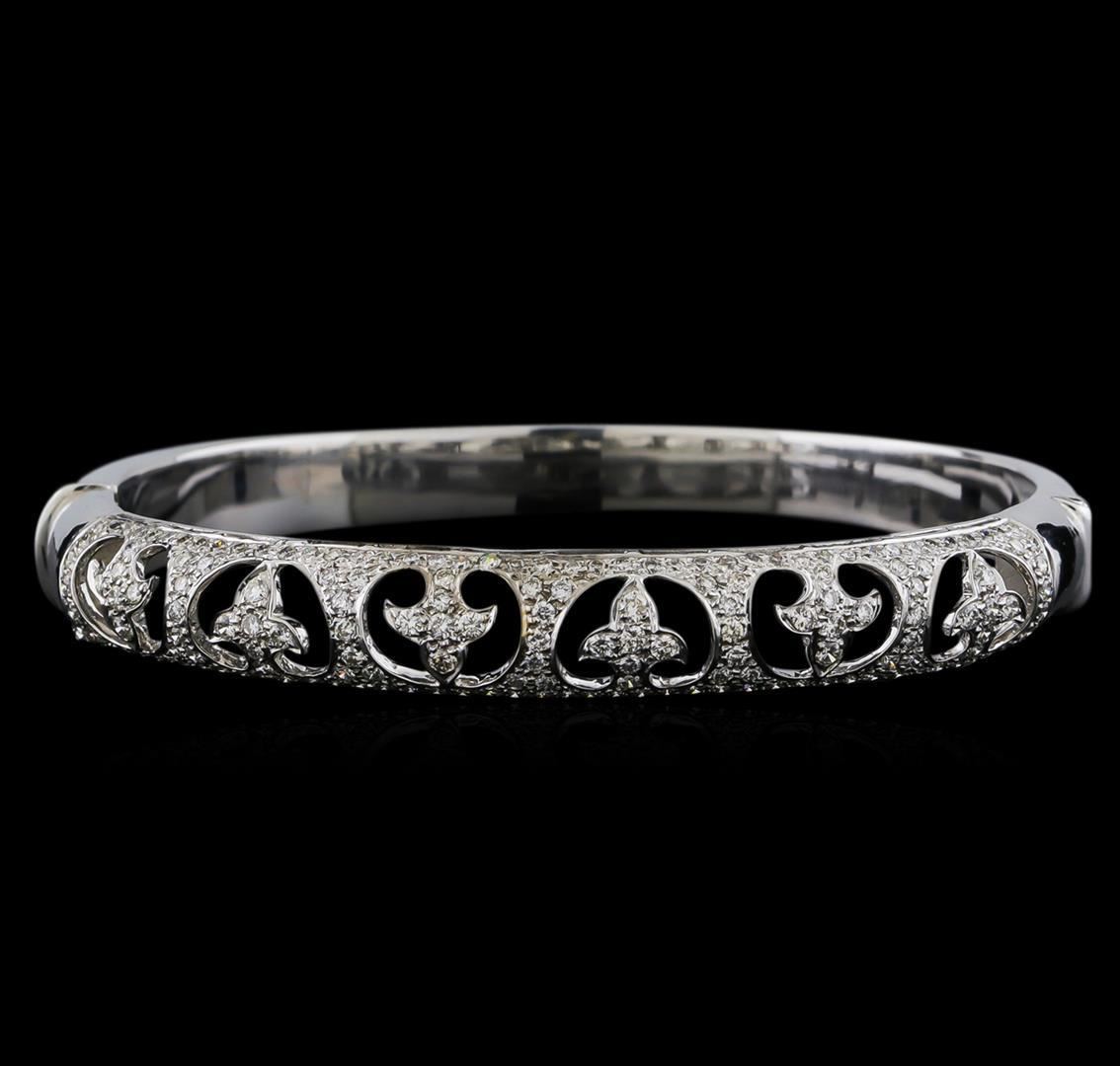 One electronically tested 18KT white gold ladies cast bangle bracelet with a bright polish finish. Measurements: 2.5" x 2.2". Condition is new. Containing: One Hundred Sixty-Seven prong set round brilliant cut diamonds, measuring 1.40 - 1.40 x 0.84mm (depth est.) approximate total weight of 167 Stones = 1.67ct. Clarity: SI-1 to SI-2. Color: J - K, Cut is Good. All diamonds are graded in the mounting, unless otherwise stated. Total Weight of Diamonds 1.67ct. Total Weight of Bracelet 25.00 grams. GGL Appraised.