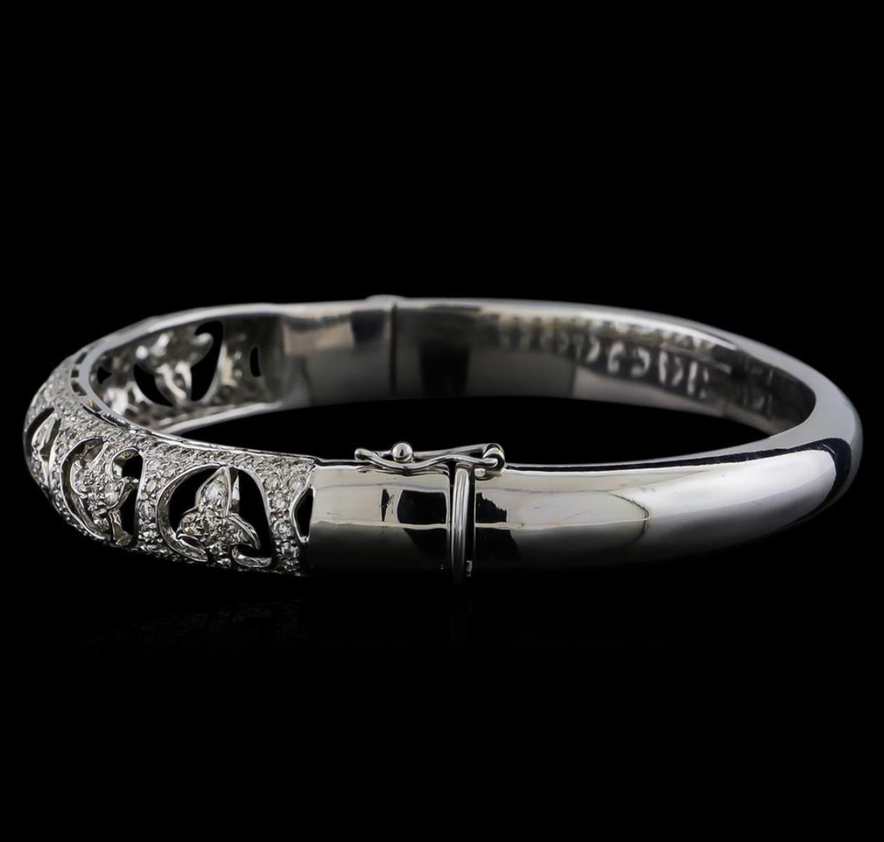 One electronically tested 18KT white gold ladies cast bangle bracelet with a bright polish finish. Measurements: 2.5" x 2.2". Condition is new. Containing: One Hundred Sixty-Seven prong set round brilliant cut diamonds, measuring 1.40 - 1.40 x 0.84mm (depth est.) approximate total weight of 167 Stones = 1.67ct. Clarity: SI-1 to SI-2. Color: J - K, Cut is Good. All diamonds are graded in the mounting, unless otherwise stated. Total Weight of Diamonds 1.67ct. Total Weight of Bracelet 25.00 grams. GGL Appraised.