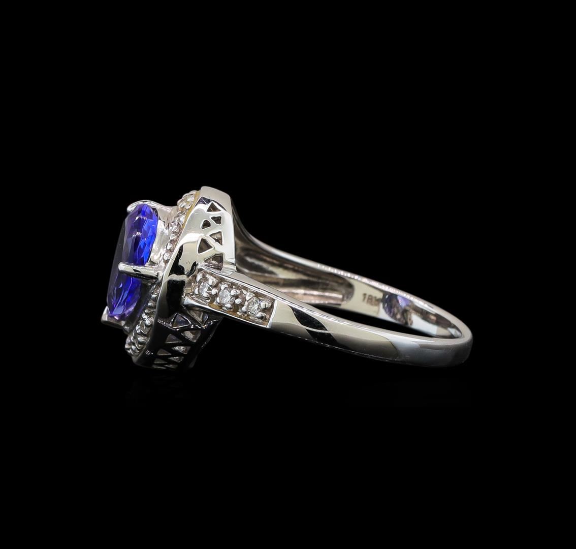 One electronically tested 18KT white gold ladies cast tanzanite and diamond ring with a bright polish finish. Identified with markings of "18K". Condition is new. Containing: One prong set pear modified brilliant cut natural tanzanite, measuring 10.30 x 6.20 x 4.03mm, approximate weight of 1.72ct., clarity is eye clean, type I, medium light, very slightly grayish, violet color, (GIA V 4/3), cut is good. Sixteen prong set single cut diamonds, measuring 1.50 - 1.20 x 0.81mm (depth est.) approximate total weight of 16 Stones = 0.14ct. Clarity: I-1 to I-2. Color: I - J. Colored gemstones are presumed to have been subjected to commonly used enhancement processes. All diamonds and colored gemstones are graded in the mounting, unless otherwise stated. Total Weight of Colored Stones 1.72ct. Total Weight of Diamonds 0.14ct. Total Weight of Ring 5.50 grams. GGL Appraised.