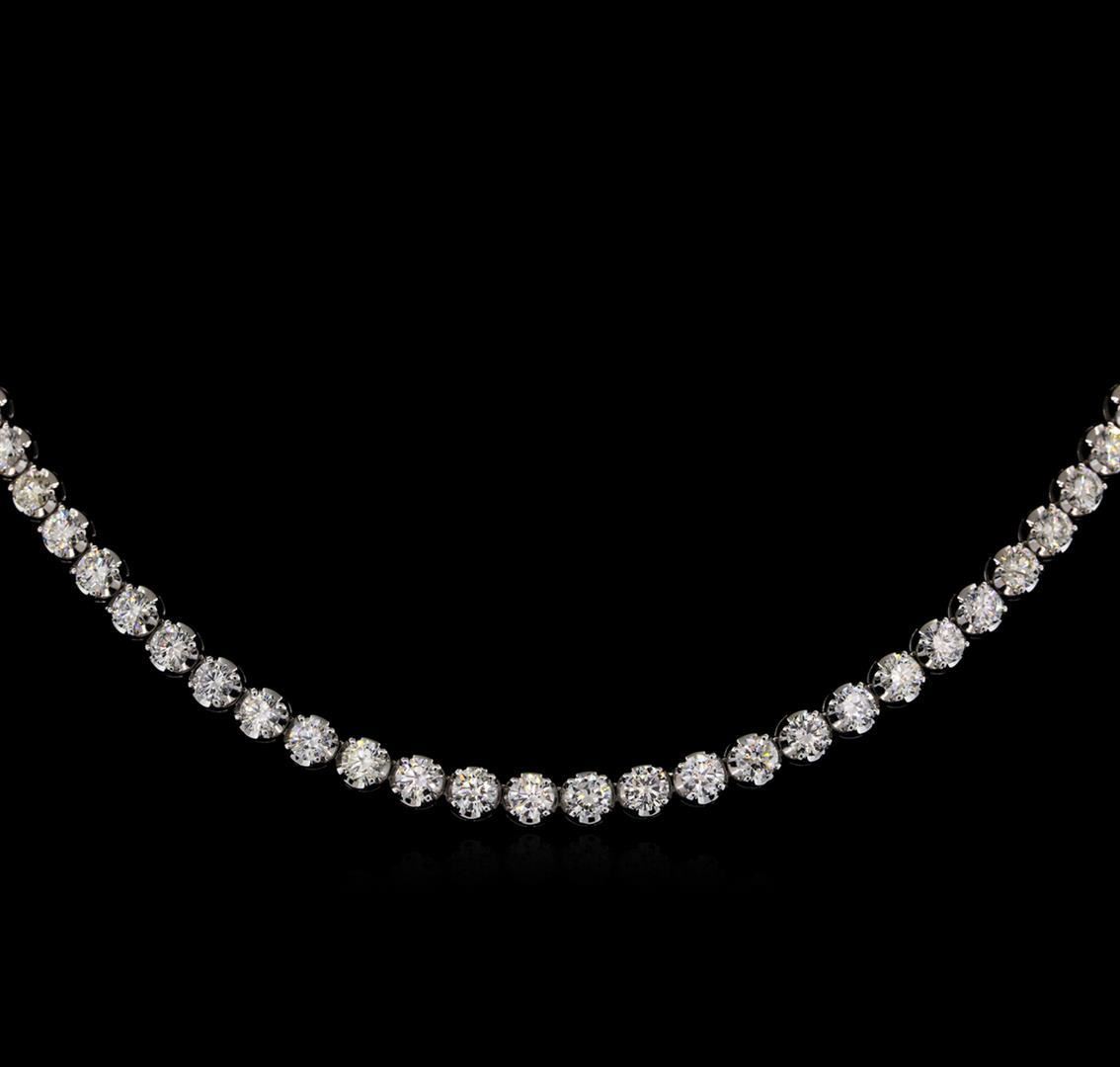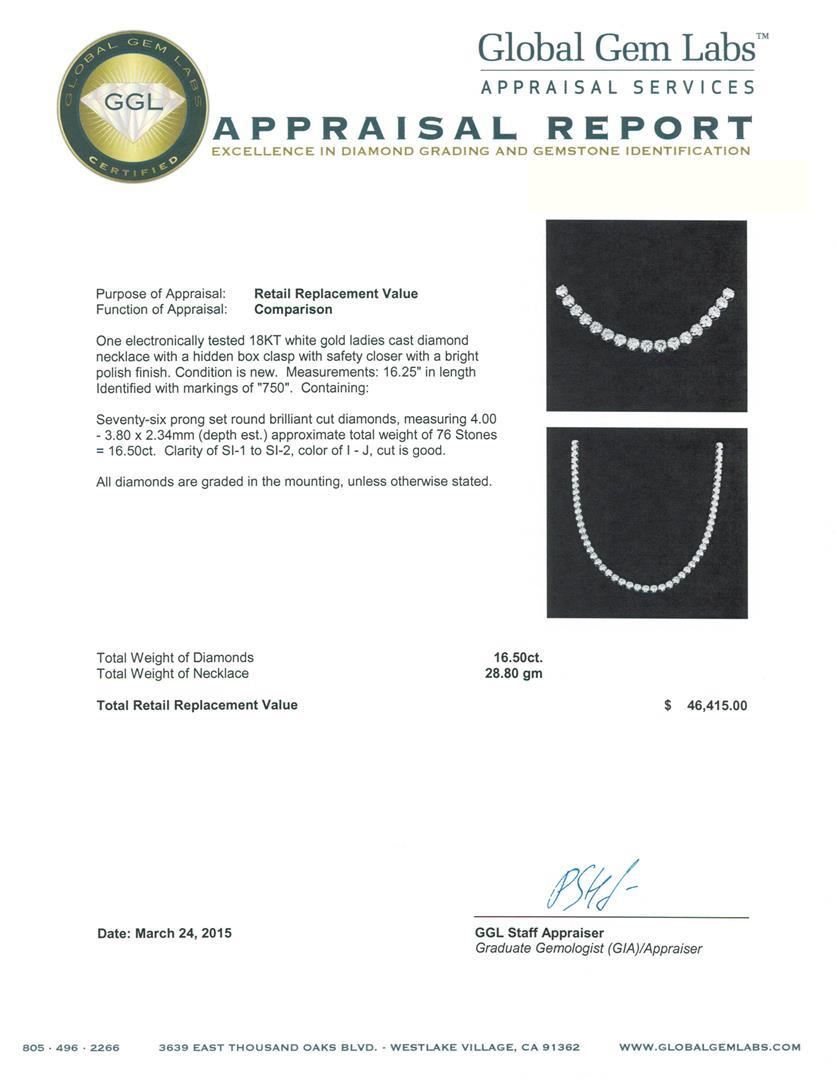One electronically tested 18KT white gold ladies cast diamond necklace with a hidden box clasp with safety closer with a bright polish finish. Measurements: 16.25" in length Identified with markings of "750". Condition is new. Containing: Seventy-Six prong set round brilliant cut diamonds, measuring 4.00 - 3.80 x 2.34mm (depth est.) approximate total weight of 76 Stones = 16.50 ct. Clarity: SI-1 to SI-2. Color: I - J, Cut is Good. All diamonds are graded in the mounting, unless otherwise stated. Total Weight of Diamonds 16.50 ct. Total Weight of Necklace 28.80 grams. GGL Appraised.