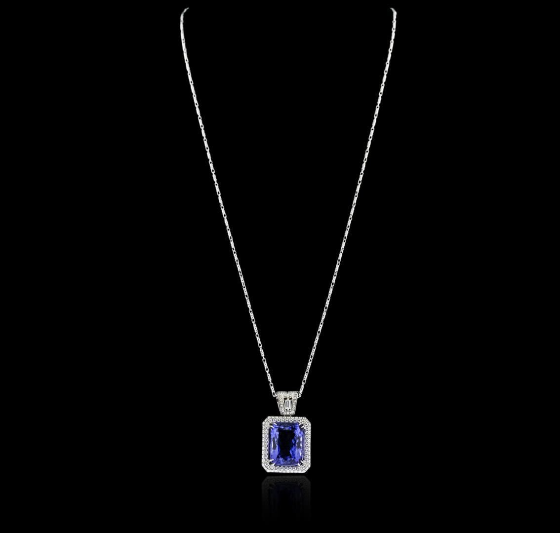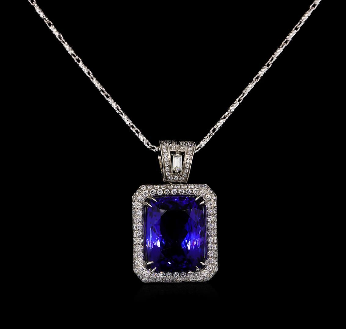 GIA CERTIFIED. One electronically tested 18KT white gold ladies cast & assembled tanzanite and diamond pendant with chain. The pendant features a tanzanite set within a tiered diamond bezel supported by a diamond accented latice under gallery, completed by a diamond set bail. The pendant is supported by an eighteen inch length 14KT white gold designer style chain, terminating in a lobster claw clasp. Bright polish finish with milgrain detailing. Identified with markings of "18K". Condition is new, good workmanship. Containing: One prong set cushion modified brilliant cut natural tanzanite, measuring 16.43 x 12.72 x 8.67mm, exact weight 16.95ct., clarity is eye clean, type I, dark, moderately strong, violetish blue color, (GIA vB 7/4), cut is good. Transmitting light with no distortion, transparent. GIA Gemological Report attached. Graded loose prior to setting in the GIA Laboratory, Report #2151951660.Tanzanite is a very rare gemstone that is only found in the country of Tanzania. Originally discovered in 1967. Tiffany & Company, named the stone Tanzanite. It is found in the Usumburu Mountains that border the Umba Valley of northern Tanzania. Tanzanite occurs in gray, brown, violet, blue, reddish-purple, & green. The gem is interesting because of its exceptional pleochroism. Rotated in different directions a tanzanite will exhibit multiple changes of color. Tanzanite has a low tolerance to ultrasonic cleaning, and should not be cleaned using this method. Eighty-Six prong set round brilliant cut diamonds, measuring 1.50 - 1.40 x 0.87mm (depth est.) approximate total weight of 86 Stones = 1.05ct. Graded in the setting. Clarity: VS-2 to SI-1. Color: G - I Forty-Five prong set round brilliant cut diamonds, measuring 1.10 - 1.00 x 0.63mm (depth est.) approximate total weight of 45 Stones = 0.20ct. Graded in the setting. Clarity: VS-2 to SI-1. Color: G - I One prong set baguette cut diamond, measuring 3.40 x 2.00 x 1.40mm (depth est.) approximate weight of 0.08ct. Graded in the setting. Clarity: SI-1. Color: G. Total Weight of Colored Stones 16.95ct. Total Weight of Diamonds 1.33ct. Total Weight of Pendant With Chain 16.59 grams. AIG Appraised.