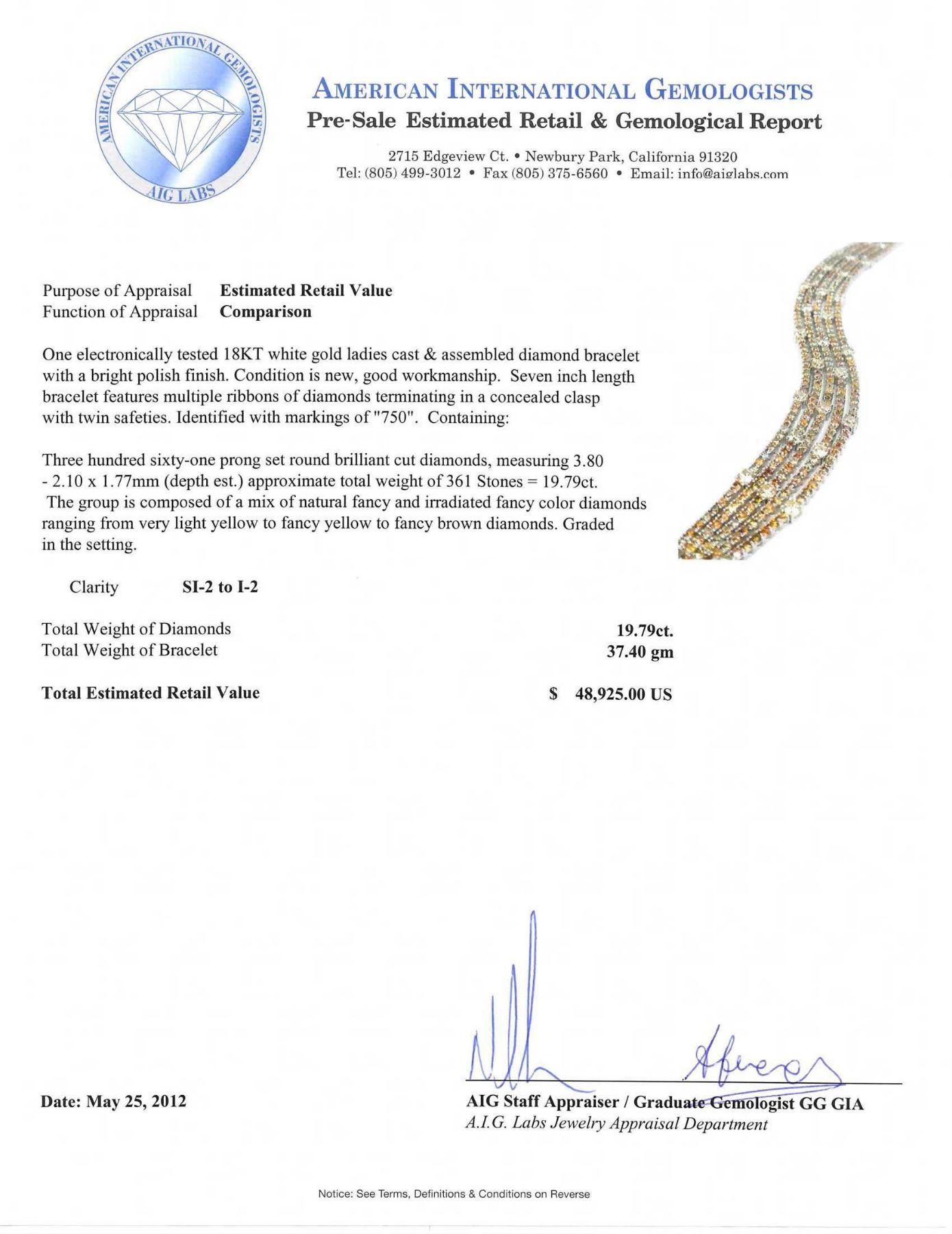 One electronically tested 18KT white gold ladies cast & assembled diamond bracelet with a bright polish finish. Condition is new, good workmanship. Seven inch length bracelet features multiple ribbons of diamonds terminating in a concealed clasp with twin safeties. Identified with markings of "750". Containing: Three hundred sixty-one prong set round brilliant cut diamonds, measuring 3.80 - 2.10 x 1.77mm (depth est.) approximate total weight of 361 Stones = 19.79ct. The group is composed of a mix of natural fancy and irradiated fancy color diamonds ranging from very light yellow to fancy yellow to fancy brown diamonds. Graded in the setting. Clarity SI-2 to I-2. Total Weight of Diamonds: 19.79ct. Total Weight of Bracelet: 37.40gm. US! AIG Appraised at $48,925.00.
