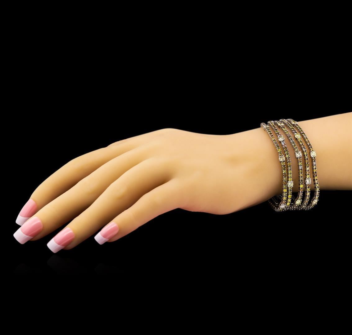 One electronically tested 18KT white gold ladies cast & assembled diamond bracelet with a bright polish finish. Condition is new, good workmanship. Seven inch length bracelet features multiple ribbons of diamonds terminating in a concealed clasp with twin safeties. Identified with markings of "750". Containing: Three hundred sixty-one prong set round brilliant cut diamonds, measuring 3.80 - 2.10 x 1.77mm (depth est.) approximate total weight of 361 Stones = 19.79ct. The group is composed of a mix of natural fancy and irradiated fancy color diamonds ranging from very light yellow to fancy yellow to fancy brown diamonds. Graded in the setting. Clarity SI-2 to I-2. Total Weight of Diamonds: 19.79ct. Total Weight of Bracelet: 37.40gm. US! AIG Appraised.