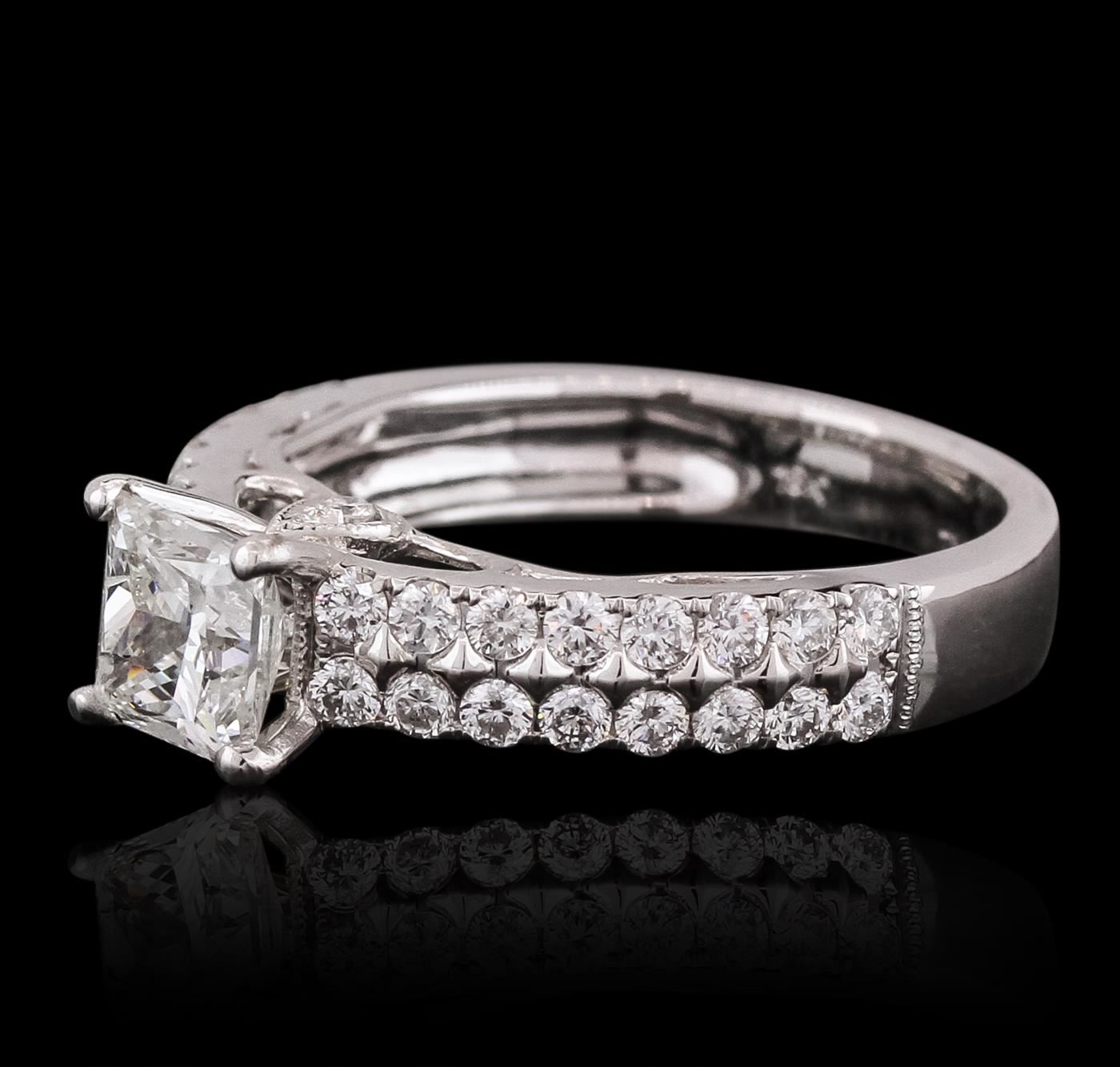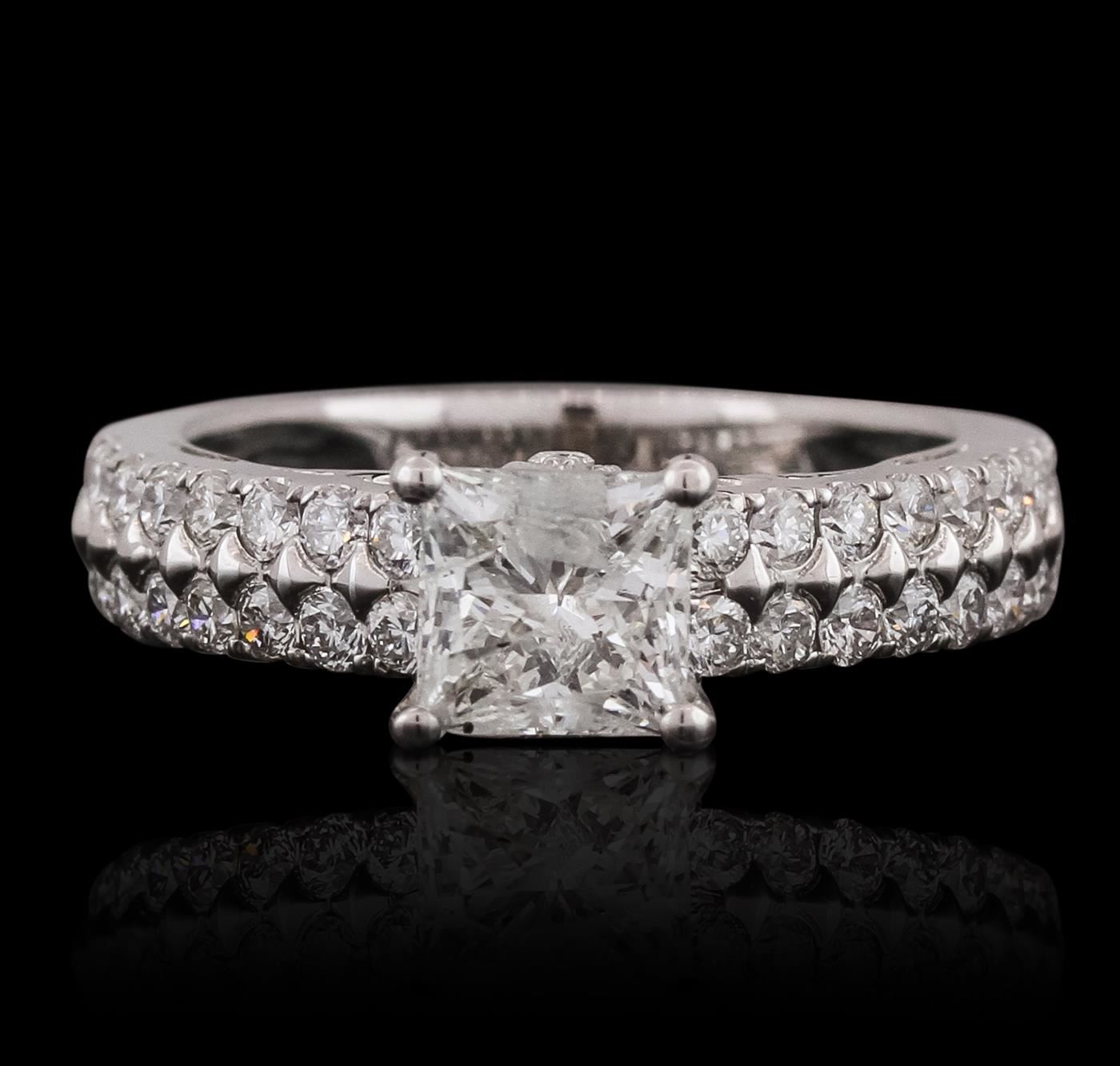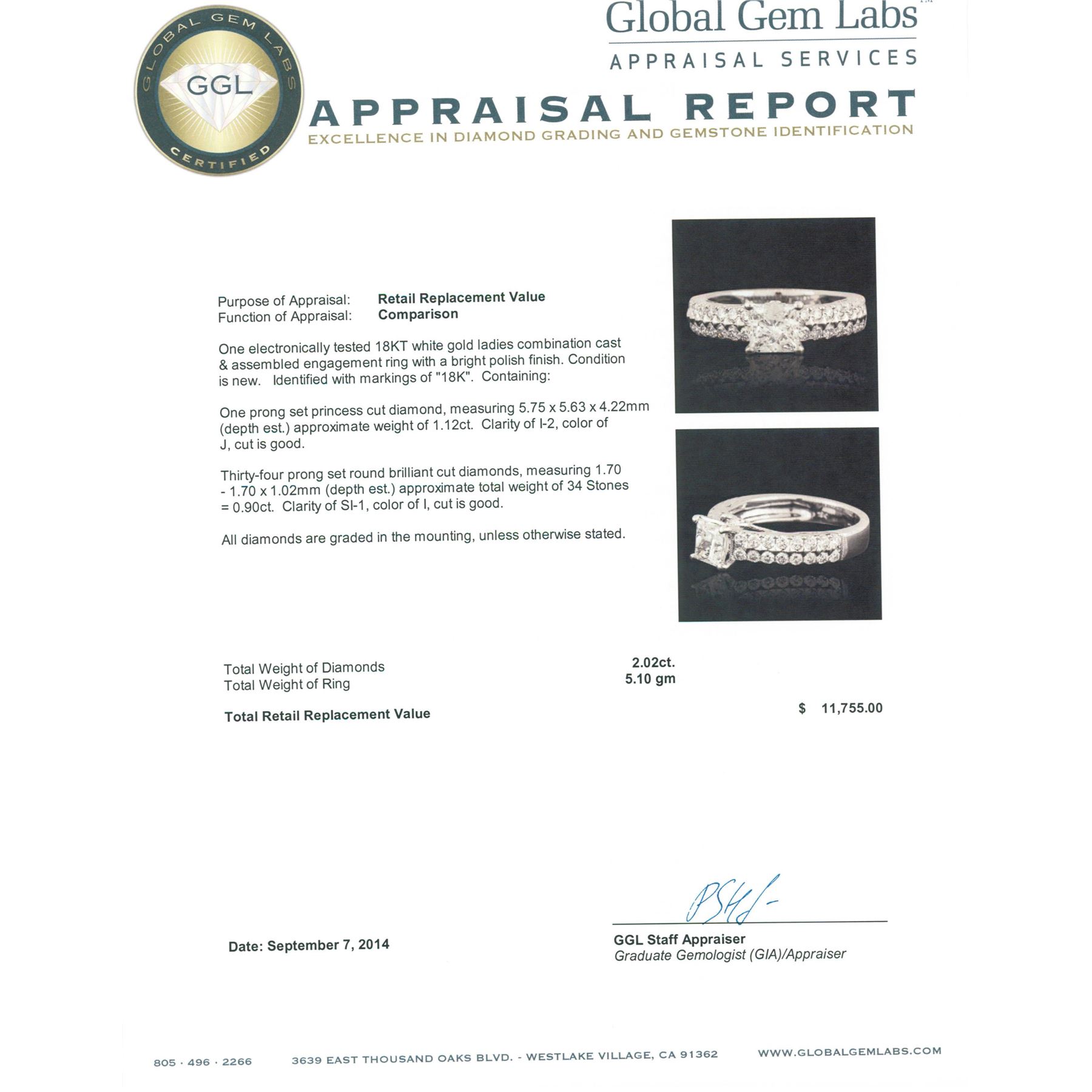 One electronically tested 18KT white gold ladies combination cast & assembled engagement ring with a bright polish finish. Identified with markings of "18K". Condition is new. Containing: One prong set princess cut diamond, measuring 5.75 x 5.63 x 4.22mm (depth est.) approximate weight of 1.12ct. Clarity: I-2. Color: J, Cut is Good. Thirty-Four prong set round brilliant cut diamonds, measuring 1.70 - 1.70 x 1.02mm (depth est.) approximate total weight of 34 Stones = 0.90 ct. Clarity: SI-1. Color: I, Cut is Good. All diamonds are graded in the mounting, unless otherwise stated. Total Weight of Diamonds 2.02ct. Total Weight of Ring 5.10 grams.