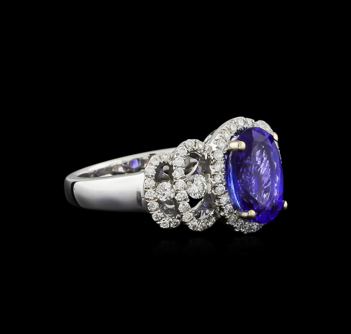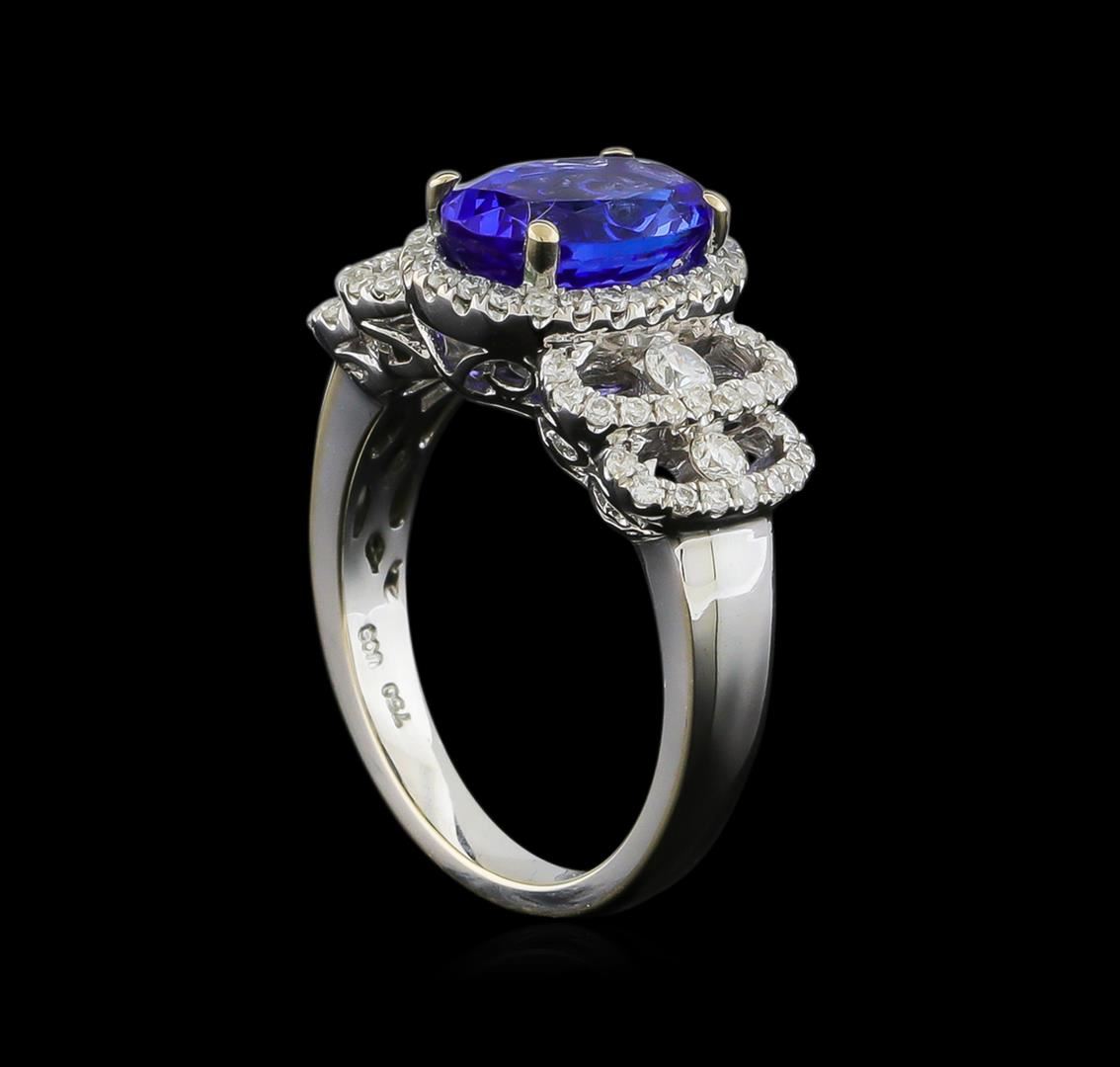 One electronically tested 18KT white gold ladies combination cast & assembled engagement ring with a bright polish finish. Identified with markings of "18K". Condition is new. Containing: One prong set oval modified brilliant cut natural tanzanite, measuring 10.12 x 6.86 x 4.46mm, approximate weight of 2.15ct., clarity is eye clean, type I, medium, moderately strong, violetish blue color, (GIA vB 5/4), cut is good. Four prong set round brilliant cut diamonds, measuring 2.50 - 2.00 x 1.35mm (depth est.) approximate total weight of 4 Stones = 0.17ct. Clarity: SI-1. Color: I - J, Cut is Good. Sixty-Nine prong set round brilliant cut diamonds, measuring 1.10 - 1.10 x 0.66mm (depth est.) approximate total weight of 69 Stones = 0.33ct. Clarity: SI-2 to I-1. Color: H - I, Cut is Good. Colored gemstones are presumed to have been subjected to commonly used enhancement processes. All diamonds and colored gemstones are graded in the mounting, unless otherwise stated. Total Weight of Colored Stones 2.15ct. Total Weight of Diamonds 0.50ct. Total Weight of Ring 7.10 grams. GGL Appraised at $8,355.00.