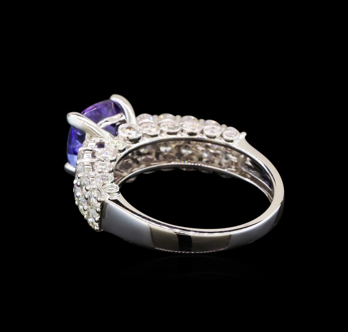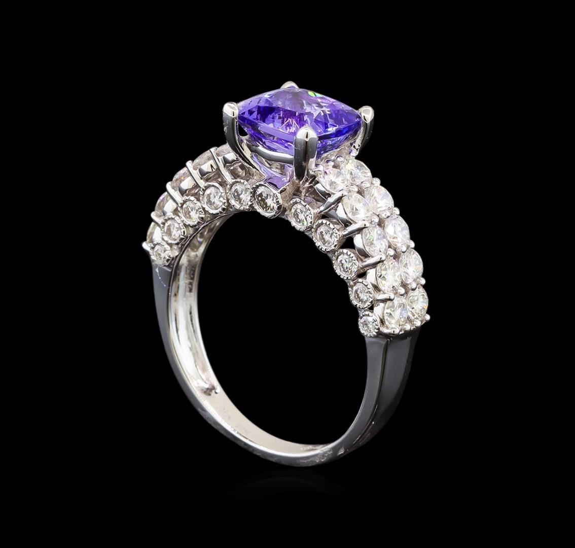 One electronically tested 18KT white gold ladies cast tanzanite and diamond ring with a bright polish finish. Identified with markings of "750". Condition is new. Containing: One prong set square modified brilliant cut natural tanzanite, measuring 7.50 x 7.50 x 4.88mm, approximate weight of 2.30ct., clarity is eye clean, type I, medium, very slightly grayish, violet color, (GIA V 5/3), cut is good. Forty-Two prong set round brilliant cut diamonds, measuring 2.50 - 1.30 x 1.14mm (depth est.) approximate total weight of 42 Stones = 1.05ct. Clarity: SI-1 to SI-2. Color: H - I, Cut is Good. Colored gemstones are presumed to have been subjected to commonly used enhancement processes. All diamonds and colored gemstones are graded in the mounting, unless otherwise stated. Total Weight of Colored Stones 2.30ct. Total Weight of Diamonds 1.05ct. Total Weight of Ring 4.50 grams. GGL Appraised.