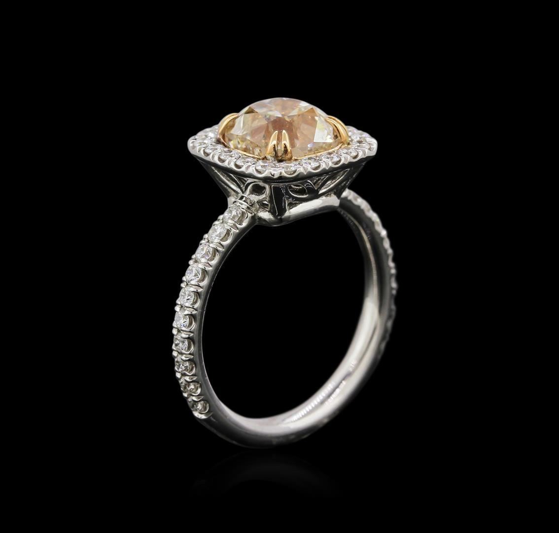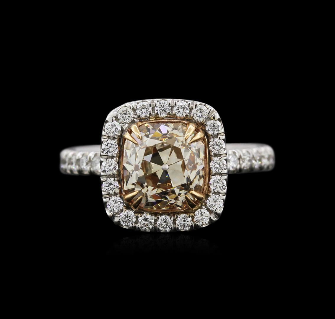 One electronically tested 18KT white gold ladies cast diamond engagement ring with a bright polish finish. Identified with markings of "750". Condition is new. Containing: One prong set old mine cut diamond, measuring 8.30 - 7.80 x 4.99mm (depth est.) approximate weight of 1.97ct. Clarity: VS-2, very light pinkish brown. Forty prong set round brilliant cut diamonds, measuring 1.50 - 1.30 x 0.84mm (depth est.) approximate total weight of 40 Stones = 0.40ct. Clarity: SI-2 to I-1. Color: H - I, Cut is Good. Diamonds are graded in the mounting, unless otherwise stated. Total Weight of Diamonds 2.37ct. Total Weight of Engagement Ring 6.20 grams. GGL Appraised.