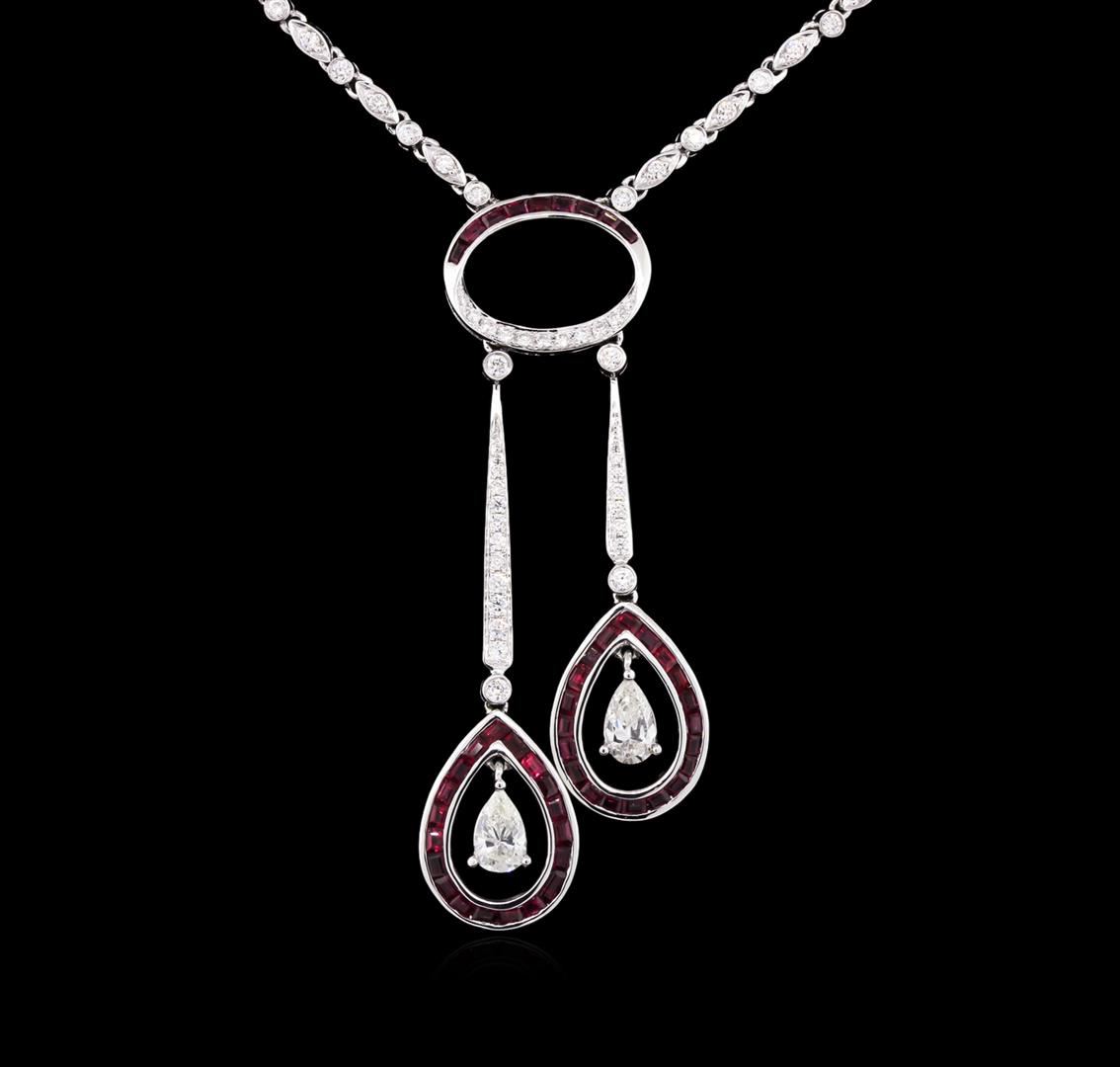 One electronically tested 18KT white gold ladies cast & assembled diamond and ruby necklace with a bright polish finish. Sixteen inch length necklace features a stylized diamond and ruby open oval pendant accented by two diamond and ruby drops supported by a flexible diamond ribbon, terminating in a concealed clasp with safety bar. Identified with markings of "18K".The necklace is reminiscent of the jewelry designs from the Art Deco Period. The Paris Exposition of Decorative Arts and Modern Manufacturers in 1925 gave the movement its name. The Art Deco Period is characterized with jewelry designs composed of bold geometric designs, & cubism. Condition is new, good workmanship. Containing: Two prong set pear shaped cut diamonds, measuring 6.50 x 4.00 x 2.60mm (depth est.) approximate total weight of 2 Stones = 0.89ct. Graded in the setting. Clarity: SI-1 to SI-2. Color: G - H One Hundred Forty-Six prong and bezel set round brilliant cut diamonds, measuring 1.70 - 1.40 x 0.93mm (depth est.) approximate total weight of 146 Stones = 2.08ct. Graded in the setting. Clarity: VVS-1 to VS-1. Color: F - H Forty-eight channel set baguette step cut natural rubies, measuring 2.50 x 2.10 x 0.90mm, approximate total weight of 2.50ct., clarity is slightly included, type II, dark, very slightly brownish, slightly purplish red color, (GIA slpR 7/3), cut is good. Transmitting light with a minimum of distortion, transparent. Naturally occurring internal & external characteristics are present. Color grade is an average for the group. Measurements & the color grade are an average for the group. Graded in the setting. Total Weight of Colored Stones 2.50ct. Total Weight of Diamonds 2.97ct. Total Weight of Necklace 21.40 grams. AIG Appraised at $20,960.00.