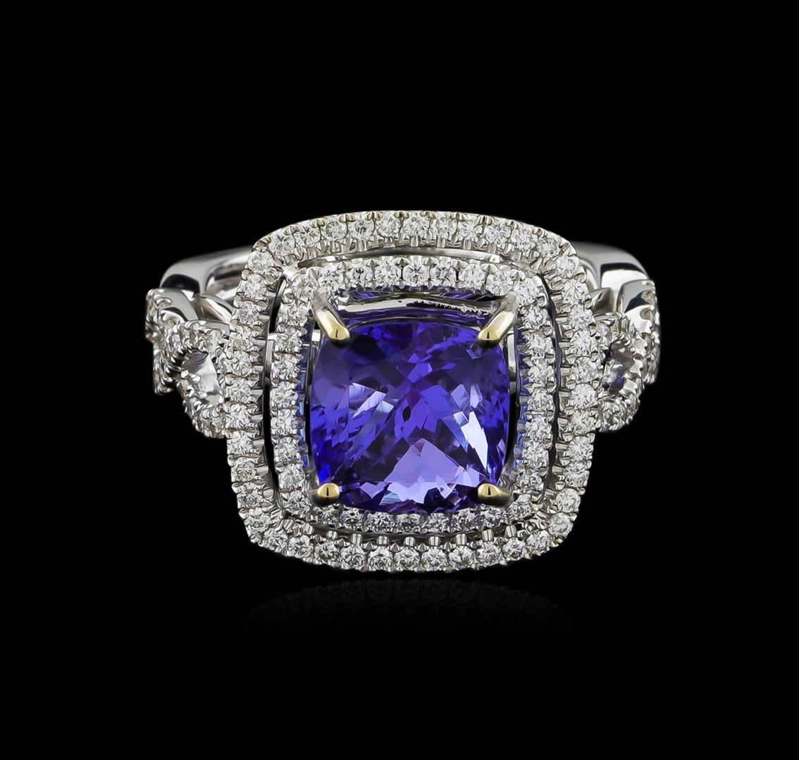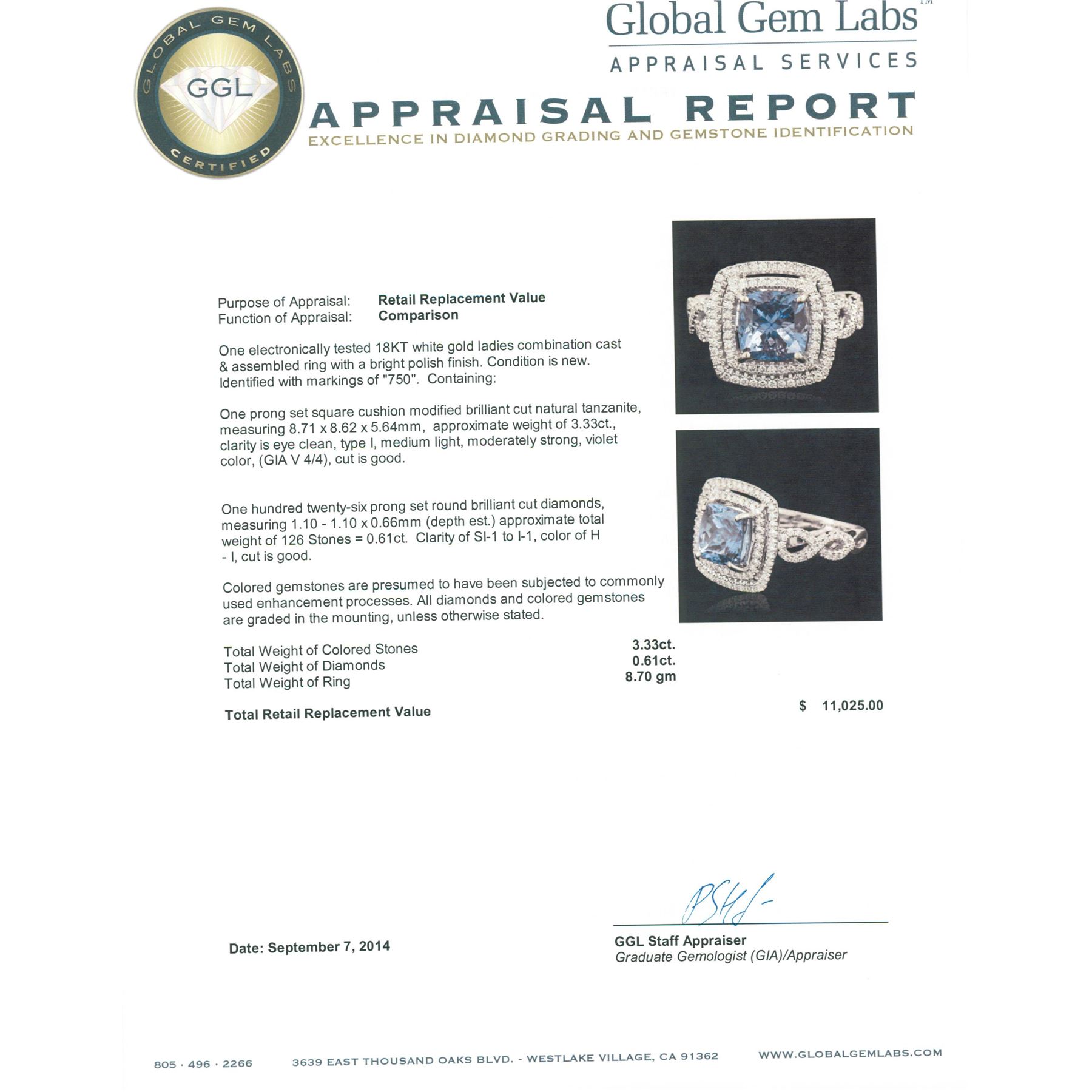 One electronically tested 18KT white gold ladies combination cast & assembled ring with a bright polish finish. Identified with markings of "750". Condition is new. Containing: One prong set square cushion modified brilliant cut natural tanzanite, measuring 8.71 x 8.62 x 5.64mm, approximate weight of 3.33ct., clarity is eye clean, type I, medium light, moderately strong, violet color, (GIA V 4/4), cut is good. One Hundred Twenty-Six prong set round brilliant cut diamonds, measuring 1.10 - 1.10 x 0.66mm (depth est.) approximate total weight of 126 Stones = 0.61ct. Clarity: SI-1 to I-1. Color: H - I, Cut is Good. Colored gemstones are presumed to have been subjected to commonly used enhancement processes. All diamonds and colored gemstones are graded in the mounting, unless otherwise stated. Total Weight of Colored Stones 3.33ct. Total Weight of Diamonds 0.61ct. Total Weight of Ring 8.70 grams. GGL Appraised at $11,025.00.