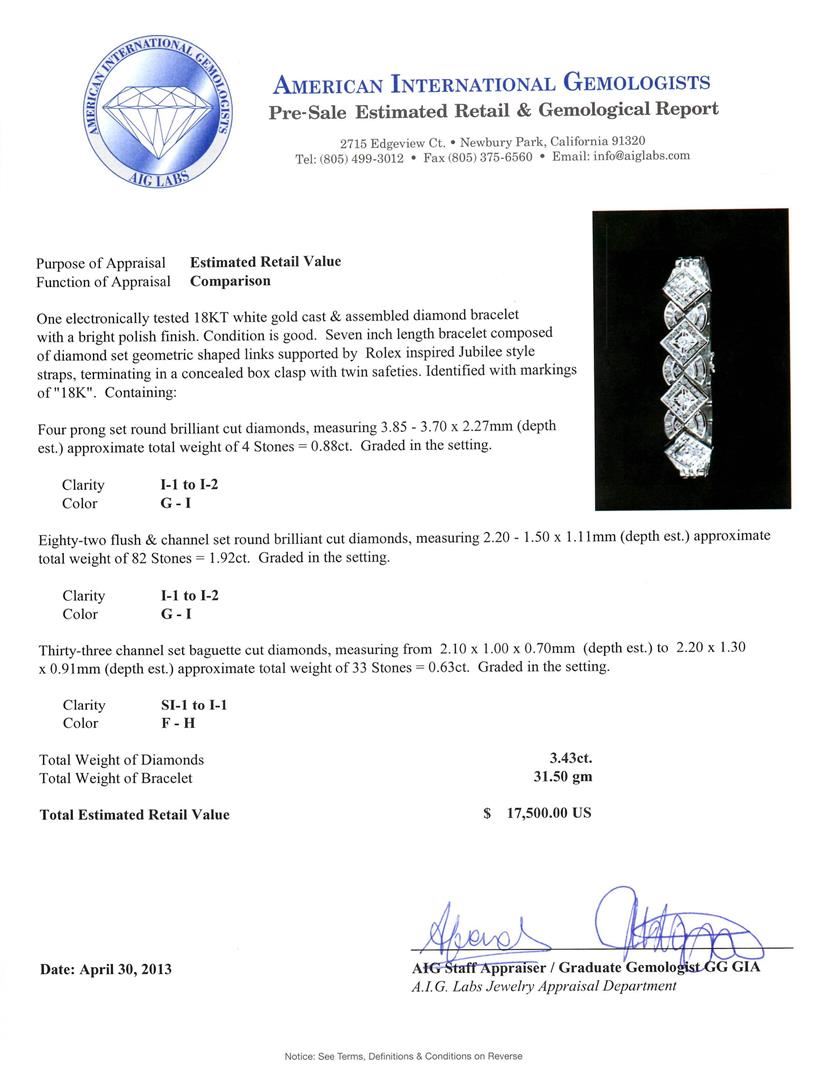 One electronically tested 18KT white gold cast & assembled diamond bracelet with a bright polish finish. Condition is good. Seven inch length bracelet composed of diamond set geometric shaped links supported by Rolex inspired Jubilee style straps, terminating in a concealed box clasp with twin safeties. Identified with markings of "18K". Containing: Four prong set round brilliant cut diamonds, measuring 3.85 -- 3.70 x 2.27mm (depth est.) approximate total weight of 4 Stones = 0.88ct. Graded in the setting. Clarity I-1 to I-2. Color G -- I. Eight-two flush & channel set round brilliant cut diamonds, measuring 2.20 -- 1.50 x 1.11mm (depth est.) approximate total weight of 82 Stones = 1.92ct. Graded in the setting. Clarity I-1 to I-2. Color G -- I. Thirty-three set baguette cut diamonds, measuring from 2.10 x 1.00 x 0.70mm (depth est.) to 2.20 x 1.30 x 0.91mm (depth est.) approximate total weight of 33 Stones = 0.63ct. Graded in the setting. Clarity SI-1 to I-1. Color F -- H. Total Weight of Diamonds 3.43ct. Total Weight of Bracelet 31.50 gm. AIG Appraised.