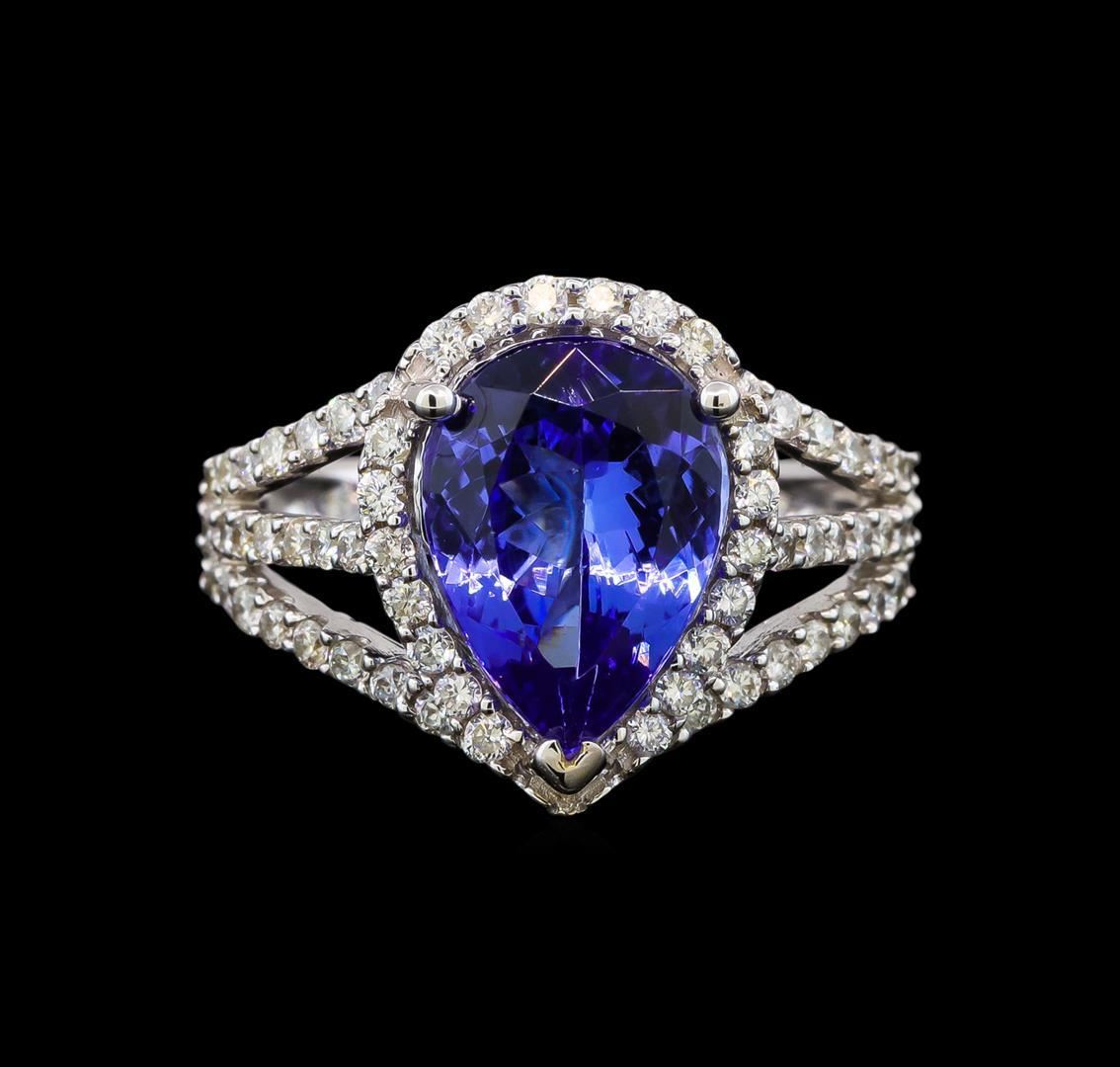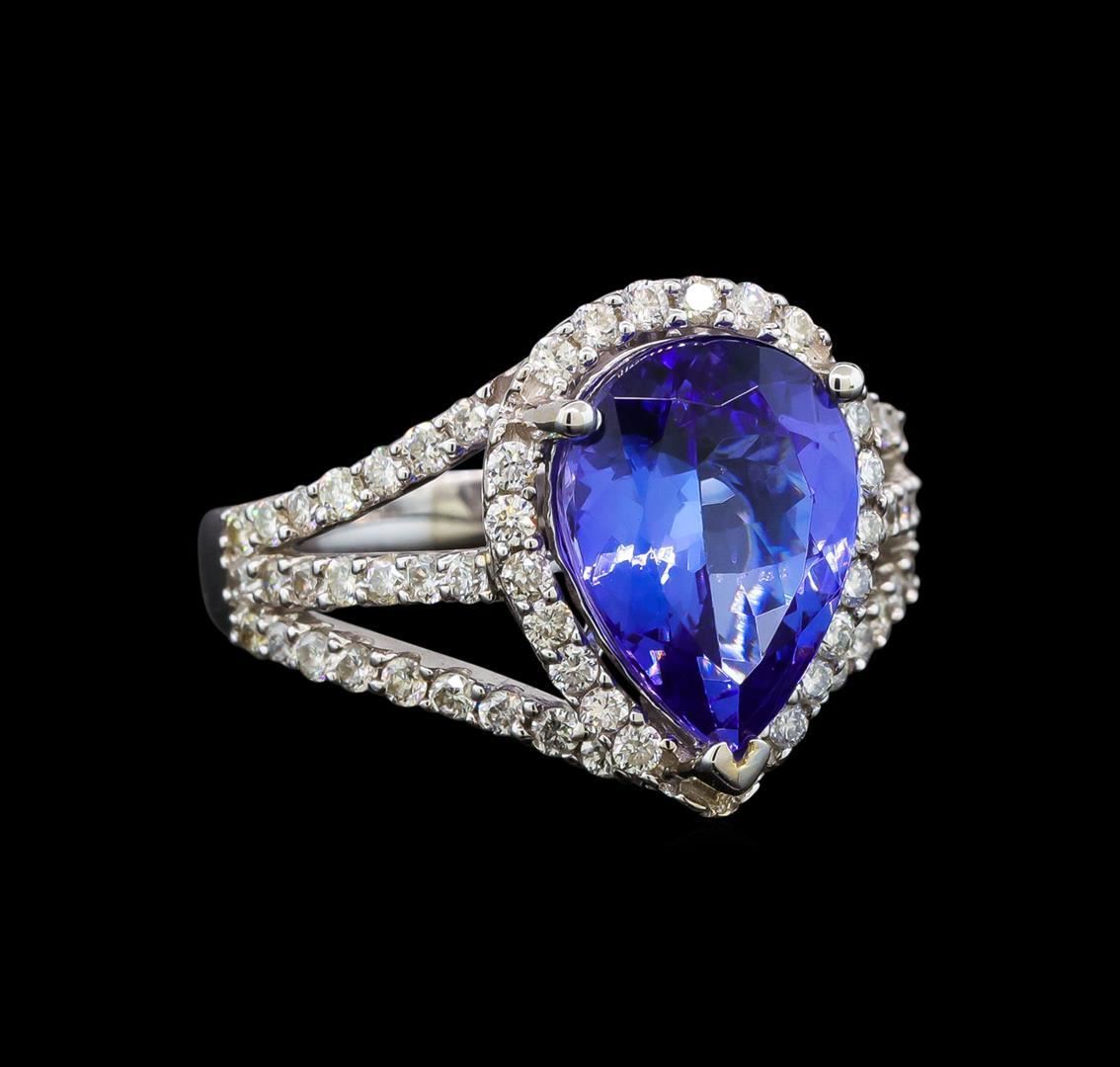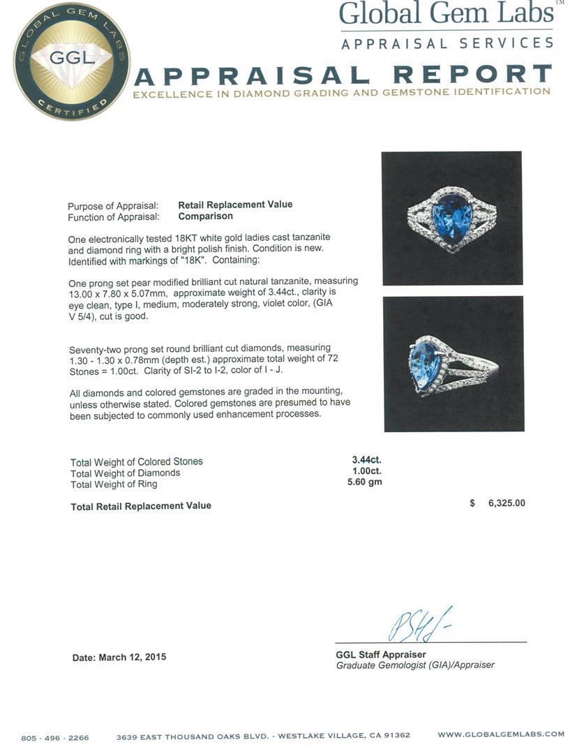 One electronically tested 18KT white gold ladies cast tanzanite and diamond ring with a bright polish finish. Identified with markings of "18K". Condition is new. Containing: One prong set pear modified brilliant cut natural tanzanite, measuring 13.00 x 7.80 x 5.07mm, approximate weight of 3.44ct., clarity is eye clean, type I, medium, moderately strong, violet color, (GIA V 5/4), cut is good. Seventy-Two prong set round brilliant cut diamonds, measuring 1.30 - 1.30 x 0.78mm (depth est.) approximate total weight of 72 Stones = 1.00ct. Clarity: SI-2 to I-2. Color: I - J. All diamonds and colored gemstones are graded in the mounting, unless otherwise stated. Colored gemstones are presumed to have been subjected to commonly used enhancement processes. Total Weight of Colored Stones 3.44ct. Total Weight of Diamonds 1.00ct. Total Weight of Ring 5.60 grams. GGL Appraised.