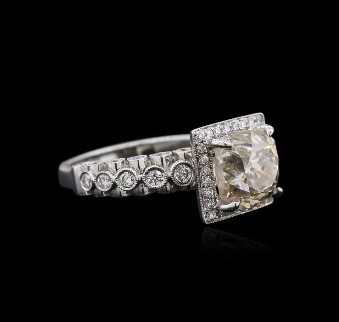 One electronically tested 18KT white gold ladies cast diamond engagement ring with a bright polish finish. Identified with markings of "18K". Condition is new. Containing: One prong set old mine cut diamond, measuring 8.25 - 8.25 x 7.50mm (depth est.) approximate weight of 3.11ct. Clarity: SI-1. Color: L. Sixty-Four bezel set round brilliant cut diamonds, measuring 1.50 - 1.00 x 0.75mm (depth est.) approximate total weight of 64 Stones = 0.45ct. Clarity: SI-2 to I-1. Color: I - J, Cut is Good. Diamonds are graded in the mounting, unless otherwise stated. Total Weight of Diamonds 3.57ct. Total Weight of Engagement Ring 5.70 grams. GGL Appraised at $29,715.00.