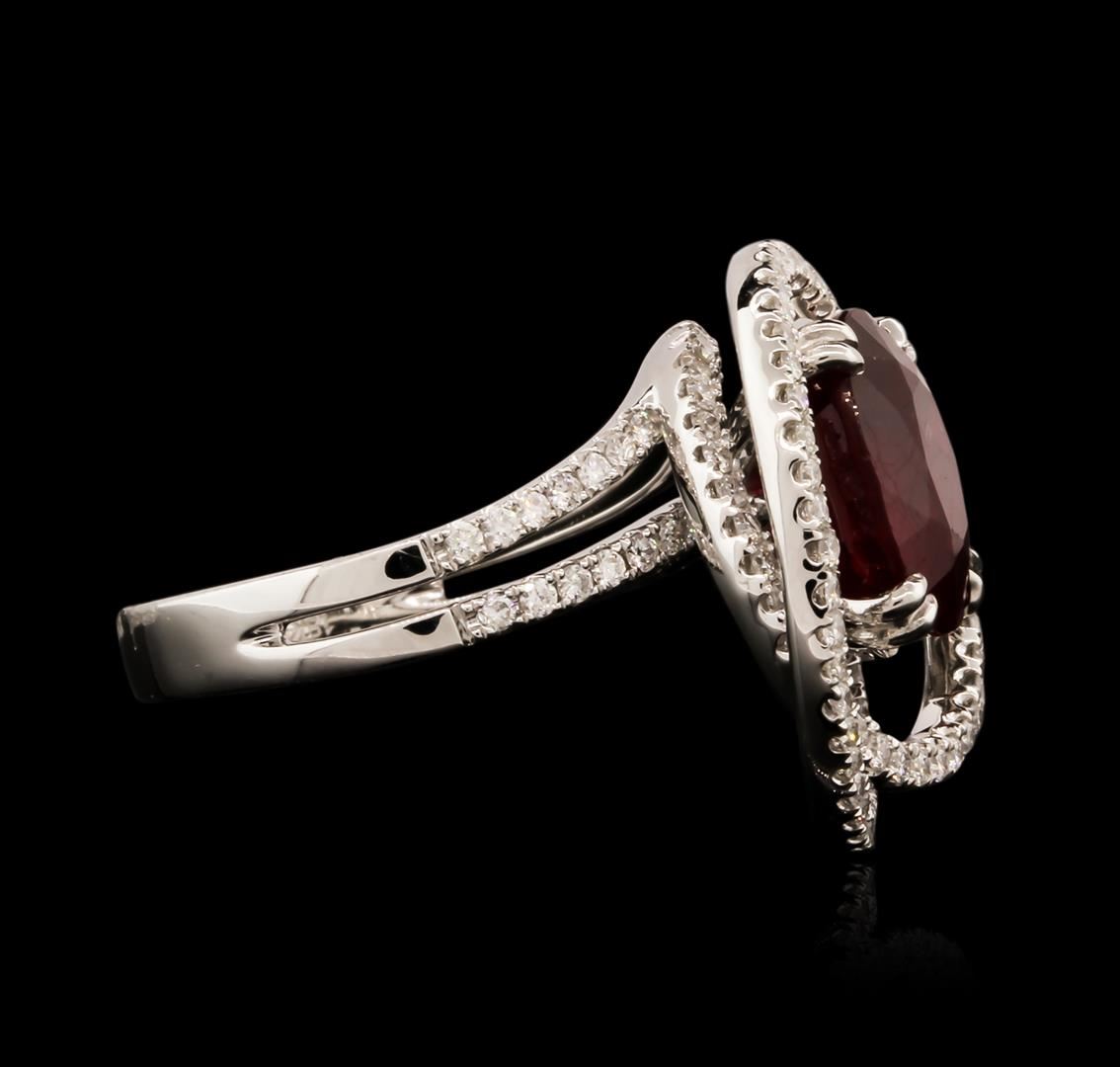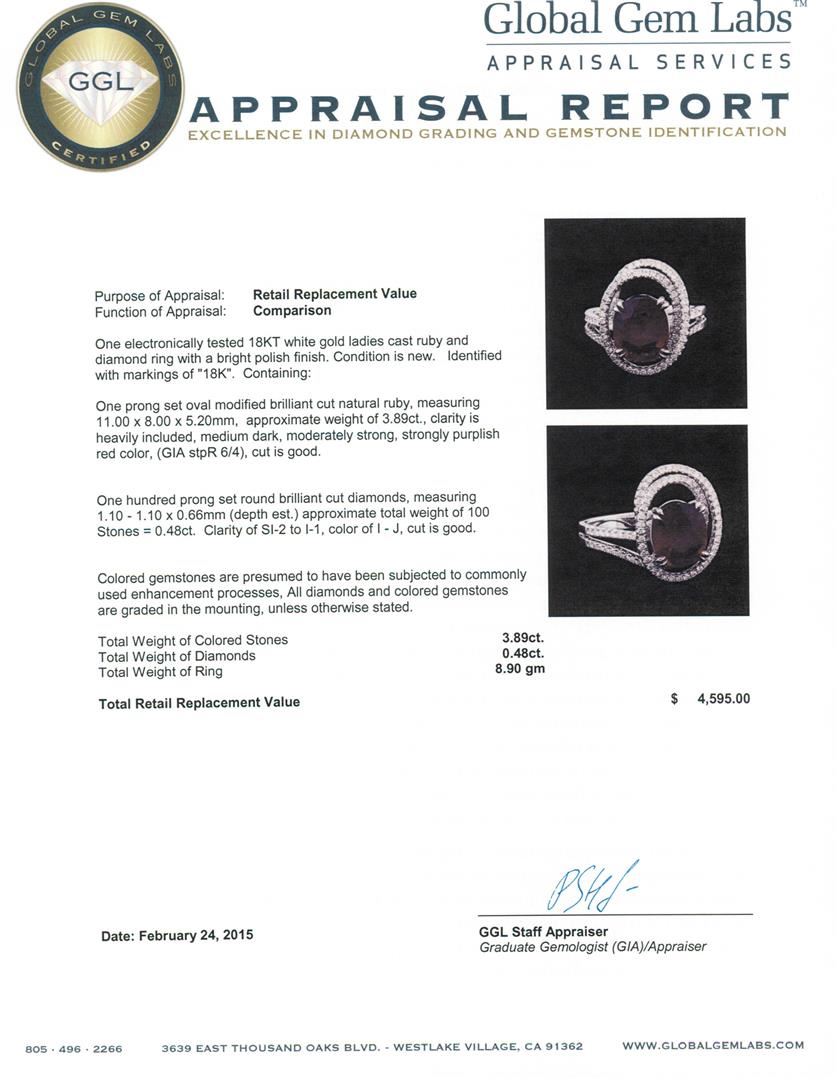 One electronically tested 18KT white gold ladies cast ruby and diamond ring with a bright polish finish. Identified with markings of "18K". Condition is new. Containing: One prong set oval modified brilliant cut natural ruby, measuring 11.00 x 8.00 x 5.20mm, approximate weight of 3.89ct., clarity is heavily included, medium dark, moderately strong, strongly purplish red color, (GIA stpR 6/4), cut is good. One Hundred prong set round brilliant cut diamonds, measuring 1.10 - 1.10 x 0.66mm (depth est.) approximate total weight of 100 Stones = 0.48ct. Clarity: SI-2 to I-1. Color: I - J, Cut is Good. Colored gemstones are presumed to have been subjected to commonly used enhancement processes, All diamonds and colored gemstones are graded in the mounting, unless otherwise stated. Total Weight of Colored Stones 3.89ct. Total Weight of Diamonds 0.48ct. Total Weight of Ring 8.90 grams. GGL Appraised.