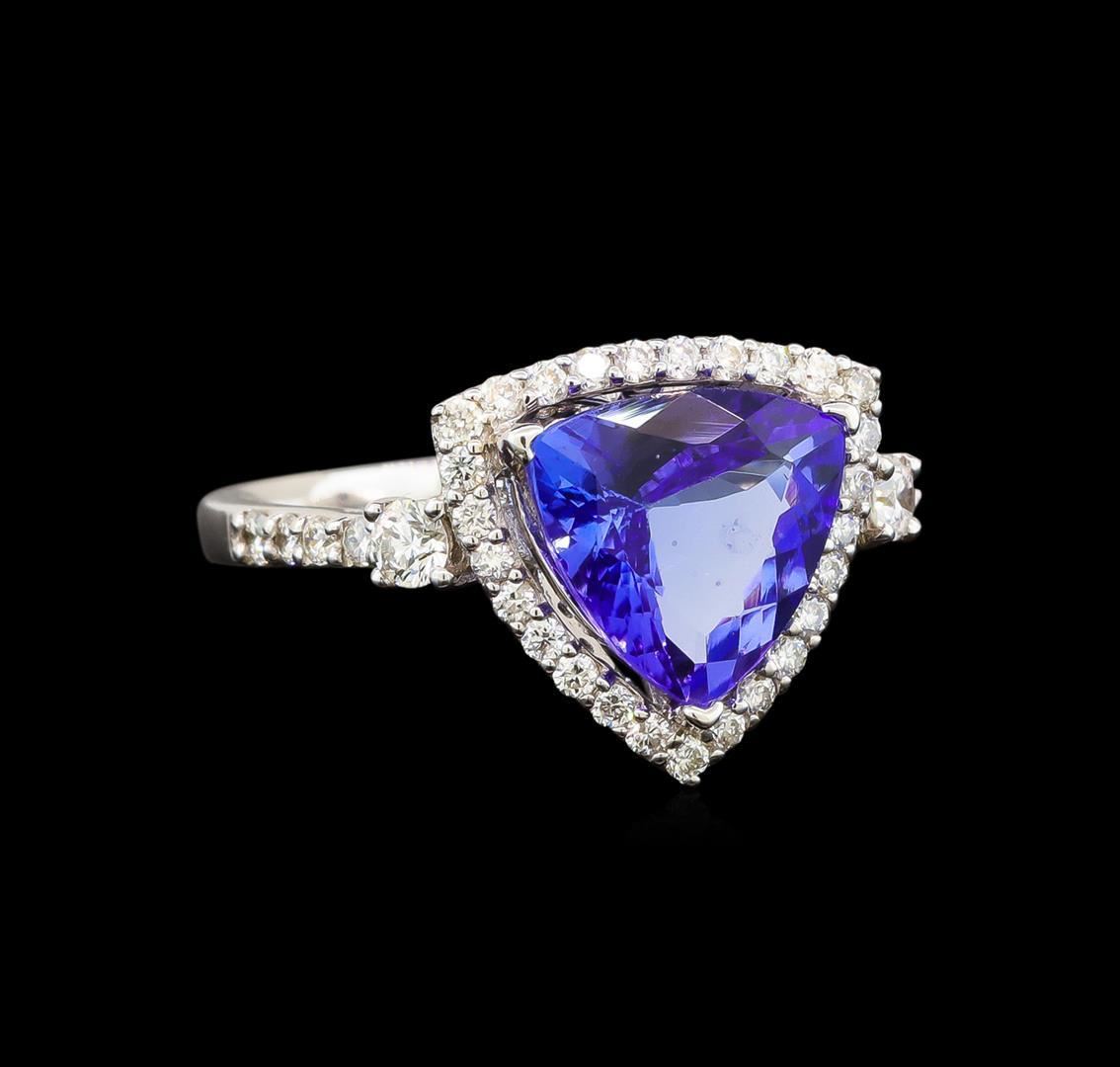 One electronically tested 18KT white gold ladies cast tanzanite and diamond ring with a flat shank with a bright polish finish. Trademark is Orianne. Identified with markings of "18K". Condition is new. Containing: One prong set triangle modified brilliant cut natural tanzanite, measuring 11.00 x 11.00 x 6.05mm, approximate weight of 4.41ct., clarity is eye clean, type I, medium, very slightly grayish, violet color, (GIA V 5/3), cut is good. Fifty-One prong set round brilliant cut diamonds, measuring 1.30 - 1.30 x 0.78mm (depth est.) approximate total weight of 51 Stones = 0.41ct. Clarity: SI-2 to I-1. Color: I - J, Cut is Good. Two prong set round brilliant cut diamonds, measuring 2.50 - 2.50 x 1.50mm (depth est.) approximate total weight of 2 Stones = 0.11ct. Clarity: SI-1. Color: I - J. All diamonds and colored gemstones are graded in the mounting, unless otherwise stated. Colored gemstones are presumed to have been subjected to commonly used enhancement processes. Total Weight of Colored Stones 4.41ct. Total Weight of Diamonds 0.52ct. Total Weight of Ring 3.90 grams. GGL Appraised.