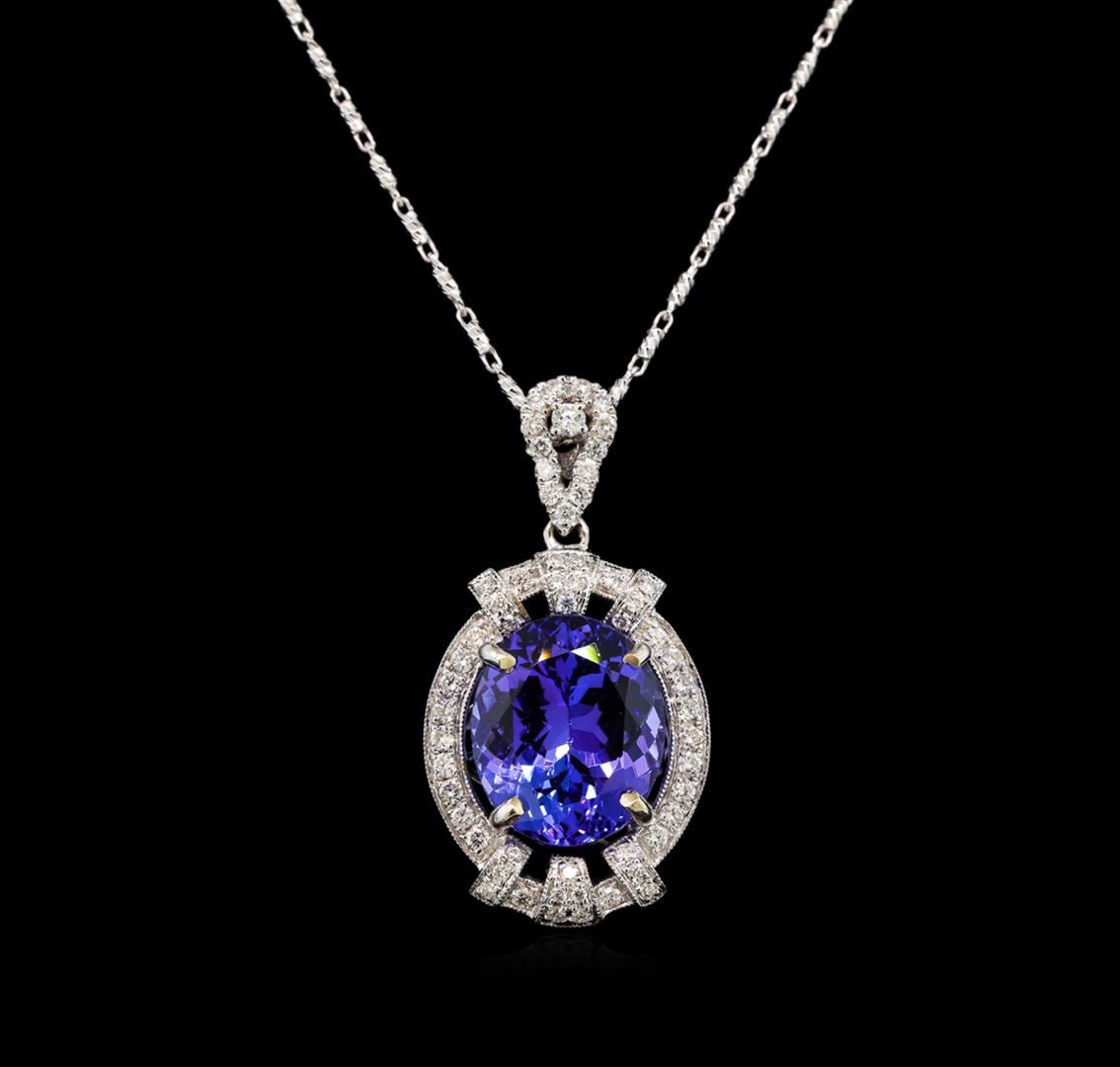One electronically tested 18KT white gold ladies cast tanzanite and diamond pendant & chain 16.0" long, with a lobster claw clasp with a bright polish finish. Identified with markings of "18K". Condition is new. Containing: One prong set oval modified brilliant cut natural , measuring 12.78 x 10.64 x 6.60mm, approximate weight of 6.20 ct., clarity is eye clean, medium light, moderately strong, violet color, (GIA V 4/4), cut is good. Fifty-Eight prong set round brilliant cut diamonds, measuring 2.00 - 1.50 x 1.05mm (depth est.) approximate total weight of 58 Stones = 0.70 ct. Clarity: SI-1 to SI-2. Color: I - J, Cut is Good. Colored gemstones are presumed to have been subjected to commonly used enhancement processes. All diamonds and colored gemstones are graded in the mounting, unless otherwise stated. Total Weight of Colored Stones 6.20 ct. Total Weight of Diamonds 0.70 ct. Total Weight of Pendant & Chain 10.10 grams. GGL Appraised.