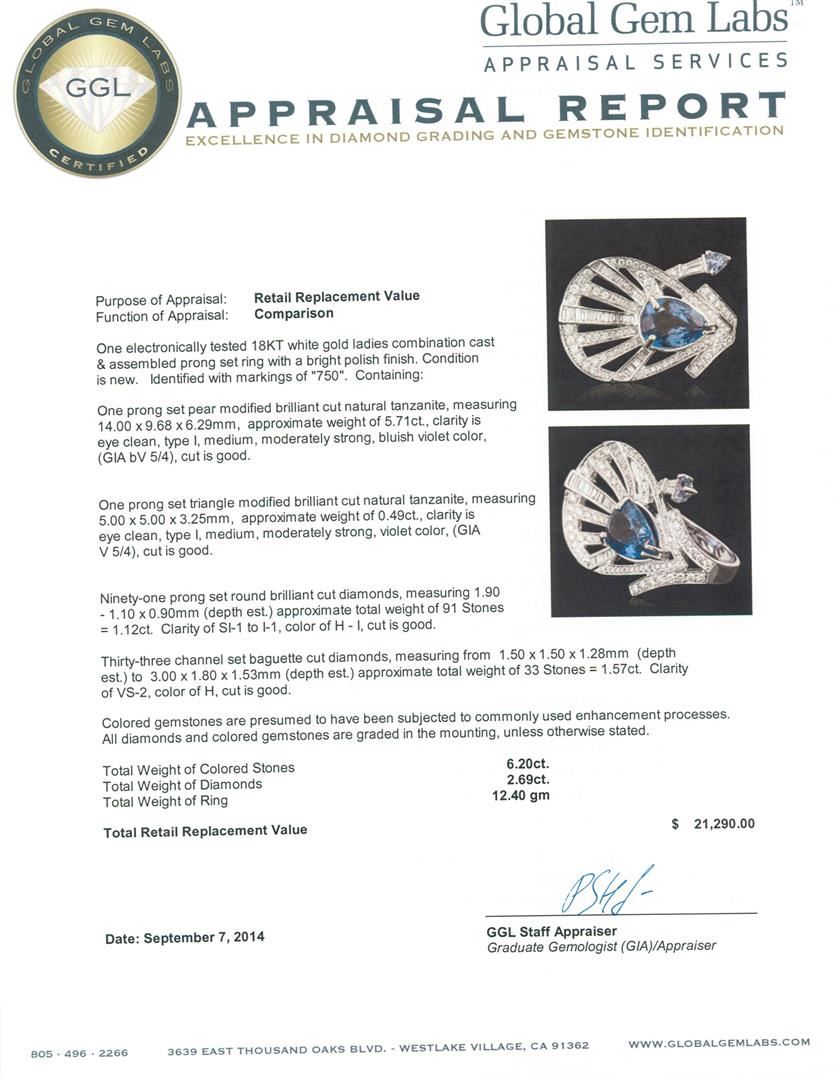 One electronically tested 18KT white gold ladies combination cast & assembled prong set ring with a bright polish finish. Identified with markings of "750". Condition is new. Containing: One prong set pear modified brilliant cut natural tanzanite, measuring 14.00 x 9.68 x 6.29mm, approximate weight of 5.71ct., clarity is eye clean, type I, medium, moderately strong, bluish violet color, (GIA bV 5/4), cut is good. One prong set triangle modified brilliant cut natural tanzanite, measuring 5.00 x 5.00 x 3.25mm, approximate weight of 0.49ct., clarity is eye clean, type I, medium, moderately strong, violet color, (GIA V 5/4), cut is good. Ninety-One prong set round brilliant cut diamonds, measuring 1.90 - 1.10 x 0.90mm (depth est.) approximate total weight of 91 Stones = 1.12ct. Clarity: SI-1 to I-1. Color: H - I, Cut is Good. Thirty-Three channel set baguette cut diamonds, measuring from 1.50 x 1.50 x 1.28mm (depth est.) to 3.00 x 1.80 x 1.53mm (depth est.) approximate total weight of 33 Stones = 1.57ct. Clarity: VS-2. Color: H, Cut is Good. Colored gemstones are presumed to have been subjected to commonly used enhancement processes. All diamonds and colored gemstones are graded in the mounting, unless otherwise stated. Total Weight of Colored Stones 6.20 ct. Total Weight of Diamonds 2.69ct. Total Weight of Ring 12.40 grams. GGL Appraised.