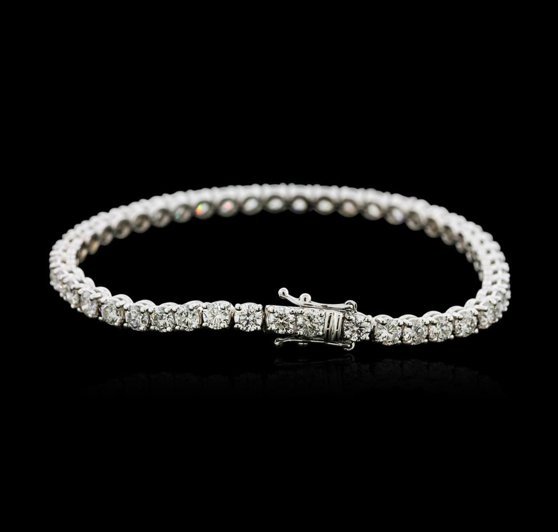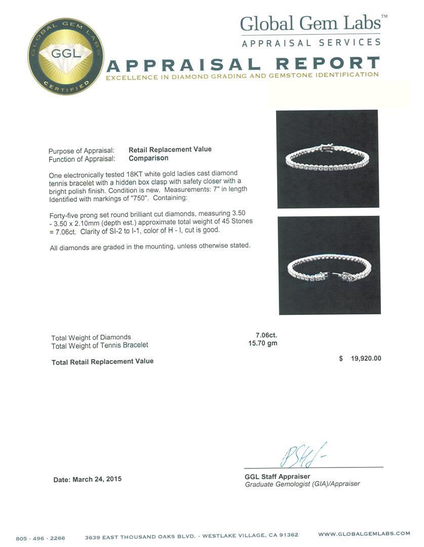 One electronically tested 18KT white gold ladies cast diamond tennis bracelet with a hidden box clasp with safety closer with a bright polish finish. Measurements: 7" in length Identified with markings of "750". Condition is new. Containing: Forty-Five prong set round brilliant cut diamonds, measuring 3.50 - 3.50 x 2.10mm (depth est.) approximate total weight of 45 Stones = 7.06ct. Clarity: SI-2 to I-1. Color: H - I, Cut is Good. All diamonds are graded in the mounting, unless otherwise stated. Total Weight of Diamonds 7.06ct. Total Weight of Tennis Bracelet 15.70 grams. GGL Appraised.