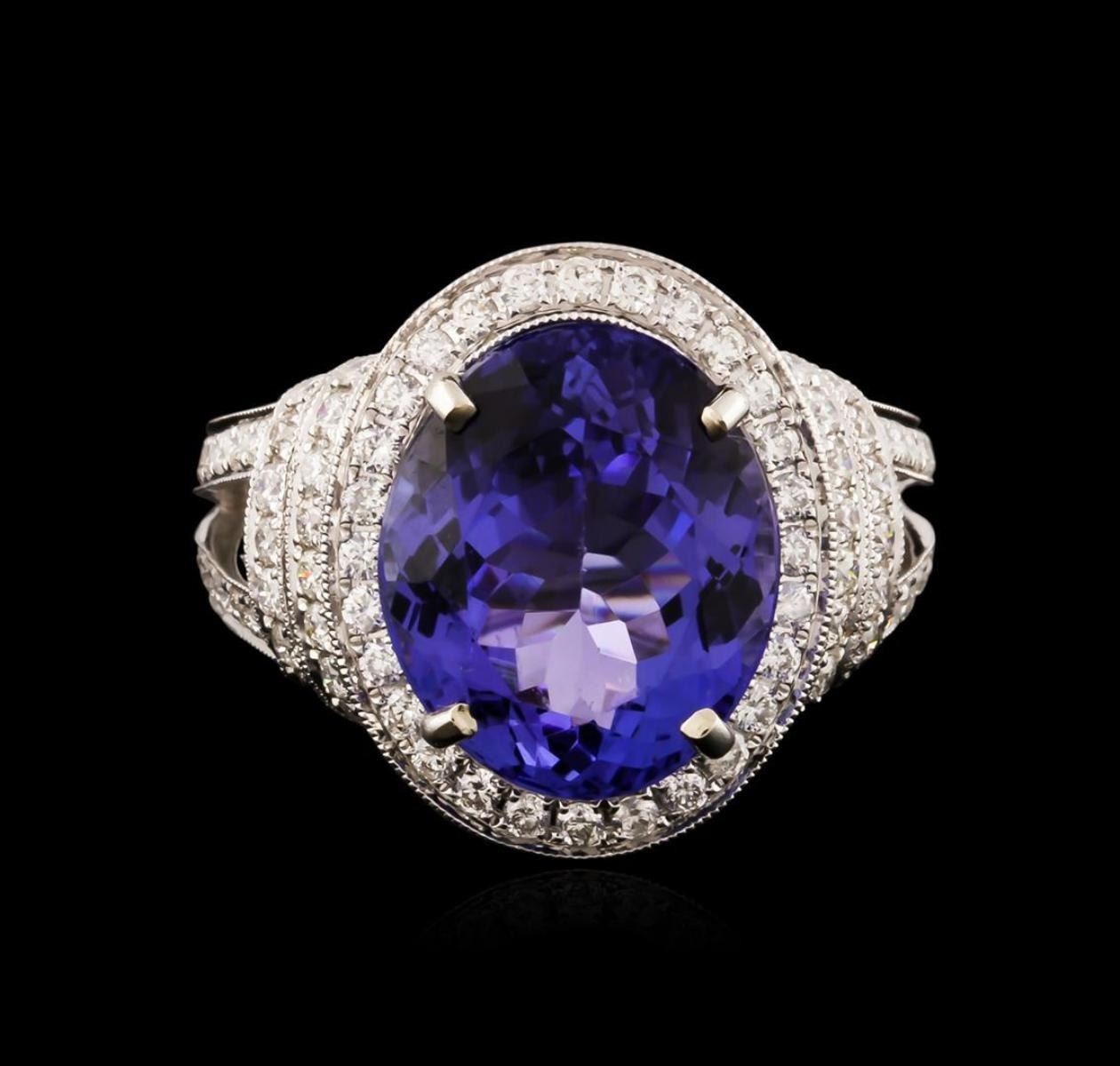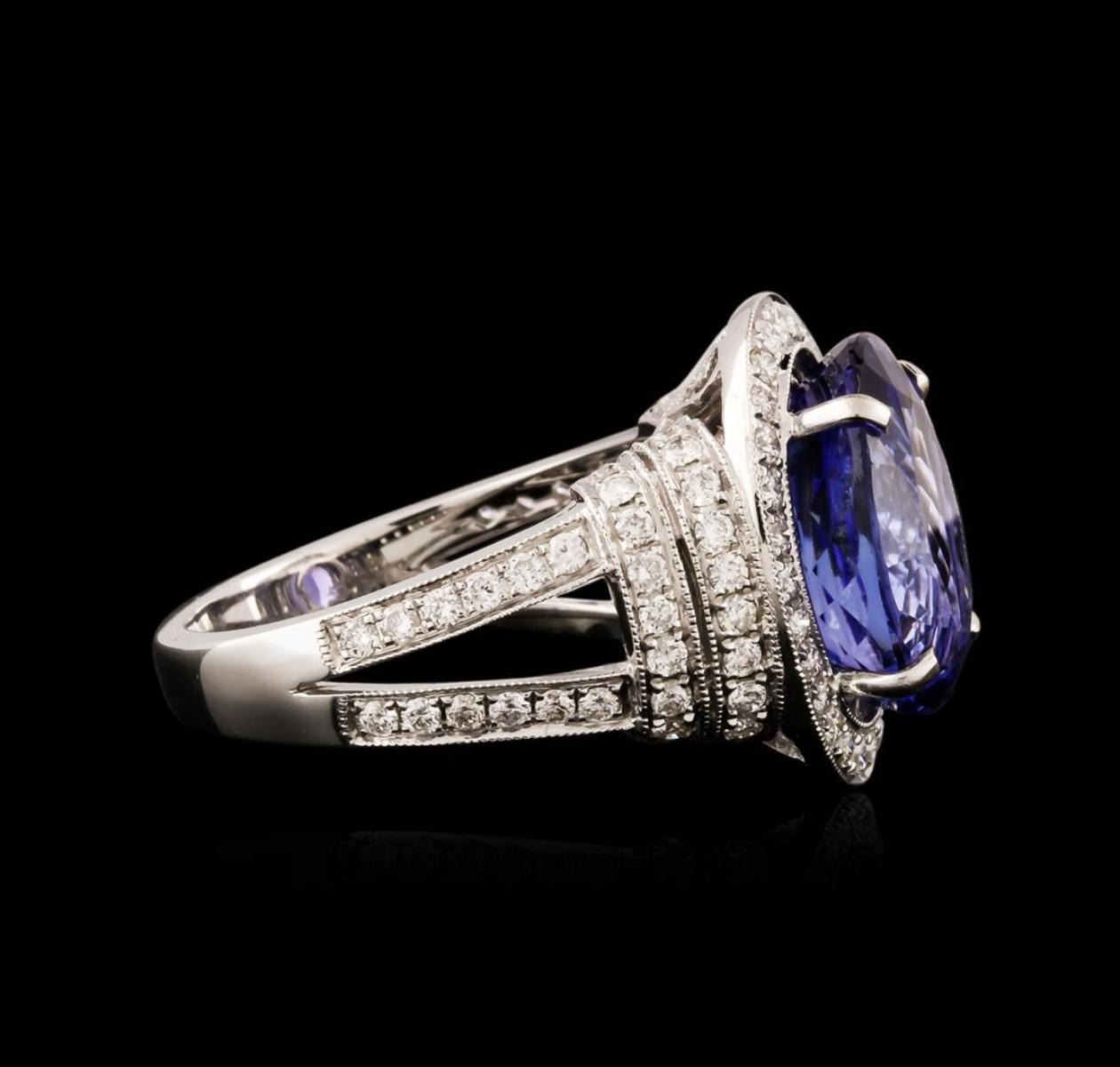 One electronically tested 18KT white gold ladies cast tanzanite and diamond ring with a bright polish finish. Identified with markings of "18K". Condition is new. Containing: One prong set oval modified brilliant cut natural tanzanite, measuring 13.00 x 11.00 x 7.16mm, approximate weight of 7.20ct., clarity is eye clean, type I, medium light, moderately strong, bluish violet color, (GIA bV 4/4), cut is good. Ninety-Eight prong set round brilliant cut diamonds, measuring 1.30 - 1.30 x 0.78mm (depth est.) approximate total weight of 98 Stones = 0.78ct. Clarity: SI-1 to I-1. Color: H - I, Cut is Good. Colored gemstones are presumed to have been subjected to commonly used enhancement processes. All diamonds and colored gemstones are graded in the mounting, unless otherwise stated. Total Weight of Colored Stones 7.20ct. Total Weight of Diamonds 0.78ct. Total Weight of Ring 8.90 grams. GGL Appraised.