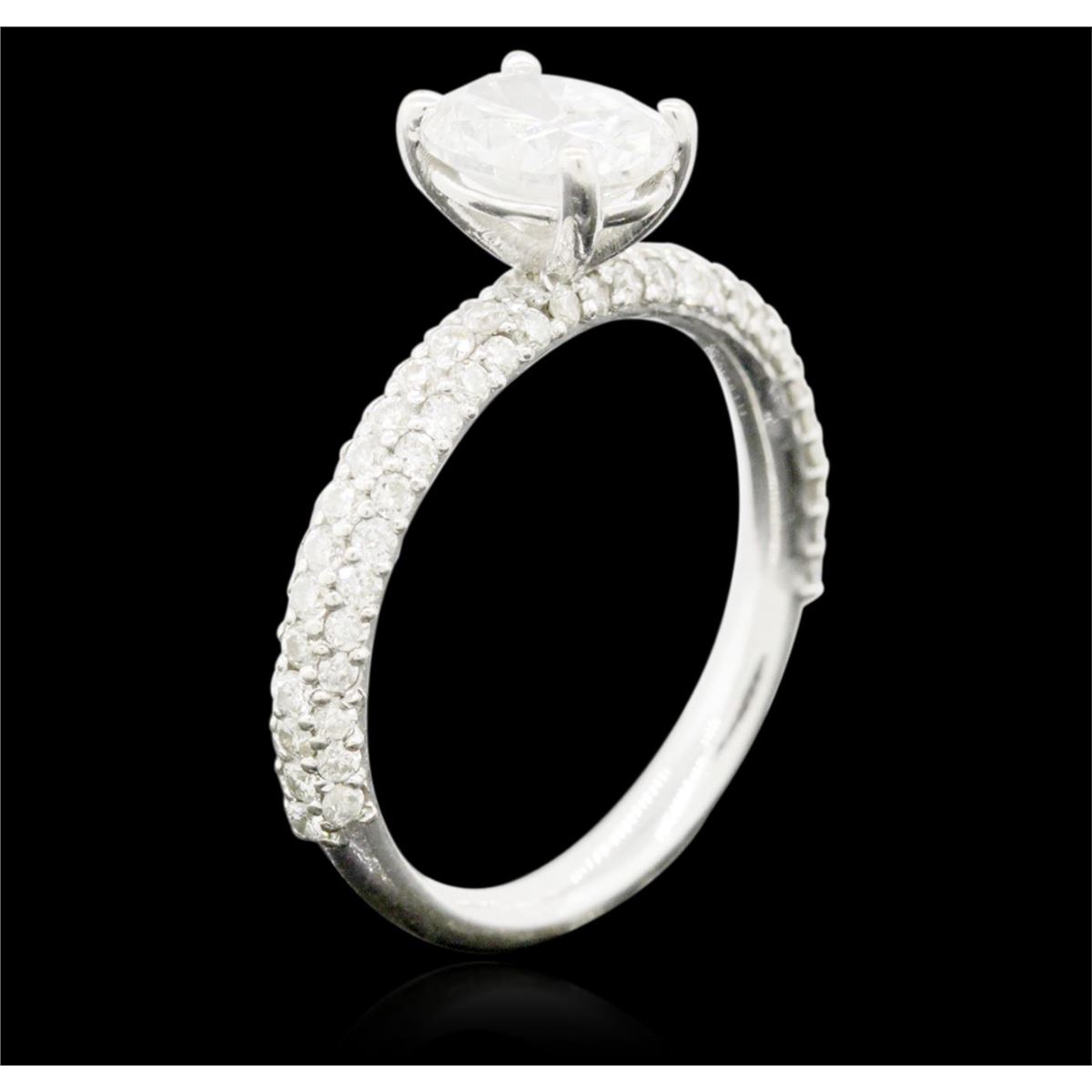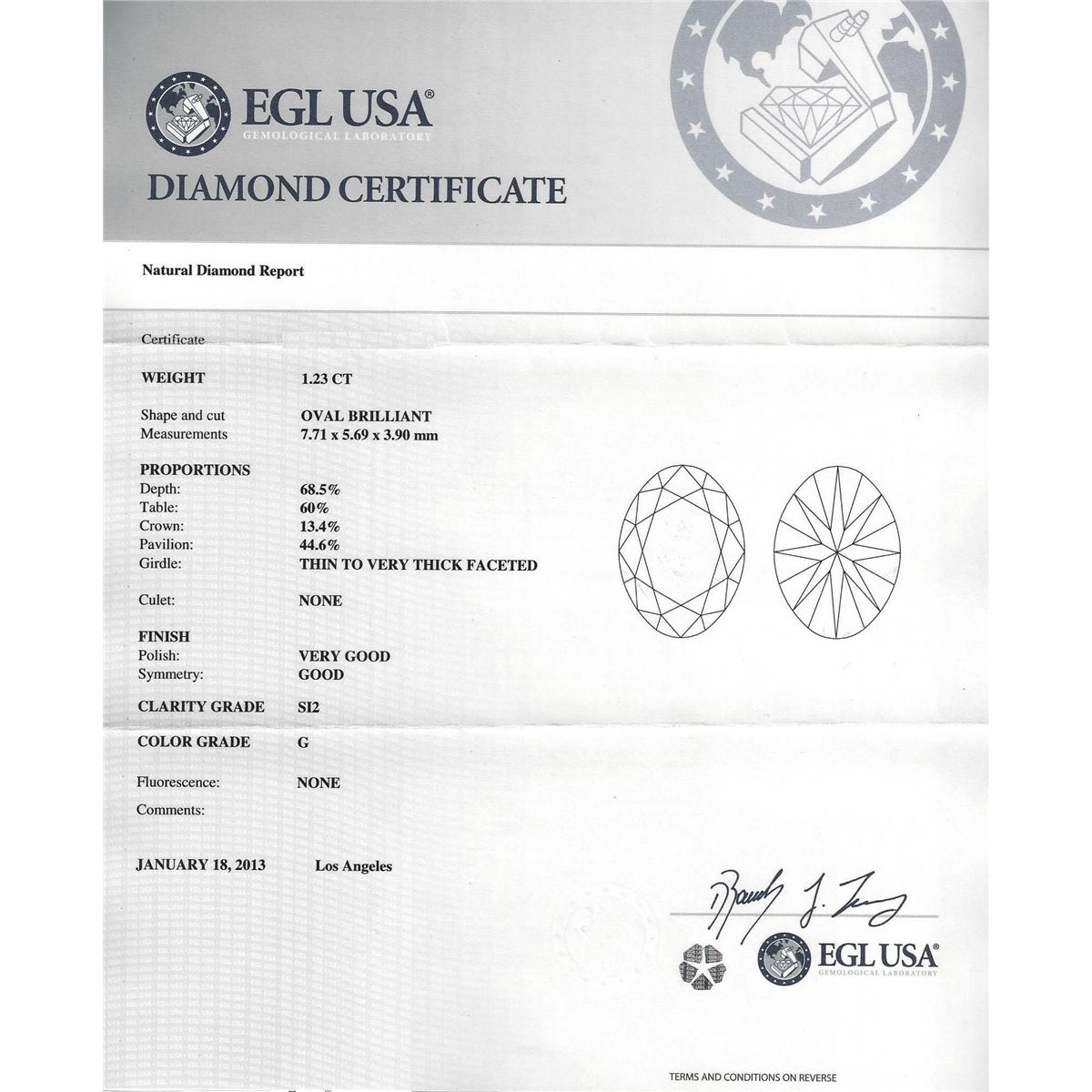 One electronically tested 18KT white gold ladies cast diamond unity ring with a bright polish finish. The featured diamond is supported by diamond set shoulders, completed by a two and one-half millimeter wide band. Condition is new, good workmanship. Containing: One prong set oval shaped cut diamond, measuring 7.71 x 5.69 x 3.90mm exact weight 1.23ct. EGL Report attached. Graded loose prior to setting in the EGL Laboratory Report #US 907408710D. Clarity: SI-2. Color: G. Depth 68.5%. Table 60.0%. Pavil. Depth%. 44.6%. Eighty-Four prong set round brilliant cut diamonds, measuring 1.30 - 1.20 x 0.75mm (depth est.) approximate total weight of 84 Stones = 0.69ct. Graded in the setting. Clarity: VS-2 to SI-2. Color: G - I. Total Weight of Diamonds 1.92ct. Total Weight of Ring 3.59 grams. AIG Appraised at $17,320.00.