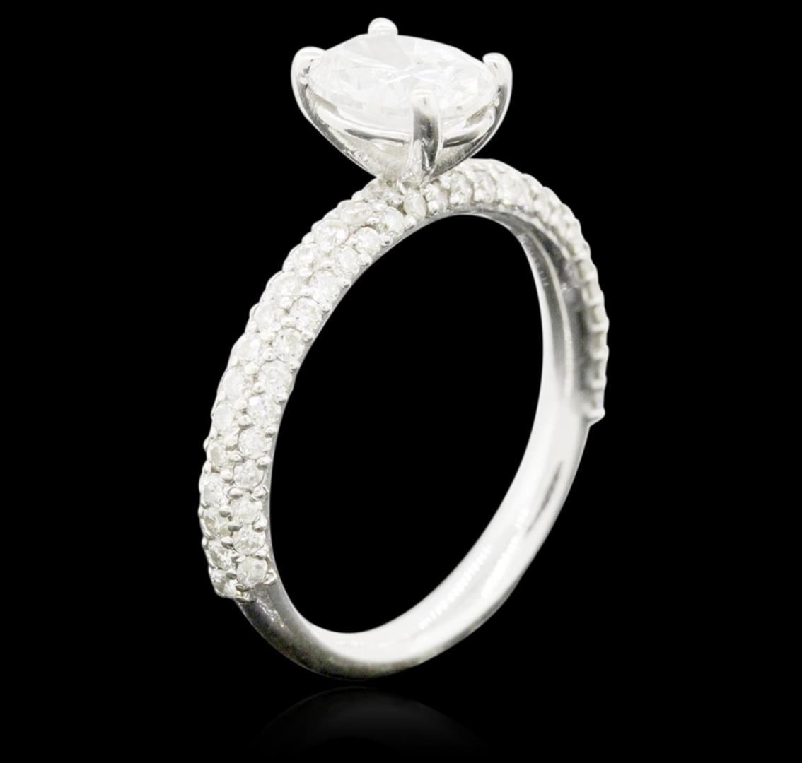 One electronically tested 18KT white gold ladies cast diamond unity ring with a bright polish finish. The featured diamond is supported by diamond set shoulders, completed by a two and one-half millimeter wide band. Condition is new, good workmanship. Containing: One prong set oval shaped cut diamond, measuring 7.71 x 5.69 x 3.90mm exact weight 1.23ct. EGL Report attached. Graded loose prior to setting in the EGL Laboratory Report #US 907408710D. Clarity: SI-2. Color: G. Depth 68.5%. Table 60.0%. Pavil. Depth%. 44.6%. Eighty-Four prong set round brilliant cut diamonds, measuring 1.30 - 1.20 x 0.75mm (depth est.) approximate total weight of 84 Stones = 0.69ct. Graded in the setting. Clarity: VS-2 to SI-2. Color: G - I. Total Weight of Diamonds 1.92ct. Total Weight of Ring 3.59 grams. AIG Appraised.