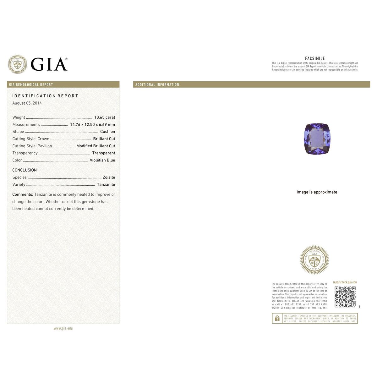 One electronically tested 18KT white gold ladies combination cast & assembled prong set ring with a split shank with a bright polish finish. Identified with markings of "750 UCG". Condition is new. Containing: One prong set rectangular cushion modified brilliant cut natural tanzanite, measuring 14.76 x 12.50 x 6.69mm, exact weight 10.65ct., clarity is eye clean, type I, medium, moderately strong, violetish blue color, (GIA vB 5/4), cut is excellent. Graded loose prior to setting by GIA Gemological Laboratory, GIA Laboratory Report # 2161453342.Sixty-Four prong set round brilliant cut diamonds, measuring 1.50 - 1.50 x 0.90mm (depth est.) approximate total weight of 64 Stones = 0.86ct. Clarity: SI-1 to SI-2. Color: H - I, Cut is Good. Colored gemstones are presumed to have been subjected to commonly used enhancement processes. All diamonds and colored gemstones are graded in the mounting, unless otherwise stated. Total Weight of Colored Stones 10.65ct. Total Weight of Diamonds 0.86ct. Total Weight of Ring 10.50 grams. GGL Appraised at $31,145.00.