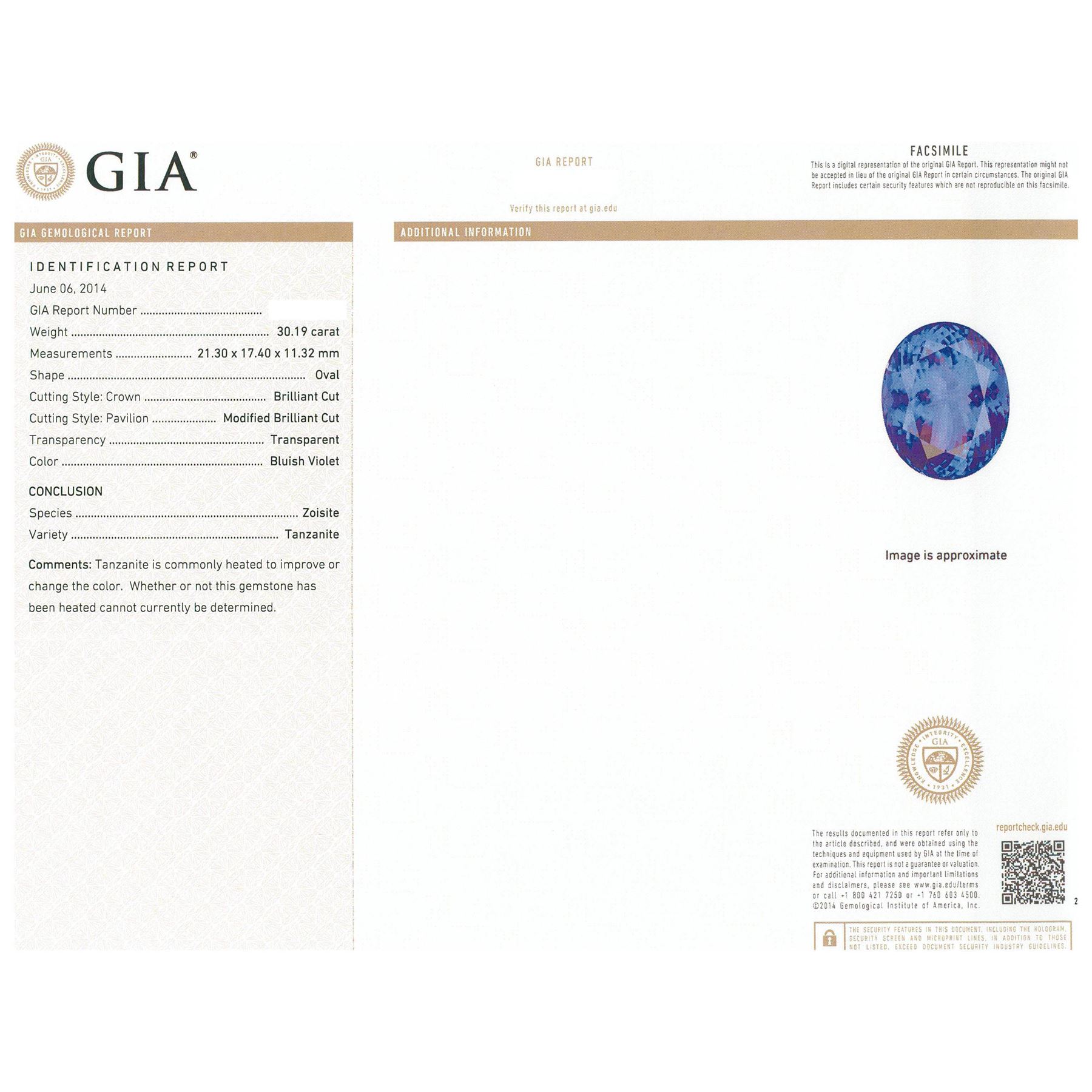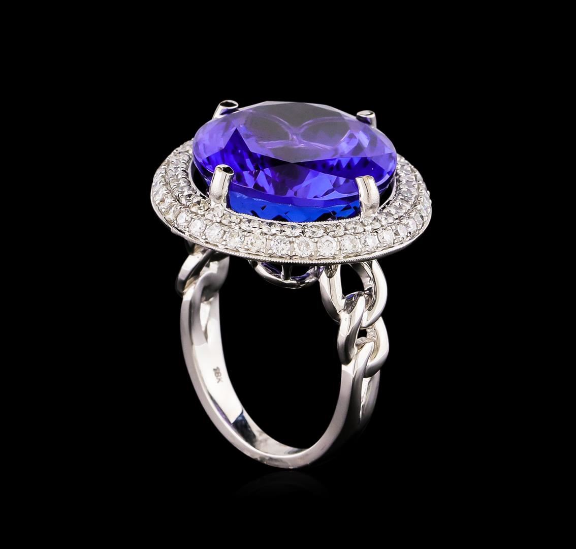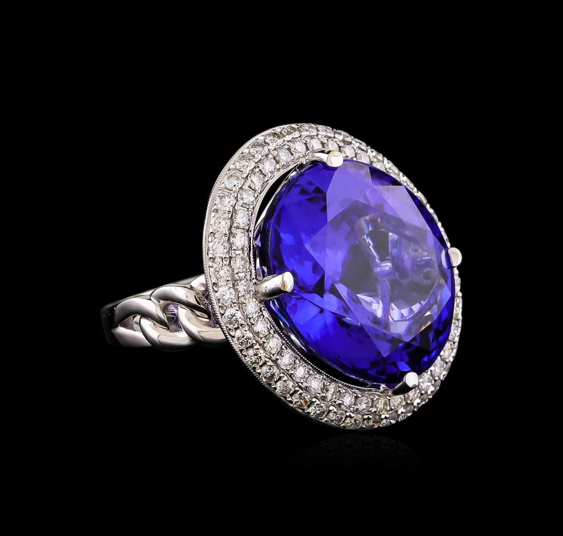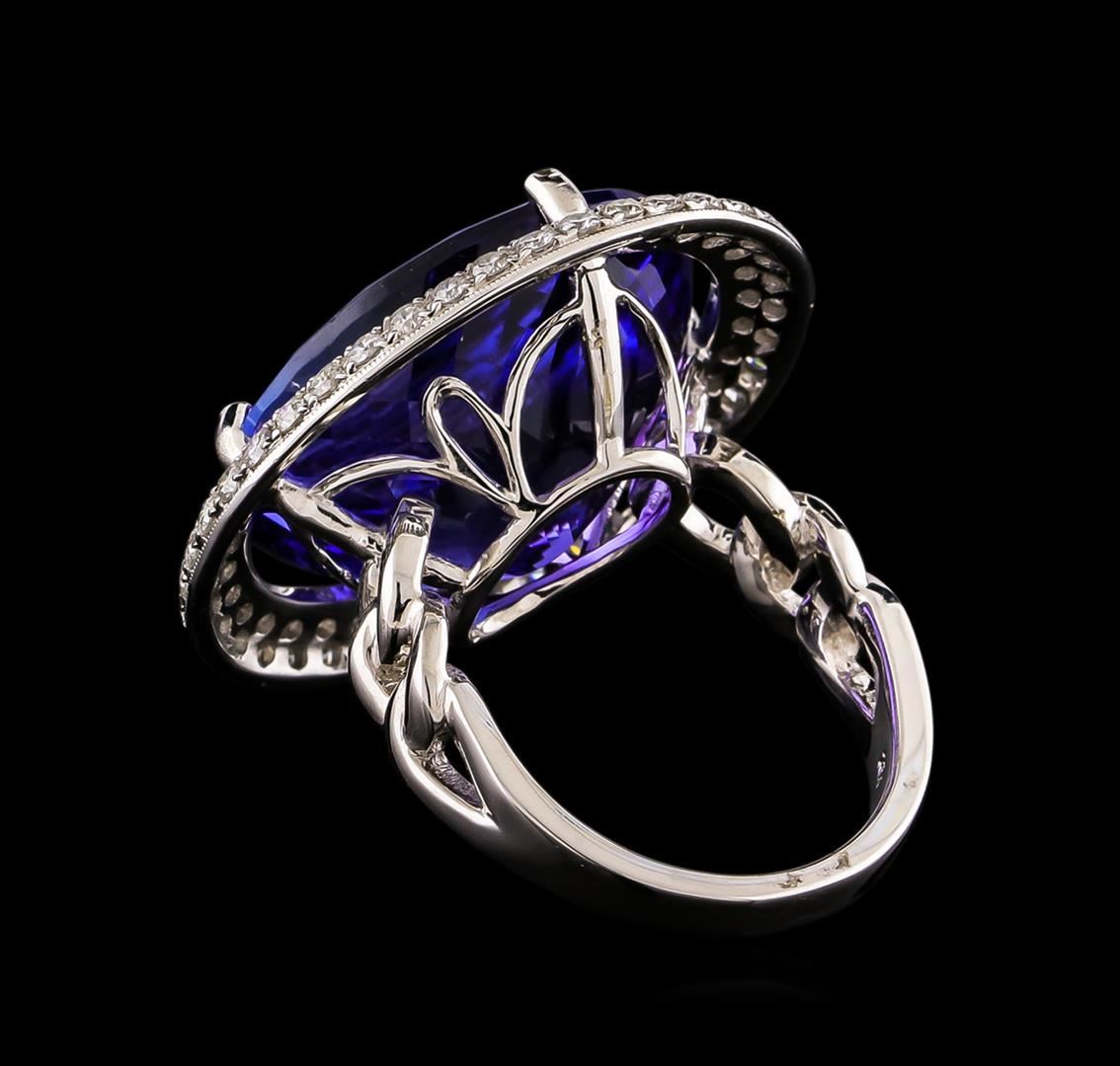 One electronically tested 18KT white gold ladies cast tanzanite and diamond ring. The featured tanzanite is set within a tiered diamond bezel supported by intertwining shoulders, completed by a two and one-half millimeter wide band. Bright polish finish with milgrain detailing. Trademark is UCG. Identified with markings of "18K 750". Containing: One prong set oval modified brilliant cut natural tanzanite, measuring 21.30 x 17.40 x 11.32mm, exact weight 30.19ct., clarity is eye clean, type I, medium dark, moderately strong, bluish violet color, (GIA bV 6/4), cut is good. Transmitting light with no distortion, transparent. GIA Gemological Report attached. Graded loose prior to setting in the GIA Laboratory, Report #2161211925.Tanzanite is a very rare gemstone that is only found in the country of Tanzania. Originally discovered in 1967. Tiffany & Company, named the stone Tanzanite. It is found in the Usumburu Mountains that border the Umba Valley of northern Tanzania. Tanzanite occurs in gray, brown, violet, blue, reddish-purple, & green. The gem is interesting because of its exceptional pleochroism. Rotated in different directions a tanzanite will exhibit multiple changes of color. Tanzanite has a low tolerance to ultrasonic cleaning, and should not be cleaned using this method. Seventy-Eight prong set round brilliant cut diamonds, measuring 1.60 - 1.60 x 0.96mm (depth est.) approximate total weight of 78 Stones = 1.26ct. Graded in the setting. Clarity: SI-1 to I-1. Color: G - I. Total Weight of Colored Stones 30.19ct. Total Weight of Diamonds 1.26ct. Total Weight of Ring 16.30 grams. AIG Appraised.