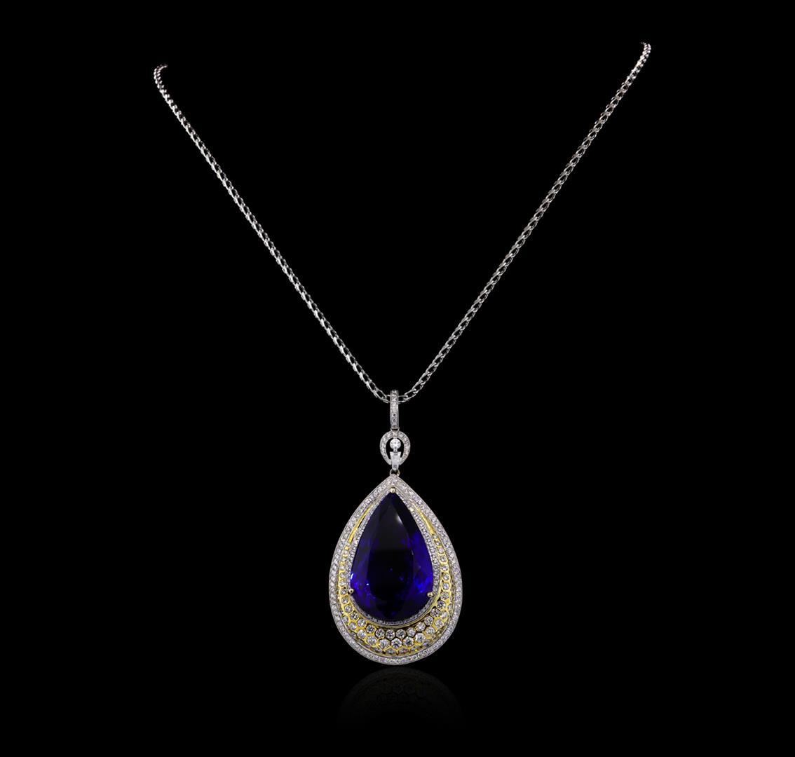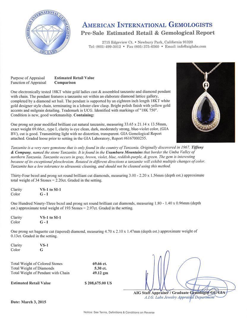 One electronically tested 18KT white gold ladies cast & assembled tanzanite and diamond pendant with chain. The pendant features a tanzanite set within an elaborate diamond lattice gallery, completed by a diamond set bail. The pendant is supported by an eighteen inch length 18KT white gold designer style chain, terminating in a lobster claw clasp. Bright polish finish with yellow gold accents and milgrain detailing. Trademark is UGG. Identified with markings of "18K 750". Condition is new, good workmanship. Containing: One prong set pear modified brilliant cut natural tanzanite, measuring 33.65 x 21.14 x 13.58mm, exact weight 69.66ct., type I Clarity is eye clean, dark, moderately strong, blue-violet color, (GIA BV), cut is good. Transmitting light with no distortion, transparent. GIA Gemological Report attached. Graded loose prior to setting in the GIA Laboratory, Report #6167000255.Tanzanite is a very rare gemstone that is only found in the country of Tanzania. Originally discovered in 1967. Tiffany & Company, named the stone Tanzanite. It is found in the Usumburu Mountains that border the Umba Valley of northern Tanzania. Tanzanite occurs in gray, brown, violet, blue, reddish-purple, & green. The gem is interesting because of its exceptional pleochroism. Rotated in different directions a tanzanite will exhibit multiple changes of color. Tanzanite has a low tolerance to ultrasonic cleaning, and should not be cleaned using this method. Thirty-Four bezel and prong set round brilliant cut diamonds, measuring 3.00 - 2.20 x 1.56mm (depth est.) approximate total weight of 34 Stones = 2.20ct. Graded in the setting. Clarity: VS-1 to SI-1. Color: G - I One Hundred Ninety-Three bezel and prong set round brilliant cut diamonds, measuring 1.80 - 1.40 x 0.96mm (depth est.) approximate total weight of 193 Stones = 2.97ct. Graded in the setting. Clarity: VS-1 to SI-1. Color: G - I One prong set baguette cut (tapered) diamond, measuring 4.70 x 2.10 x 1.47mm (depth est.) approximate weight of 0.13ct. Graded in the setting. Clarity: VS-1. Color: G. Total Weight of Colored Stones 69.66ct. Total Weight of Diamonds 5.30ct. Total Weight of Pendant With Chain 49.12 grams. AIG Appraised.