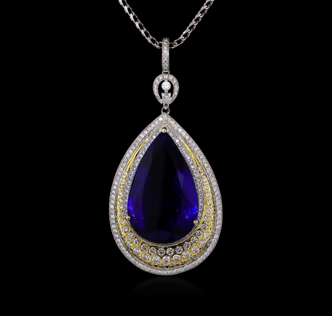 One electronically tested 18KT white gold ladies cast & assembled tanzanite and diamond pendant with chain. The pendant features a tanzanite set within an elaborate diamond lattice gallery, completed by a diamond set bail. The pendant is supported by an eighteen inch length 18KT white gold designer style chain, terminating in a lobster claw clasp. Bright polish finish with yellow gold accents and milgrain detailing. Trademark is UGG. Identified with markings of "18K 750". Condition is new, good workmanship. Containing: One prong set pear modified brilliant cut natural tanzanite, measuring 33.65 x 21.14 x 13.58mm, exact weight 69.66ct., type I Clarity is eye clean, dark, moderately strong, blue-violet color, (GIA BV), cut is good. Transmitting light with no distortion, transparent. GIA Gemological Report attached. Graded loose prior to setting in the GIA Laboratory, Report #6167000255.Tanzanite is a very rare gemstone that is only found in the country of Tanzania. Originally discovered in 1967. Tiffany & Company, named the stone Tanzanite. It is found in the Usumburu Mountains that border the Umba Valley of northern Tanzania. Tanzanite occurs in gray, brown, violet, blue, reddish-purple, & green. The gem is interesting because of its exceptional pleochroism. Rotated in different directions a tanzanite will exhibit multiple changes of color. Tanzanite has a low tolerance to ultrasonic cleaning, and should not be cleaned using this method. Thirty-Four bezel and prong set round brilliant cut diamonds, measuring 3.00 - 2.20 x 1.56mm (depth est.) approximate total weight of 34 Stones = 2.20ct. Graded in the setting. Clarity: VS-1 to SI-1. Color: G - I One Hundred Ninety-Three bezel and prong set round brilliant cut diamonds, measuring 1.80 - 1.40 x 0.96mm (depth est.) approximate total weight of 193 Stones = 2.97ct. Graded in the setting. Clarity: VS-1 to SI-1. Color: G - I One prong set baguette cut (tapered) diamond, measuring 4.70 x 2.10 x 1.47mm (depth est.) approximate weight of 0.13ct. Graded in the setting. Clarity: VS-1. Color: G. Total Weight of Colored Stones 69.66ct. Total Weight of Diamonds 5.30ct. Total Weight of Pendant With Chain 49.12 grams. AIG Appraised.