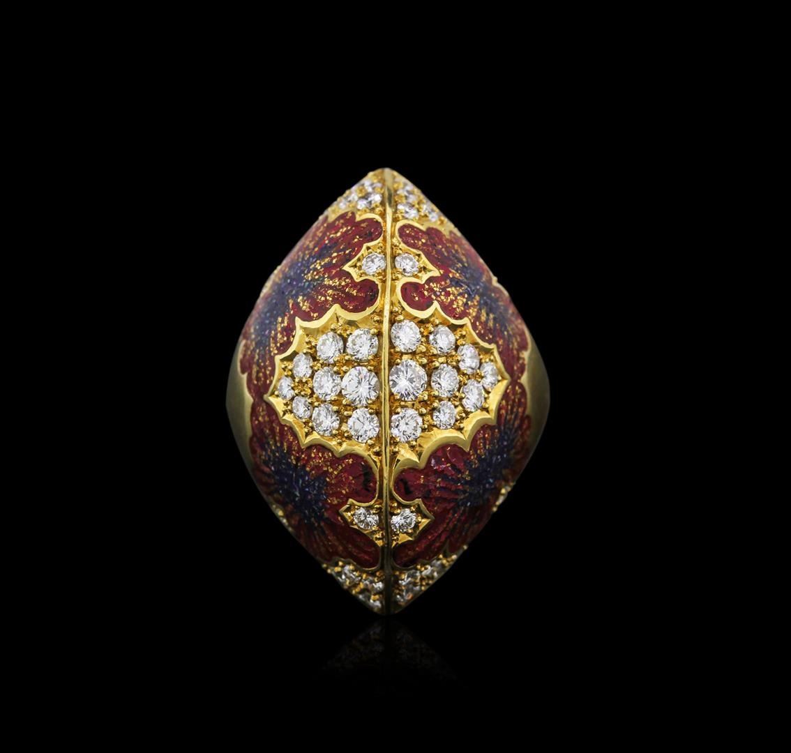 One electronically tested 18KT yellow gold ladies cast diamond ring with a enameled finish. Condition is new. Identified with markings of "18K". Containing: Fifty prong set round brilliant cut diamonds, measuring 2.30 - 1.60 x 1.17mm (depth est.) approximate total weight of 50 Stones = 0.80 ct. Clarity of VS-2, color of F, cut is very good. Diamonds are graded in the mounting, unless otherwise stated. Total Weight of Diamonds 0.80 ct. Total Weight of Ring 12.60 grams. GGL Appraised.