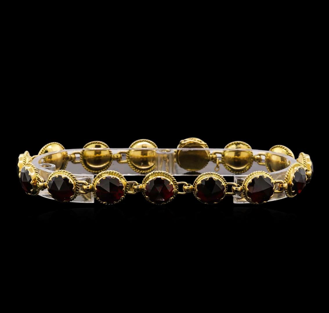 One electronically tested 18KT yellow gold ladies custom cast & hand crafted pyrope-almandite garnet ensemble. The ensemble includes an anklet/bracelet, a ring, two pendants and a pair of earrings. The nine and one-quarter inch length anklet/bracelet features a flexible garnet ribbon, terminating in a box clasp with safety chain. The garnet solitaire ring is supported by three-way split shoulders, completed by a grooved three millimeter wide band. One of the pendants features two inch by one and one-quarter inch length garnet cross, completed by a yellow gold bail. The second pendant features a garnet solitaire, also completed by a yellow gold bail. The garnet ensemble is completed by a matching pair of solitaire garnet earrings with standard backs. Bright polish finish with rope detailing. Hallmarks: French, 18KT. Identified with markings of "750". Condition is good. Containing: One bezel set rose cabochon mixed cut natural pyrope-almandite garnet, measuring 16.00 x 11.00 x 3.70mm, approximate weight of 7.12ct., clarity is eye clean, dark, slightly brownish, orangy red color, (GIA oR 7/2), cut is good. Transmitting light with no distortion, transparent. Graded in the setting. Six bezel set rose cabochon cut natural pyrope-almandite garnets, measuring 8.00 x 6.00 x 3.00mm, approximate total weight of 9.42ct., clarity is eye clean, dark, slightly brownish, orangy red color, (GIA oR 7/2), cut is good. Transmitting light with no distortion, transparent. Measurements & the color grade are an average for the group. Graded in the setting. Sixteen bezel set rose cabochon cut natural pyrope-almandite garnets, measuring 8.50 x 8.40 x 3.00mm, approximate total weight of 37.44ct., clarity is eye clean, dark, slightly brownish, orangy red color, (GIA oR 7/2), cut is good. Transmitting light with no distortion, transparent. Color grade is an average for the group. Graded in the setting. Two bezel set rose cabochon cut natural pyrope-almandite garnets, measuring 6.00 x 5.90 x 2.50mm, approximate total weight of 1.94ct., clarity is eye clean, dark, slightly brownish, orangy red color, (GIA oR 7/2), cut is good. Transmitting light with no distortion, transparent. Color grade is an average for the pair. Graded in the setting. Total Weight of Colored Stones 55.92ct. Total Weight of Ensemble 35.99 grams. AIG Appraised at $8,660.00.