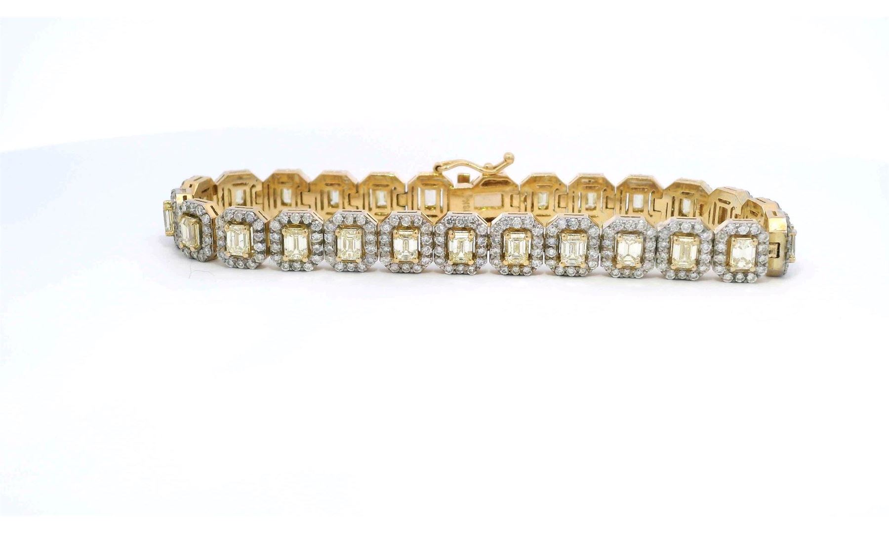 A luxurious 18KT yellow gold tennis bracelet adorned with 26 fancy light yellow emerald cut diamonds weighing 5.52 carats and 364 round brilliant cut diamonds weighing 3.39 carats, totaling 8.91 carats. The 7-inch bracelet is secured with a tongue clasp and foldover safety, featuring a high-polished finish and exquisite craftsmanship. Estimated Retail Value: $57,750.