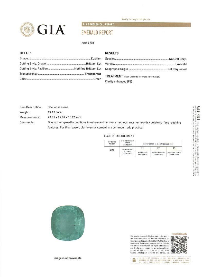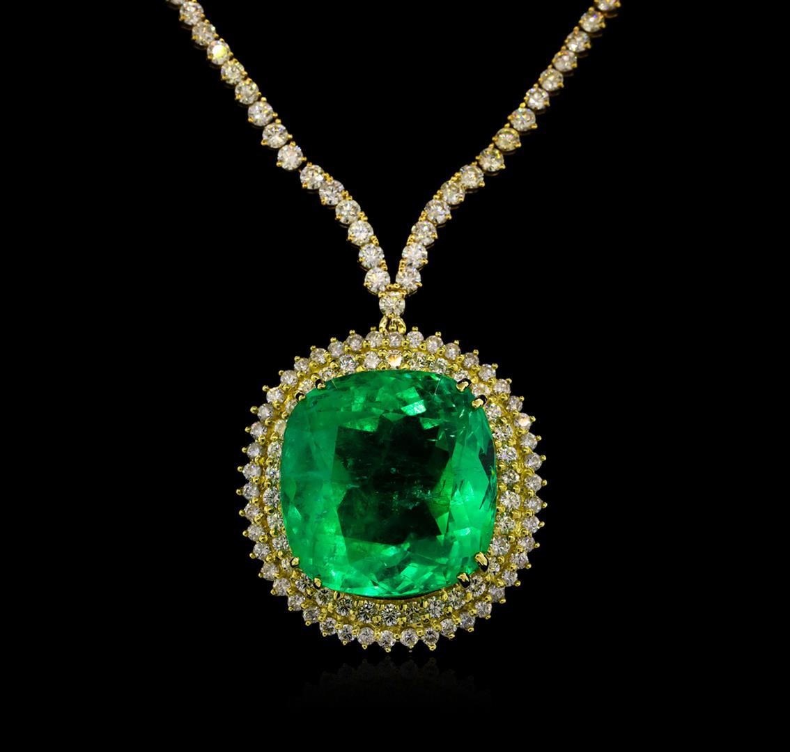 One electronically tested 18KT yellow gold ladies cast & assembled emerald and diamond necklace. Seventeen inch length necklace features a pendant consisting of an emerald set within tiered diamond bezels supported by a chevron style diamond ribbon transitioning into matching yellow gold links, terminating in a conceal clasp with safety. Bright polish finish. Identified with markings of "18K". Condition is new, good workmanship. Containing: One prong set cushion modified brilliant cut natural emerald, measuring 23.01 x 22.07 x 15.26mm, exact weight 49.47ct., clarity is heavily included, type III, medium dark, very slightly grayish, green color, (GIA G 6/3), cut is good. Transmitting light with a minimum of distortion, transparent. Naturally occurring internal & external characteristics are present. Moderate clarity enhancement. GIA Gemological Report attached. Graded loose prior to setting in the GIA Laboratory, Report #2175051732.One Hundred Seventy-Five prong set round brilliant cut diamonds, measuring 2.60 - 2.00 x 1.38mm (depth est.) approximate total weight of 175 Stones = 7.88ct. Graded in the setting. Clarity: VS-2 to SI-2. Color: G - I. Total Weight of Colored Stones 49.47ct. Total Weight of Diamonds 7.88ct. Total Weight of Necklace 43.68 grams. AIG Appraised at $204,185.00.