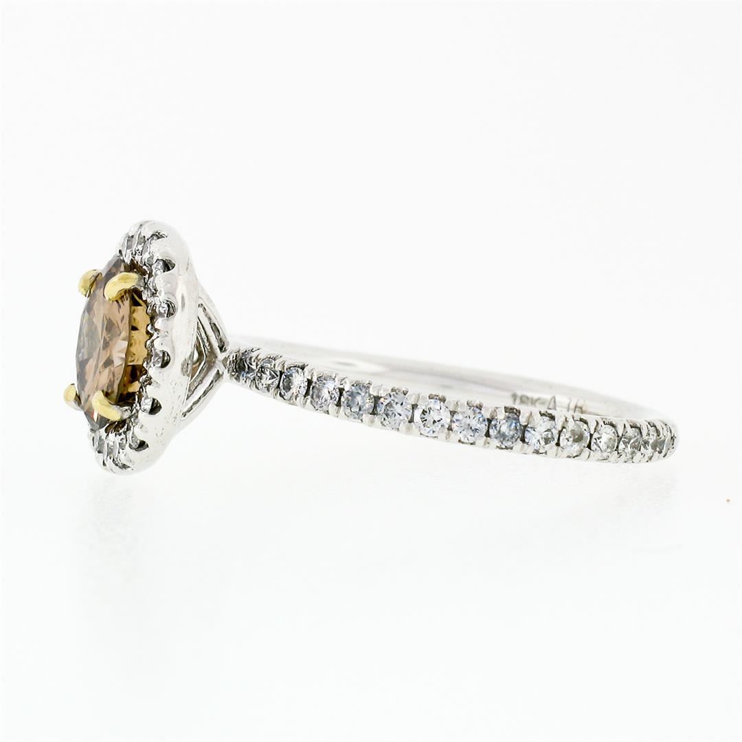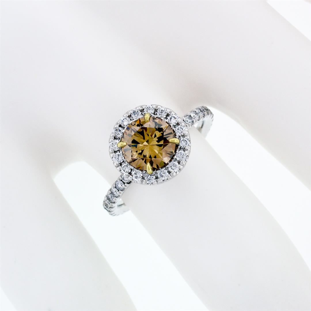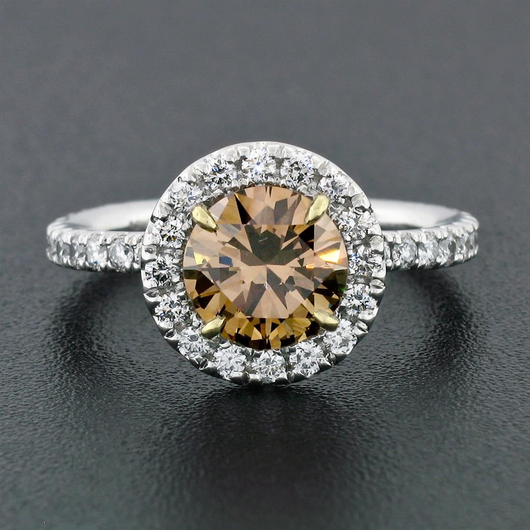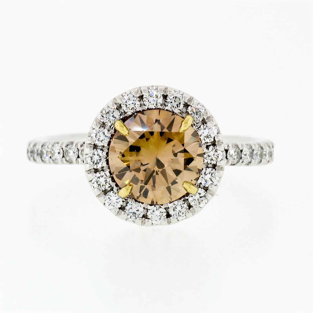 An estate solid 18k white and yellow gold solitaire engagement ring, with 1 Gia certified round brilliant cut natural diamond (Fancy Dark Orange-Brown - SI1; 1.06 ct), and a halo of 46 round brilliant cut natural diamonds (G/H- VS1/VS2; 0.50ctw). The ring is size 5.5, weighs a total of 3.43 grams, and measures 10.35mm diameter. Comes with all original relevant certifications.