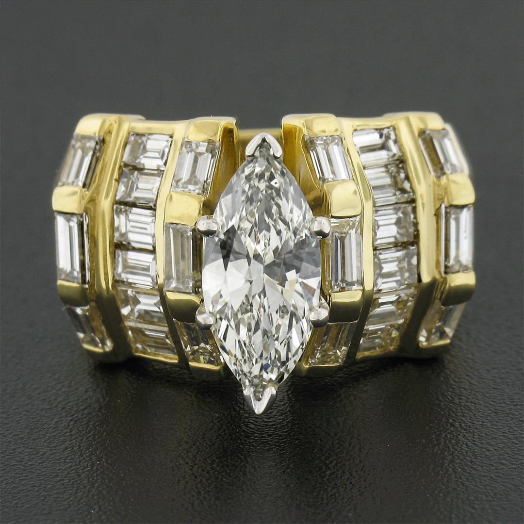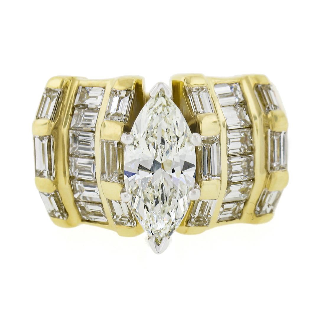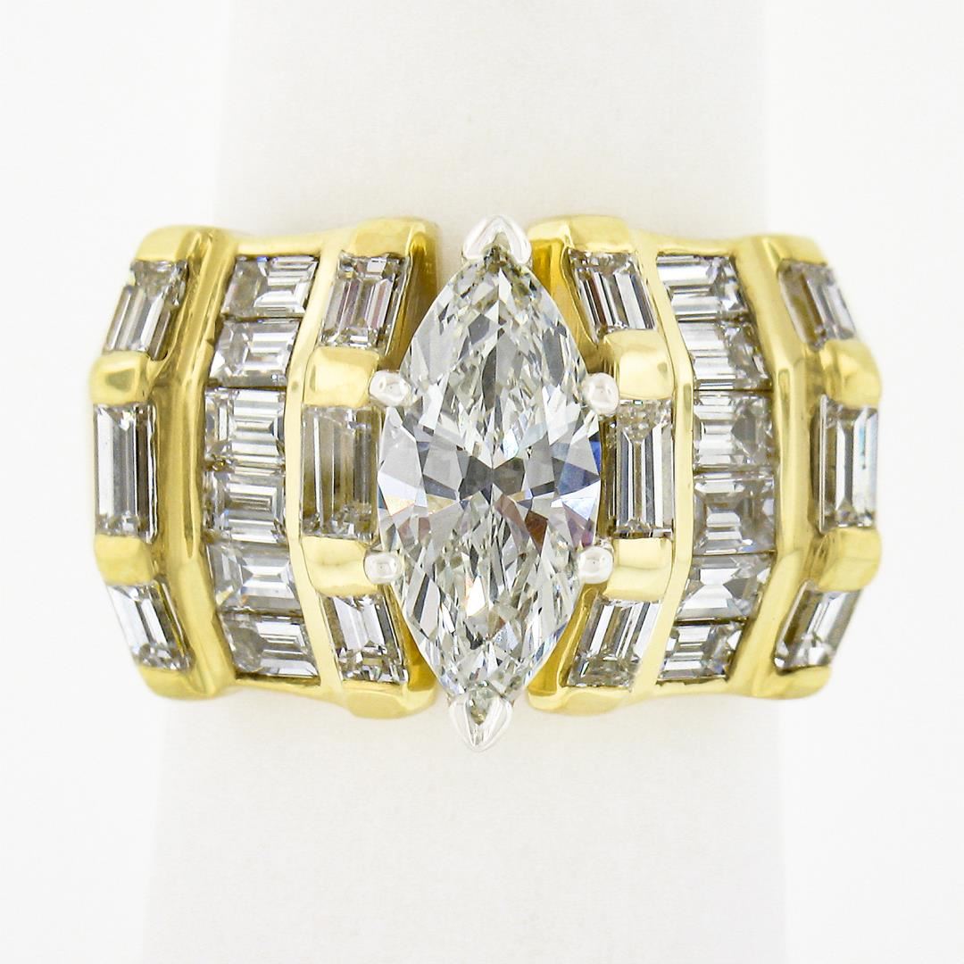 A solid 18k yellow gold ring with 1 GIA graded marquise cut natural diamond (M - VS2 ; 1.65ct), and 24 baguette cut natural diamonds (J/K - VS1-VS2 w/ a few SI1 ; 2.32+ctw). The ring is size 6.0, weighs a total of 19.39 grams, and measures 14.15mm wide. Comes with all original relevant certifications.