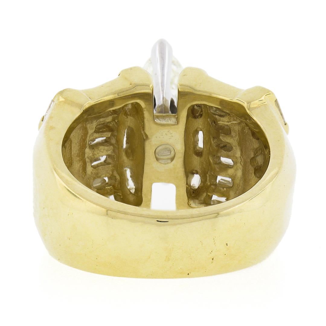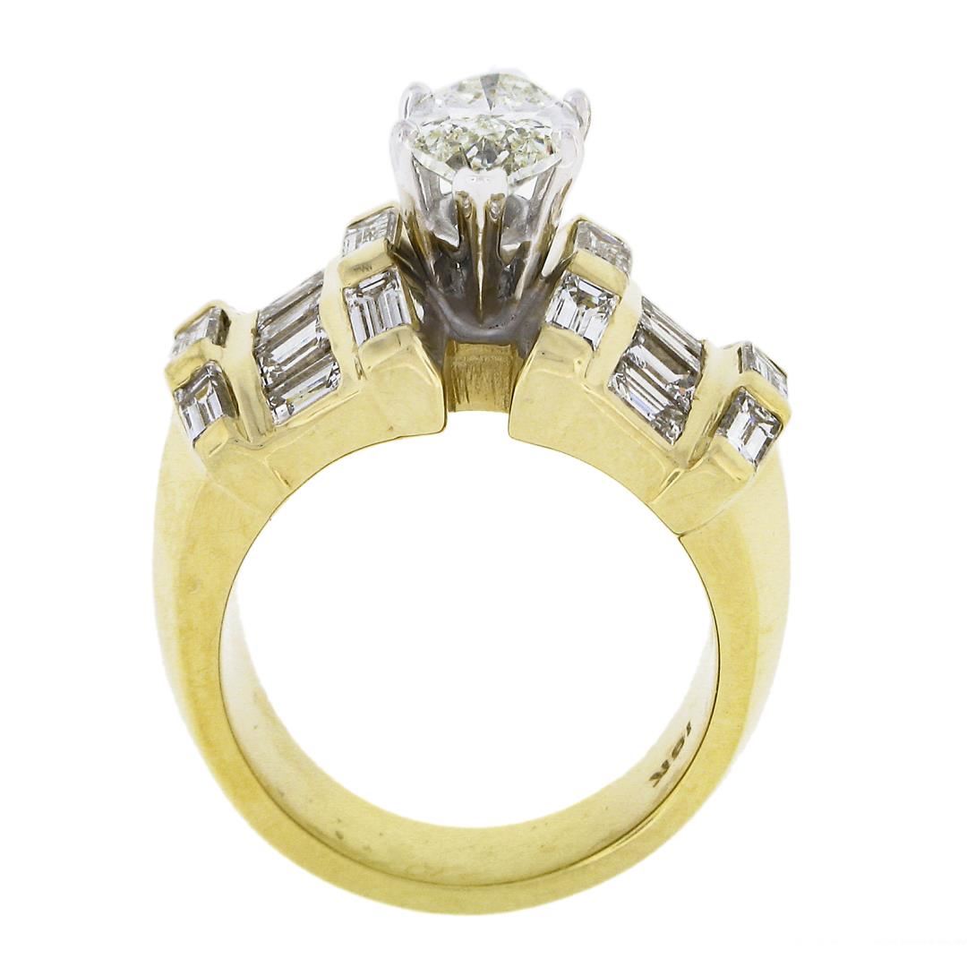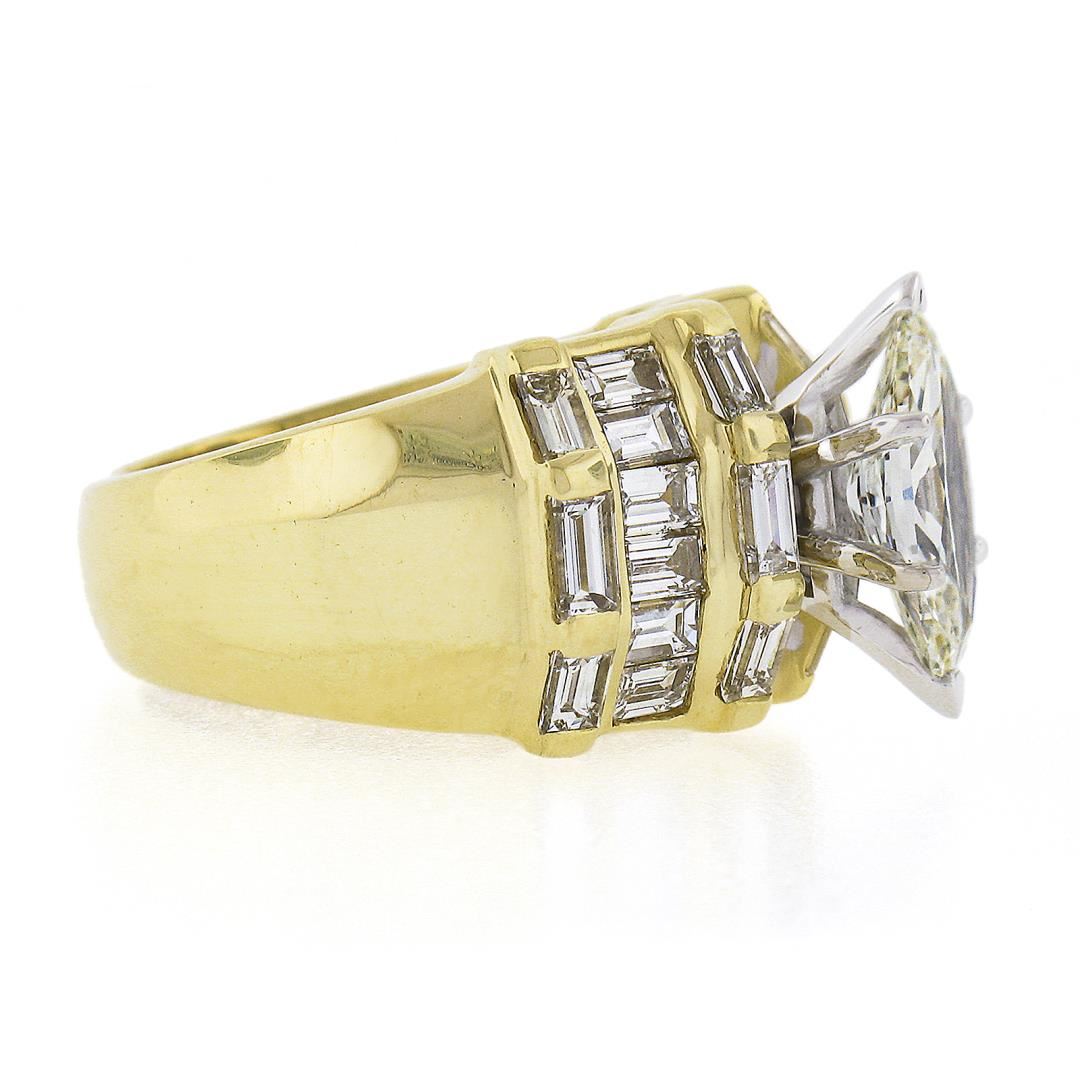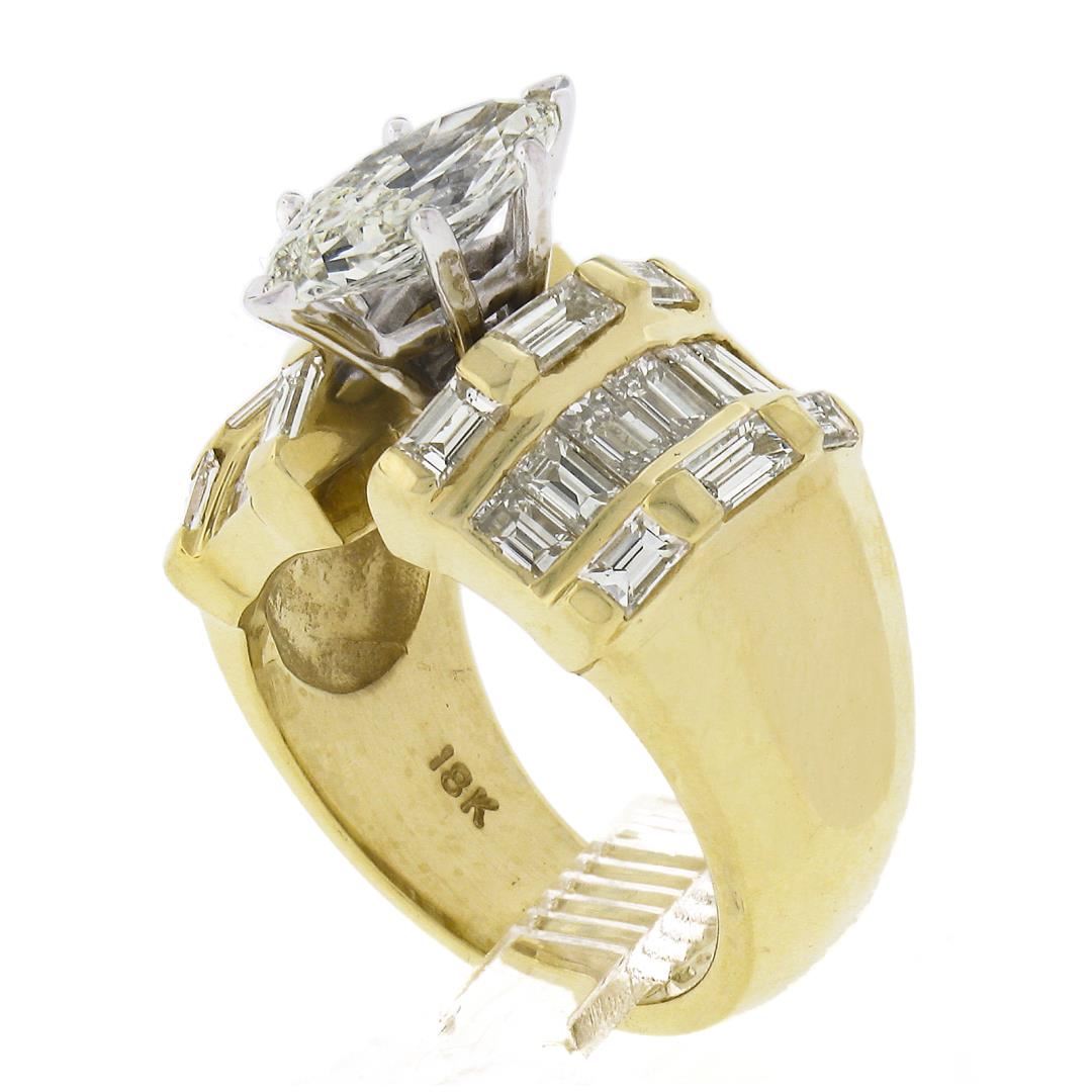 A solid 18k yellow gold ring with 1 GIA graded marquise cut natural diamond (M - VS2 ; 1.65ct), and 24 baguette cut natural diamonds (J/K - VS1-VS2 w/ a few SI1 ; 2.32+ctw). The ring is size 6.0, weighs a total of 19.39 grams, and measures 14.15mm wide. Comes with all original relevant certifications.