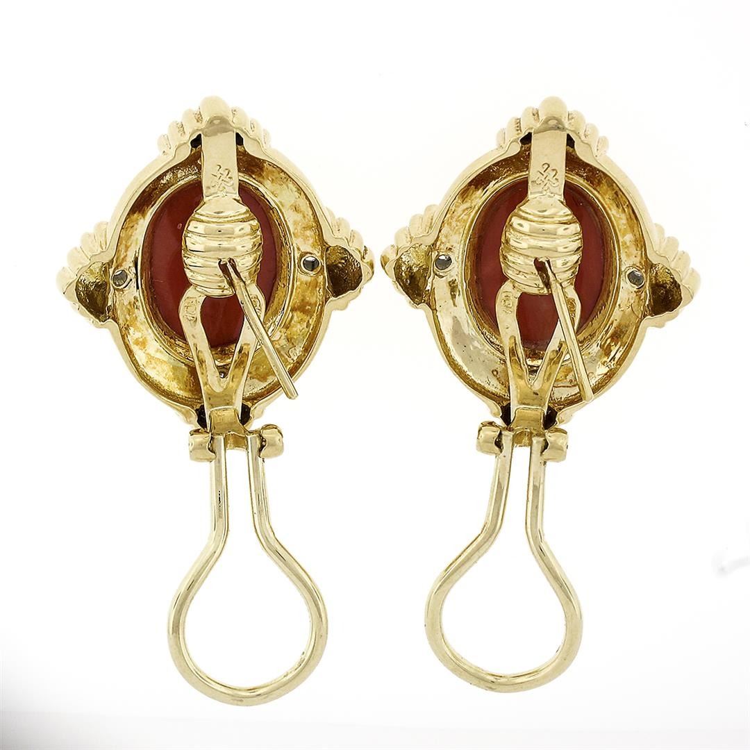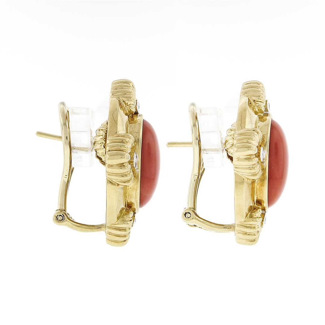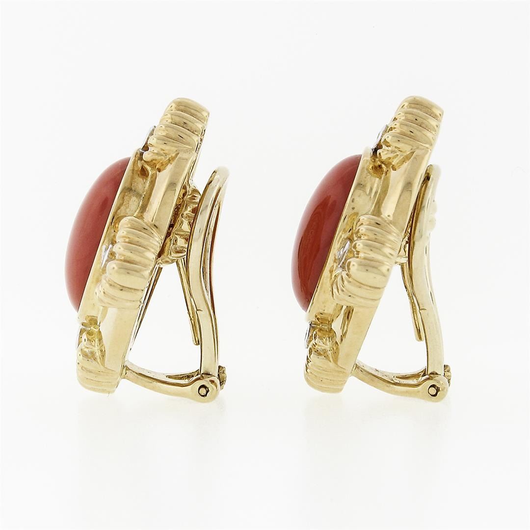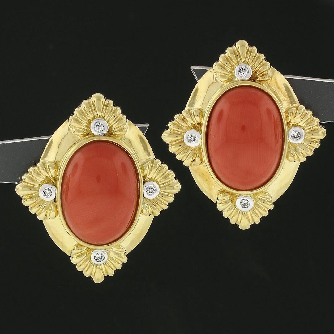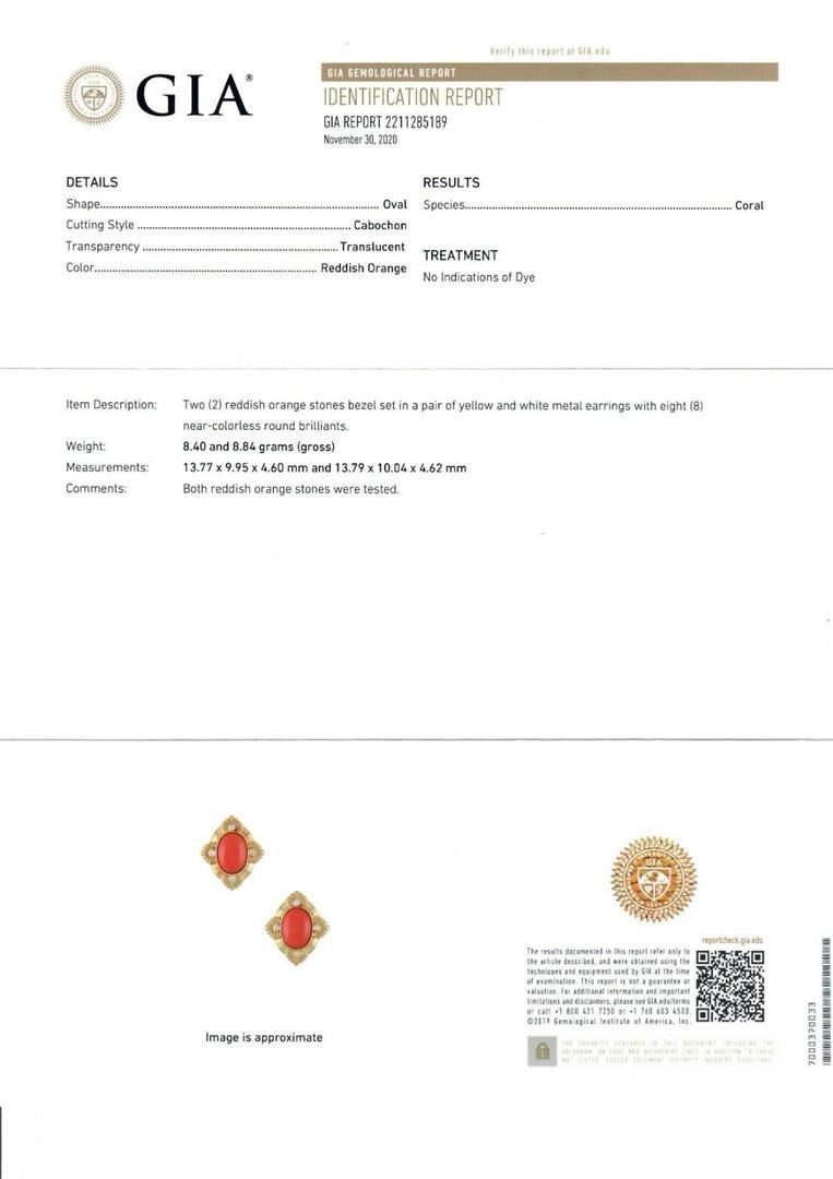 A solid 18k yellow gold clip on pair of earrings, with 2 Gia certified oval cabochon cut natural corals (13.77 x 9.95 x 4.60 mm and 13.79 x 10.04 x 4.62 mm), and 8 round brilliant cut natural diamonds (G- VS2; 0.12ctw). The earrings measure approximately 25.67x22.09mm and weigh a total of 17.24 grams. Comes with all original relevant certifications.