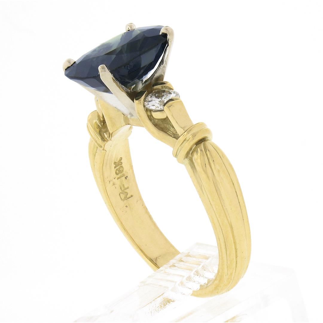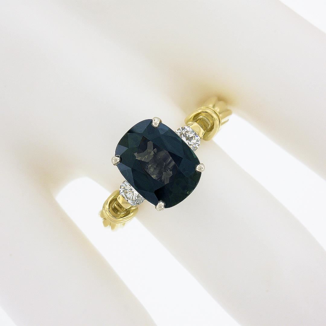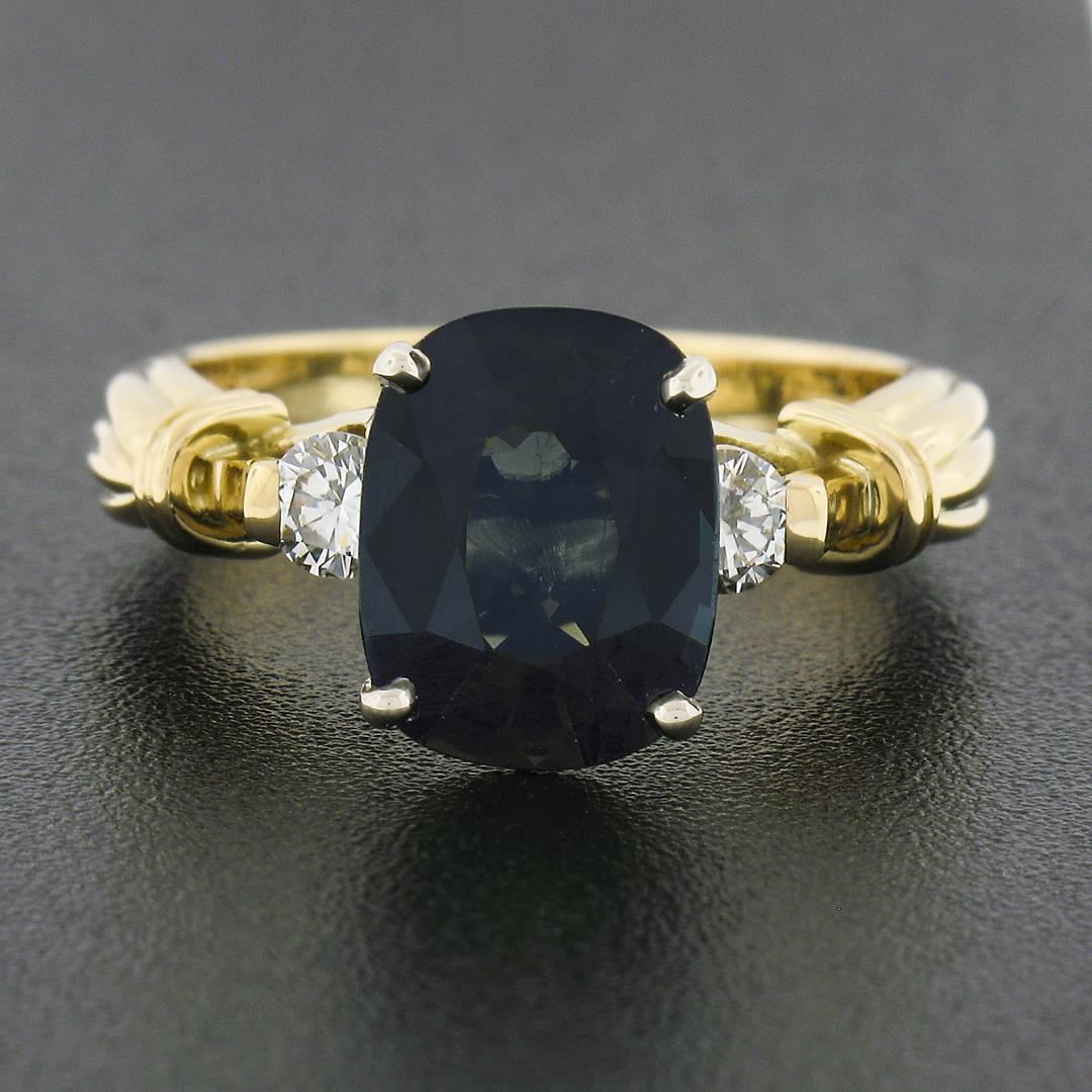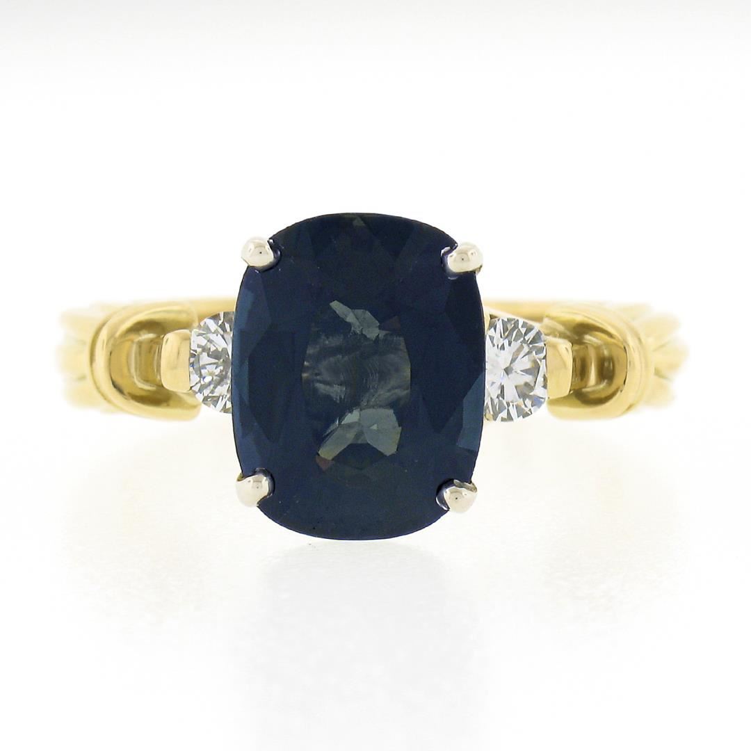 A solid 18k yellow gold ring, with 1 GIA graded cushion cut natural sapphire (3.40ct), with 2 round brilliant cut natural diamonds (F - VS1 ; 0.30ct). The ring is size 6.5, weighs a total of 6.63 grams, and measures 10.5mm wide. Comes with all original relevant certifications.