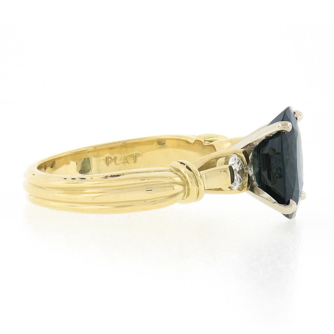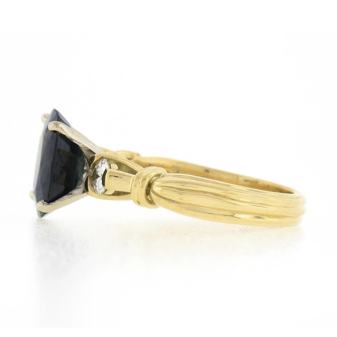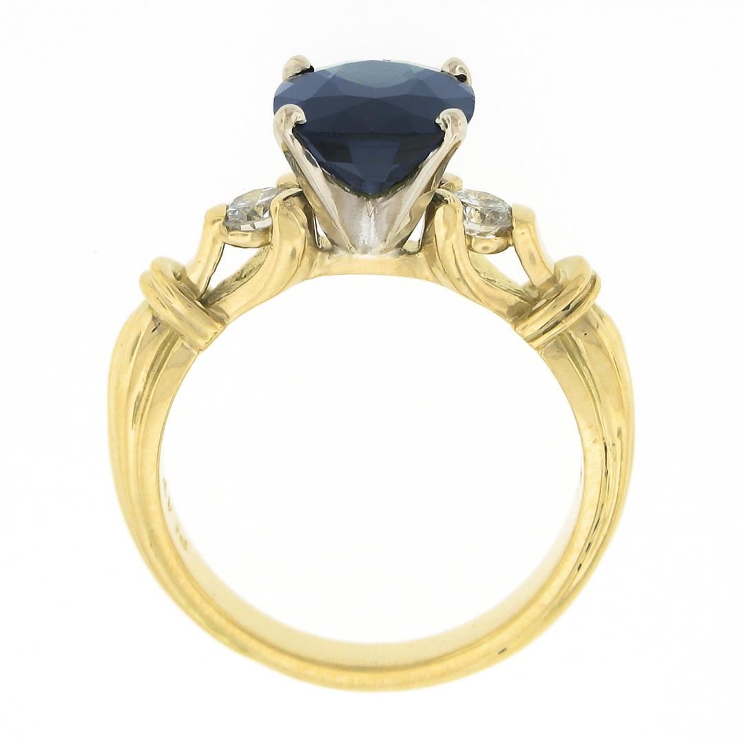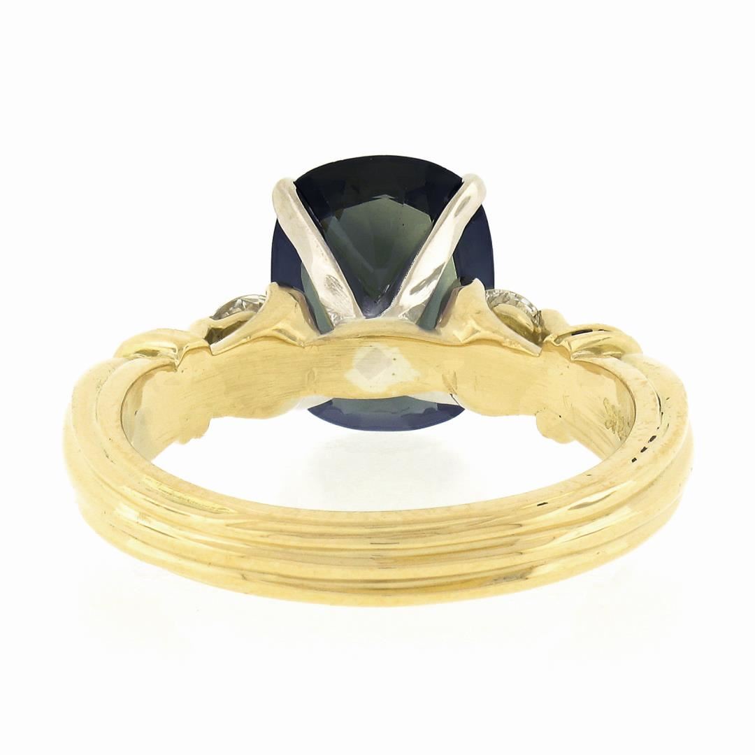 A solid 18k yellow gold ring, with 1 GIA graded cushion cut natural sapphire (3.40ct), with 2 round brilliant cut natural diamonds (F - VS1 ; 0.30ct). The ring is size 6.5, weighs a total of 6.63 grams, and measures 10.5mm wide. Comes with all original relevant certifications.