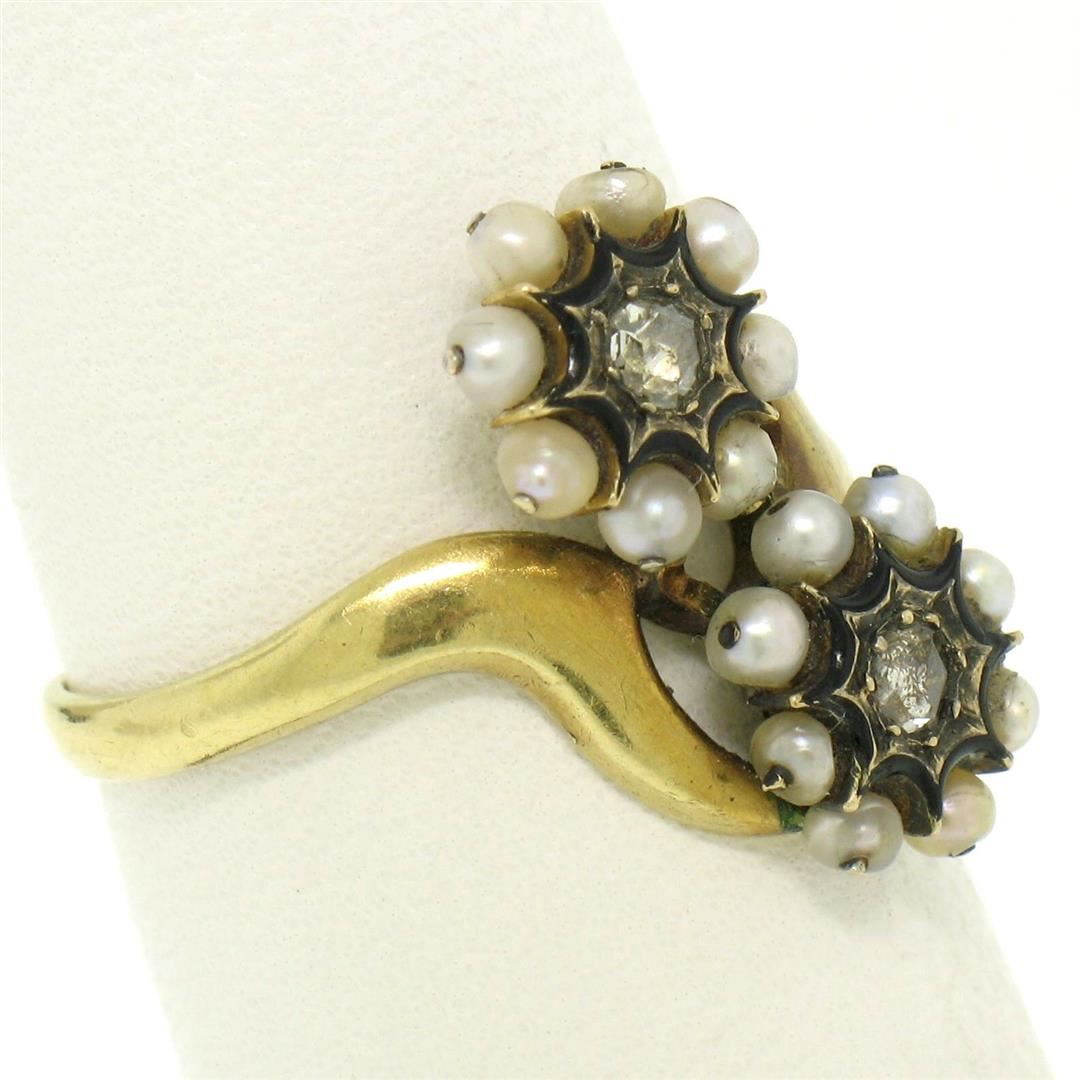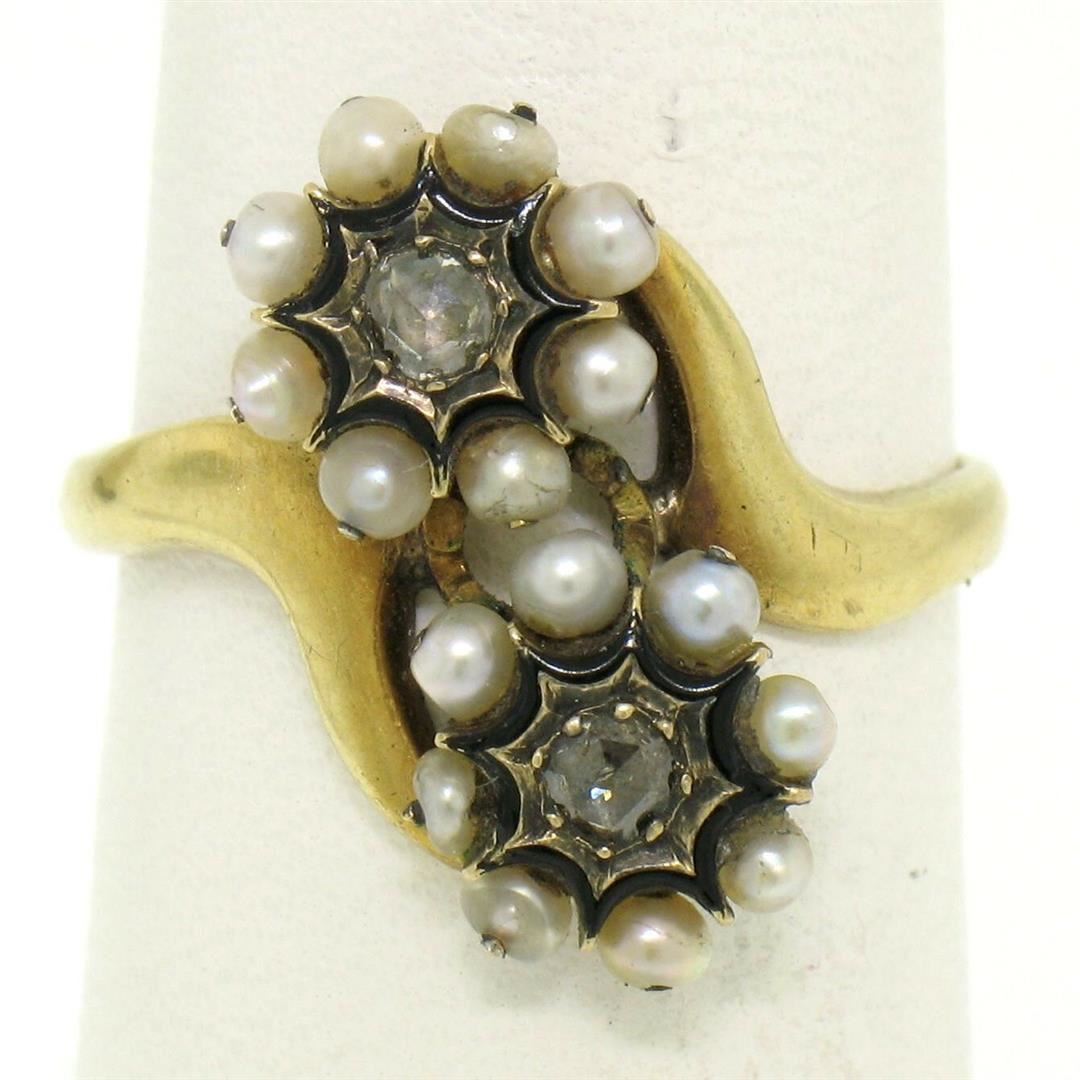 One 18k Gold French Victorian Antique 0.25ctw 2 Rose Diamonds Seed Pearl & Black Enamel Bypass Ring. Item Details: Material: 18K Solid Yellow Gold, Weight: 3.7 Grams, Stone(s): (2) Natural Genuine Diamonds - Rose Cut - Prong Set - 0.25ctw (approx.), (16) Natural Genuine Seed Pearls - Round Shape - Wire Set, Black Enamel Surrounds the Diamonds, Total Carat Weight: 0.25 (approx.), Ring Size: 6.0 (We can custom size this ring.), Ring Width: 16.5mm Ring Height: 4.2mm rise off the finger Condition: Antique ring, excellent condition for a rare piece like this.