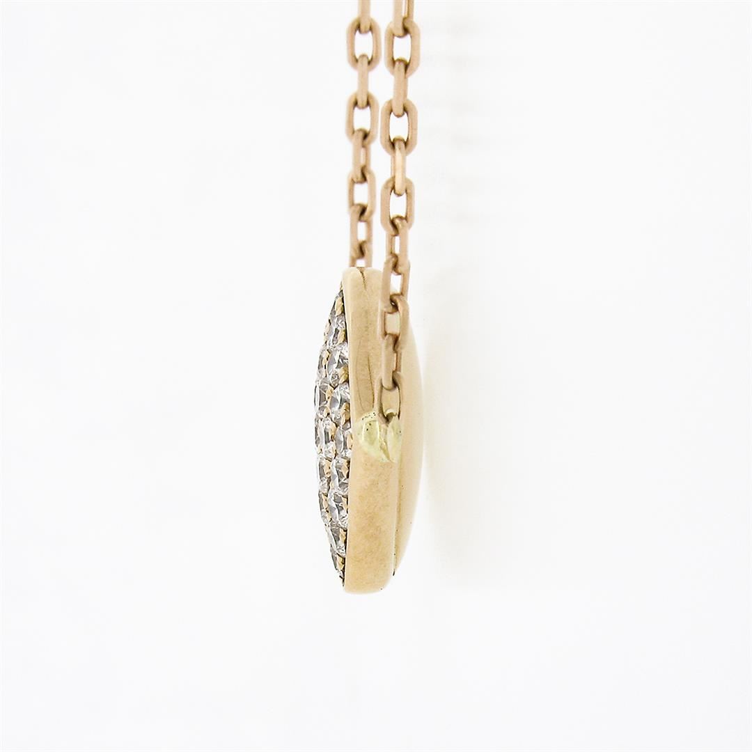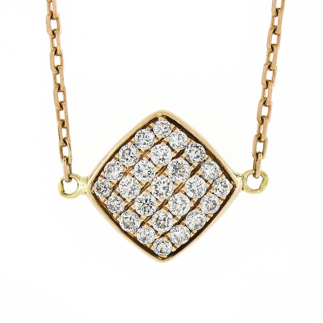 A solid 18k rose gold cushion pendant necklace, with 25 round brilliant cut natural diamonds (E/F - VS1/VS2 ; 0.60ctw). The pendant weighs a total of 4.69 grams, measures 11.80x12.30mm including the bail, and 16 inch cable link chain.