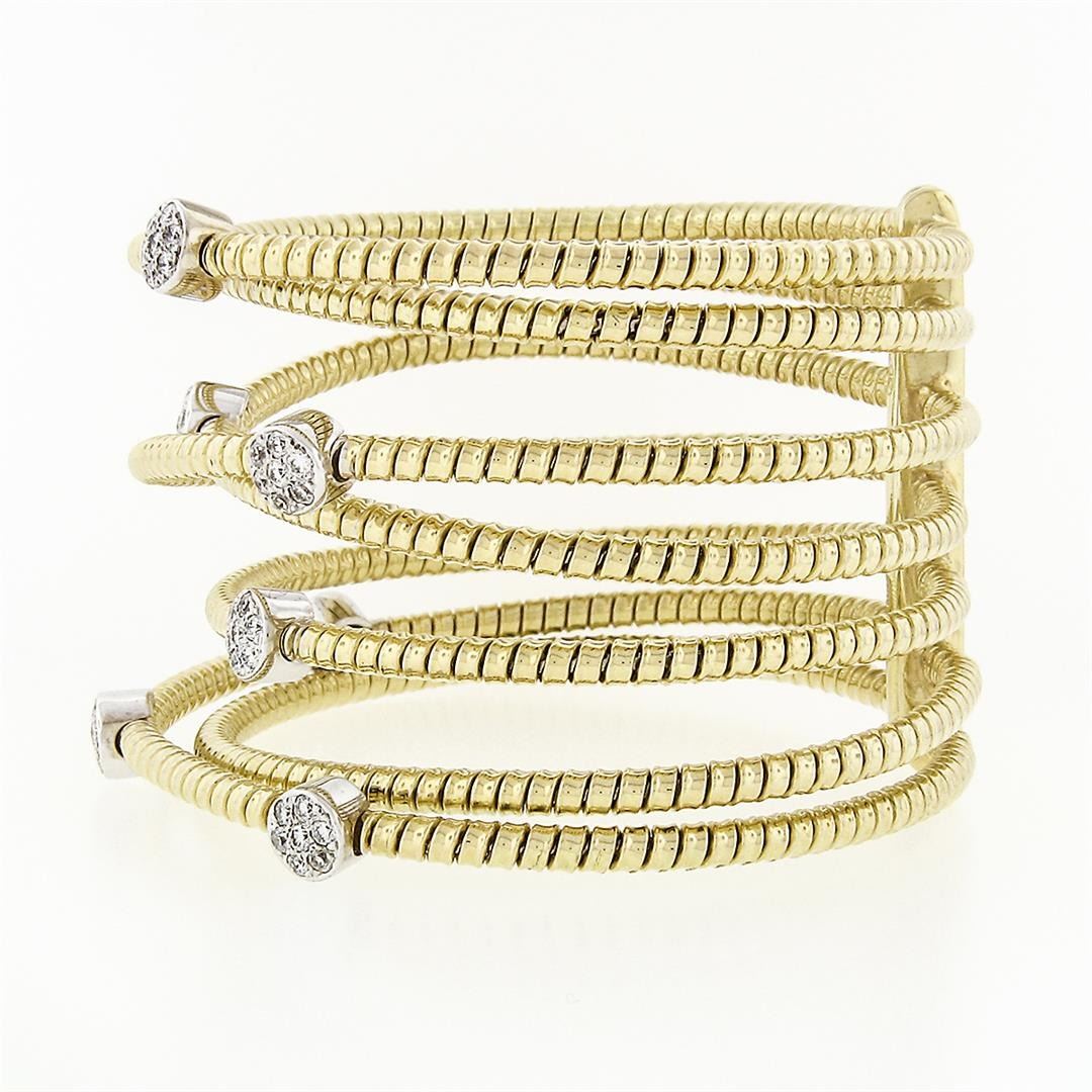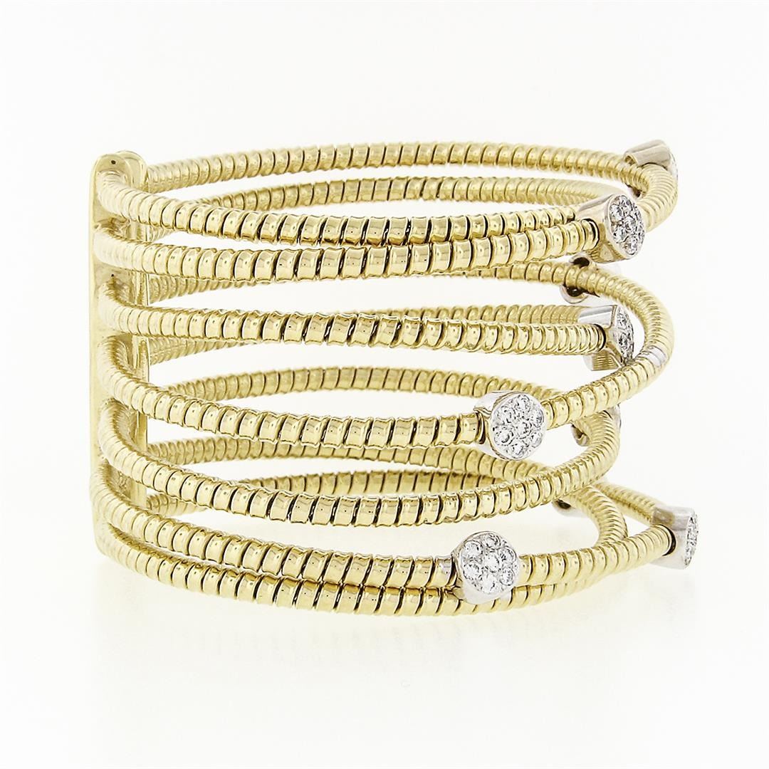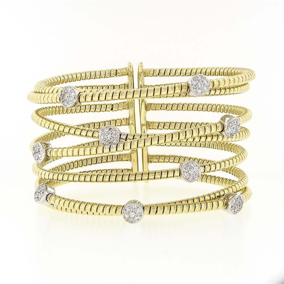A solid 18k yellow gold wide cuff flexible open bracelet, with 63 round brilliant cut natural diamonds (F/G- VS1/VS2; 1.35ctw). It weighs a total of 67.40 grams, measures 5.9mm wide, and measures 6 inches in length.