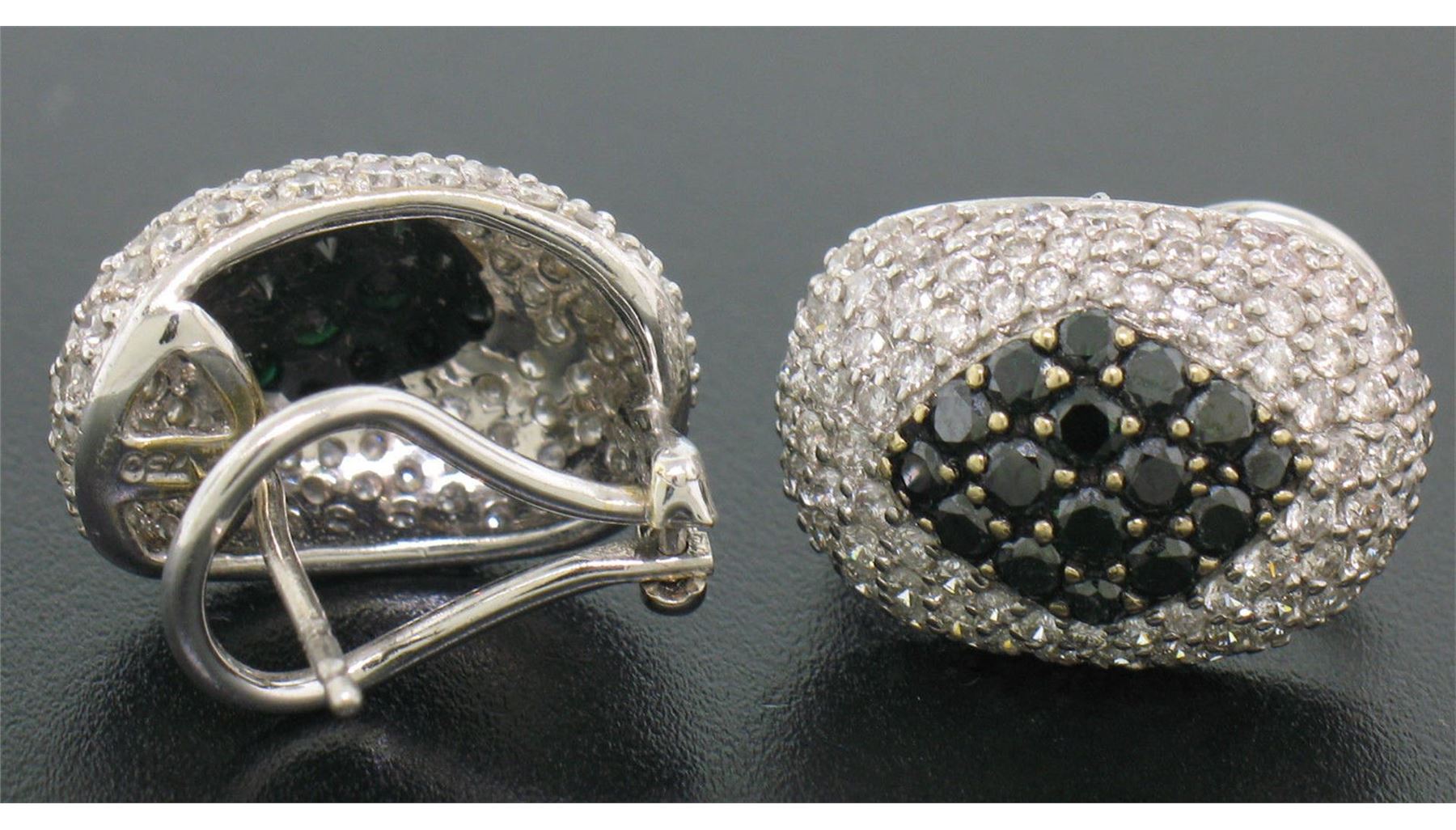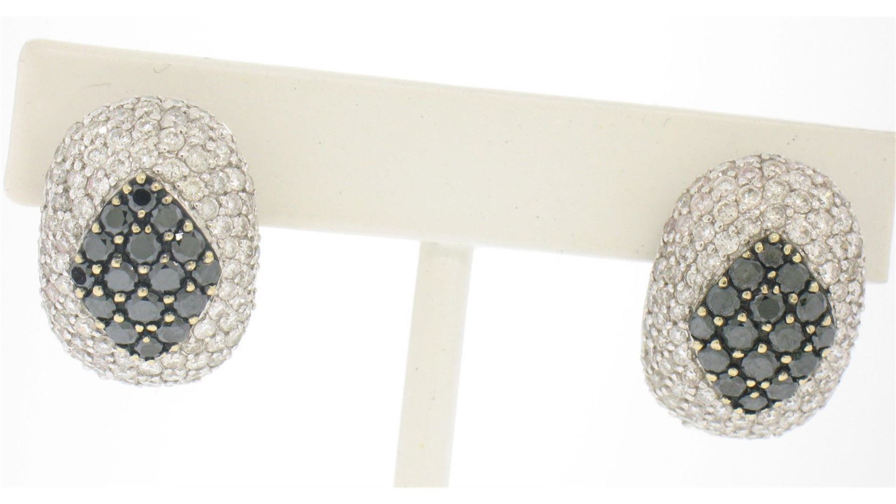 One 18k Solid White Gold 3.60ctw White and Black Diamond Dome Button Earrings. Item Details: Material: 18k Solid White Gold, Weight: 9.1 Grams, Stone(s): Natural Genuine Diamonds - Round Brilliant Cut - Pavé Set - VS2/SI1 Clarity - G/H Color - 3.60ctw, The entirety of the earrings are covered in white diamonds and the centers have a cluster natural black diamonds., Total Carat Weight: 3.60, Backing: Omega Backings (Pierced ears required., Width: 13mm, Height: 18mm, Condition: New w/o Tag