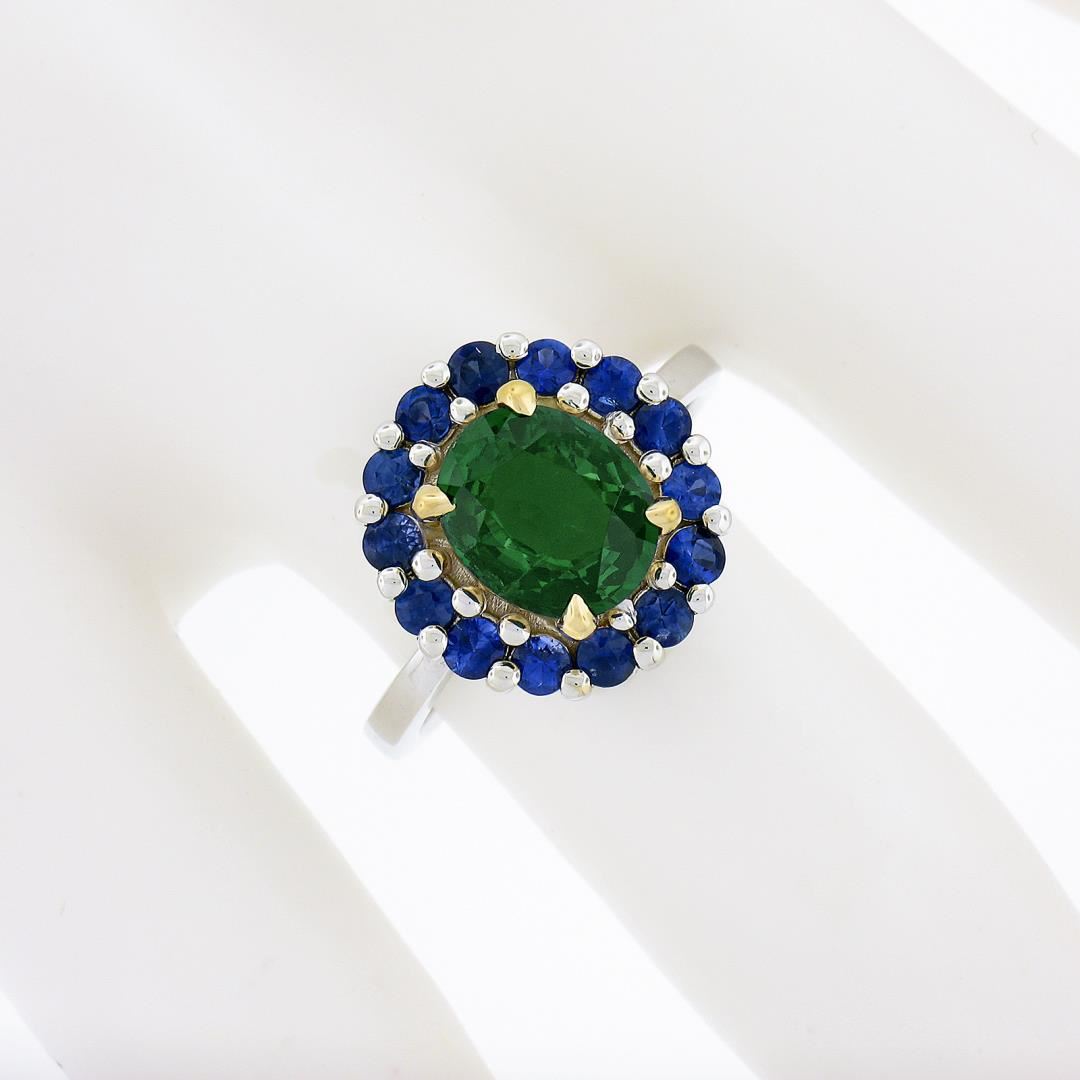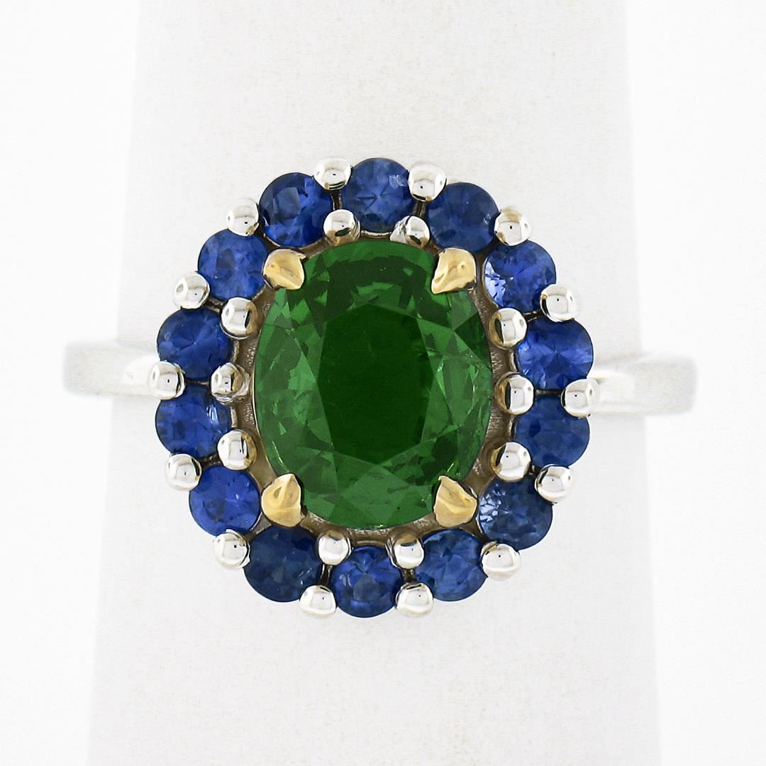 A solid 18k yellow & white gold ring, with 1 GIA graded oval cut natural tsavorite (2.03ct), surrounded with a halo of 14 round cut natural sapphires (0.80ctw). The ring is size 6.5, weighs a total of 5.36 grams, and measures 14mm wide. Comes with all original relevant certifications.