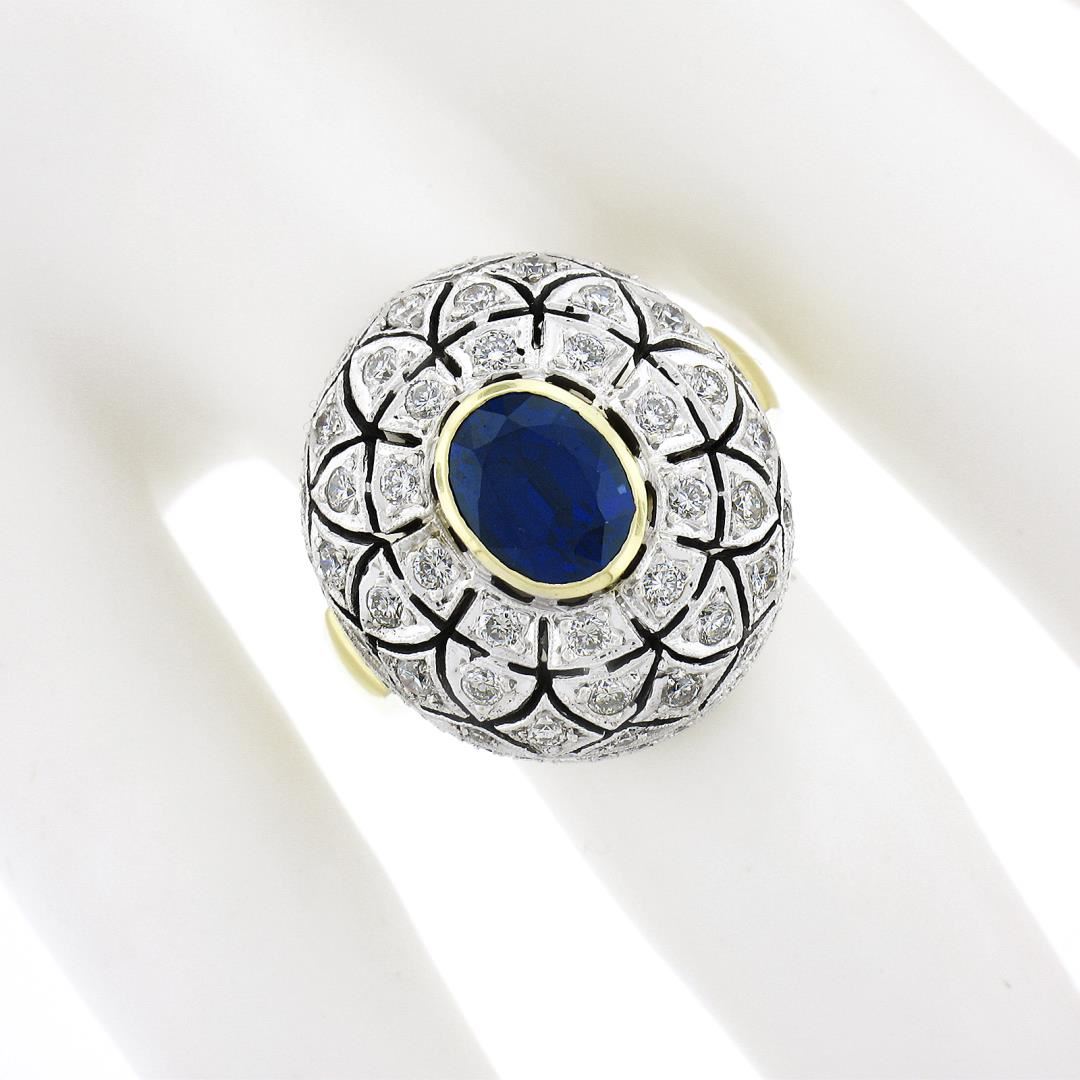 A solid 18k two tone cocktail ring, with 1 oval cut natural sapphire (7.9x6.3mm), and 86 round brilliant cut natural diamonds (F/G - VS1/VS2 ; 1.70ctw). The ring is size 6.5, weighs a total of 16.11 grams, and measures 20.70mm wide.