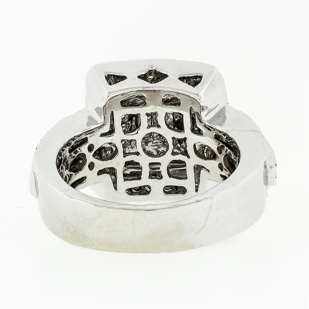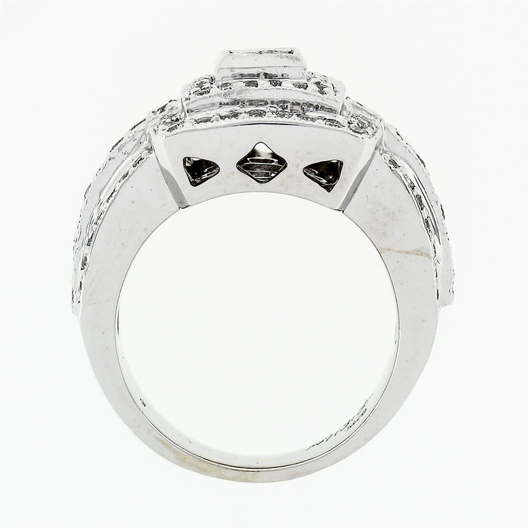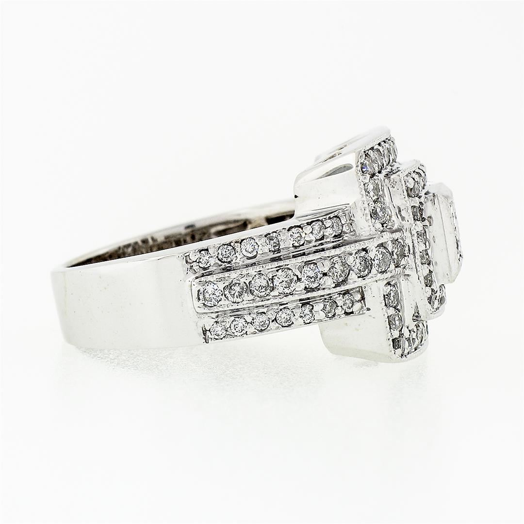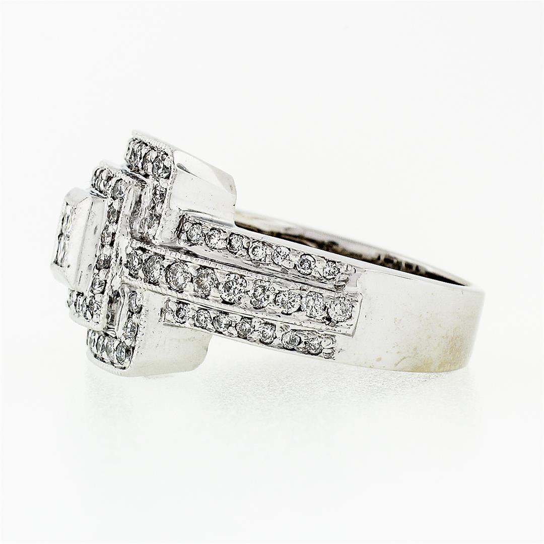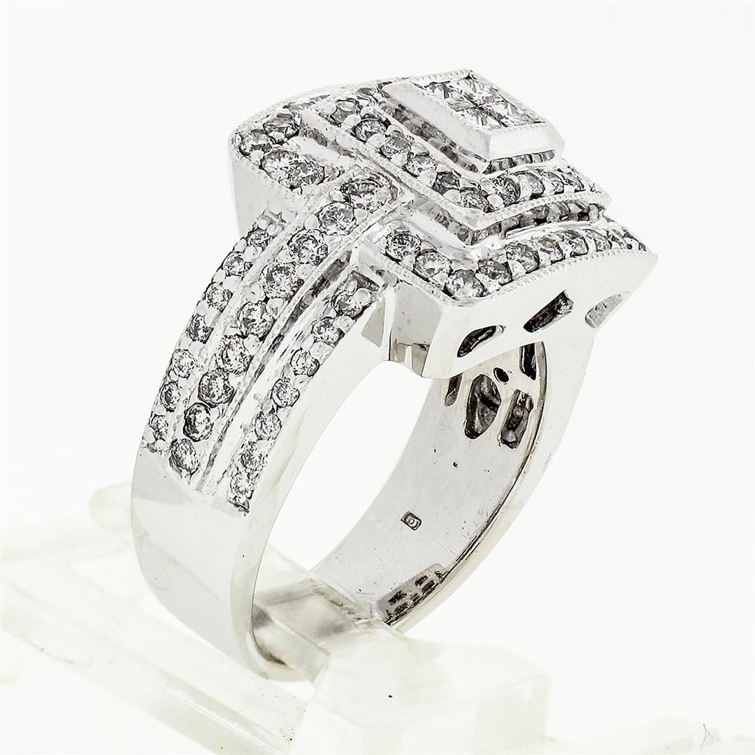 A solid 18k white gold tiered square cluster ring, with 4 square princess cut natural diamonds (G/H - VS2/SI1 ; 0.20ctw), and 90 round brilliant cut natural diamonds (G/H - SI1/SI2 ;1.00ctw). The ring is size 6.0, weighs a total of 13.26 grams, and measures 14.06mm wide.